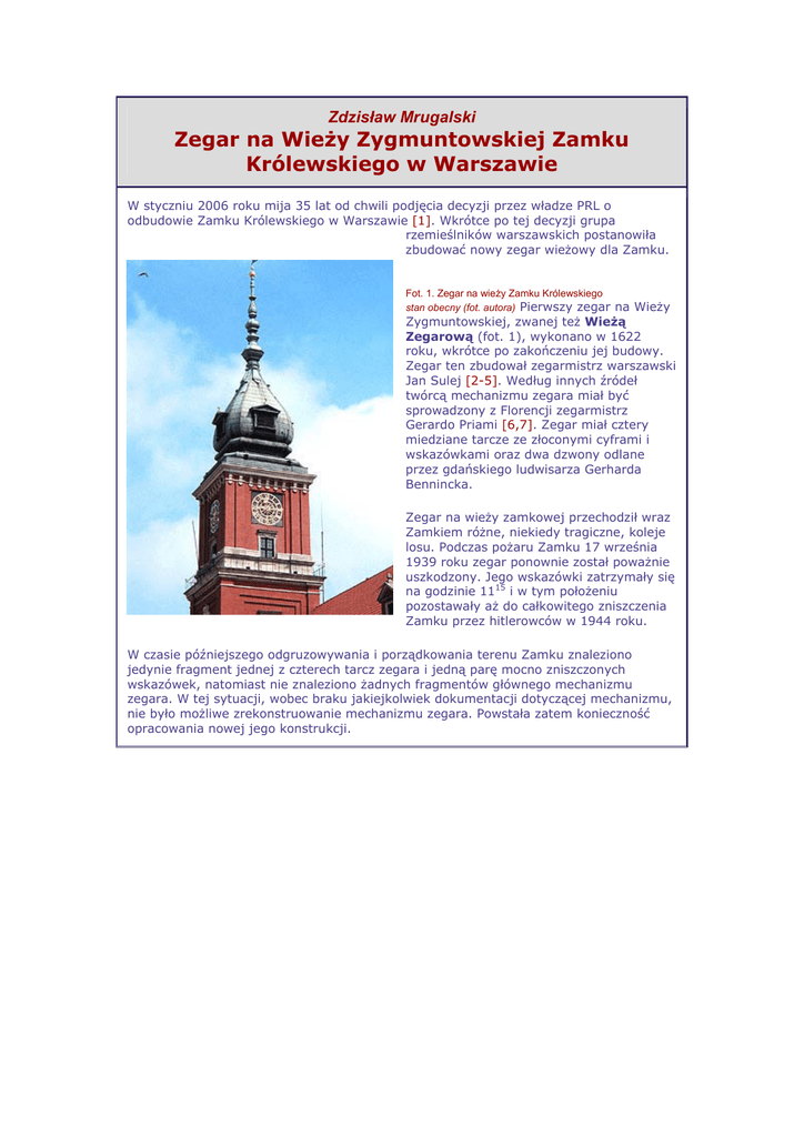 Zdzisław Mrugalski Zegar na Wieży Zygmuntowskiej Zamku Królewskiego w Warszawie W styczniu 2006 roku mija 35 lat od chwili podjęcia decyzji przez władze PRL o odbudowie Zamku Królewskiego w Warszawie [1]. Wkrótce po tej decyzji grupa rzemieślników warszawskich postanowiła zbudować nowy zegar wieżowy dla Zamku. Fot. 1. Zegar na wieży Zamku Królewskiego stan obecny (fot. autora) Pierwszy zegar na Wieży Zygmuntowskiej, zwanej też Wieżą Zegarową (fot. 1), wykonano w 1622 roku, wkrótce po zakończeniu jej budowy. Zegar ten zbudował zegarmistrz warszawski Jan Sulej [2-5]. Według innych źródeł twórcą mechanizmu zegara miał być sprowadzony z Florencji zegarmistrz Gerardo Priami [6,7]. Zegar miał cztery miedziane tarcze ze złoconymi cyframi i wskazówkami oraz dwa dzwony odlane przez gdańskiego ludwisarza Gerharda Bennincka. Zegar na wieży zamkowej przechodził wraz Zamkiem różne, niekiedy tragiczne, koleje losu. Podczas pożaru Zamku 17 września 1939 roku zegar ponownie został poważnie uszkodzony. Jego wskazówki zatrzymały się na godzinie 1115 i w tym położeniu pozostawały aż do całkowitego zniszczenia Zamku przez hitlerowców w 1944 roku. W czasie późniejszego odgruzowywania i porządkowania terenu Zamku znaleziono jedynie fragment jednej z czterech tarcz zegara i jedną parę mocno zniszczonych wskazówek, natomiast nie znaleziono żadnych fragmentów głównego mechanizmu zegara. W tej sytuacji, wobec braku jakiejkolwiek dokumentacji dotyczącej mechanizmu, nie było możliwe zrekonstruowanie mechanizmu zegara. Powstała zatem konieczność opracowania nowej jego konstrukcji. Zdzisław Mrugalski Zegar na Wieży Zygmuntowskiej Zamku Królewskiego w Warszawie Przebieg prac związanych z projektem i wykonaniem nowego zegara wieżowego dla odbudowywanego Zamku Fot. 2. Mechanizm zegara na wieży Zamku Królewskiego w Warszawie; z lewej strony zdjęcia widoczny jest mechanizm bicia kwadransów, w środku – mechanizm chodu wraz z wahadłem i widocznym u góry wychwytem Grahama, a z prawej strony – mechanizm bicia godzin; u dołu zdjęcia widać silnik podciągający co godzinę – zawieszone na łańcuchach – wszystkie trzy obciążniki napędowe (fot. autora) Odbudowy zegara wieżowego podjął się w czynie społecznym na początku 1972 roku zespół członków Cechu Złotników, Zegarmistrzów, Optyków Grawerów i Brązowników Miasta Stoł. Warszawy. Kierownikiem Zespołu Budowy Zegara został mistrz zegarmistrzowski Władysław Zaleski. W skład zespołu weszli również: absolwent Wydziału Mechaniki Precyzyjnej Politechniki Warszawskiej – mgr inż. Marek Górski oraz autor niniejszej pracy. Przed przystąpieniem do opracowania nowej konstrukcji zegara zastanawiano się, czy nie należy w odbudowywanym Zamku zastosować najnowszych rozwiązań konstrukcyjnych współczesnych zegarów wieżowych, np. zainstalować do napędu wskazówek czterech elektrycznych mechanizmów napędowych sterowanych przez elektroniczny zegar z rezonatorem kwarcowym. Po wielu gorących dyskusjach ostatecznie zdecydowano, że konstrukcja nowego zegara będzie oparta na tradycyjnej mechanicznej zasadzie działania, tzn. będzie on miał regulator wahadłowy i napęd obciążnikowy, a godziny i kwadranse będzie wybijał na dzwonach. Fot. 3. Wychwyt Grahama napędzający wahadło; zarówno kotwica jak i koło wychwytowe pokryte są warstwą złota (fot. autora) Dokumentację konstrukcyjną mechanizmu zegara opracował mgr inż. M. Górski – przy ścisłej współpracy z autorem tej informacji. W mechanizmie zegara (fot. 2) można wyodrębnić trzy główne zespoły: mechanizm chodu, mechanizm bicia kwadransów i mechanizm bicia godzin. Zespoły te umieszczone są w korpusie składającym się z dwóch płyt wykonanych jako odlewy staliwne. Wszystkie trzy mechanizmy: chodu, bicia kwadransów oraz bicia godzin mają napęd grawitacyjny (obciążnikowy), oddzielny dla każdego mechanizmu, jednak wszystkie trzy obciążniki napędowe są podciągane jednym silnikiem elektrycznym. Do napędu wahadła zastosowano wychwyt Grahama (fot. 3). Fot. 4. Schemat rozmieszczenia zespołów zegara w wieży zamkowej: 1 - mechanizm zegara, 2 - przekładnia z kołami stożkowymi, 3 - mechanizm rozrządowy rozdzielający napęd czterech par wskazówek, 4 - przekładnie wskazówkowe (12:1), 5 - obciążniki napędowe, 6 i 7 - dzwony do wybijania kwadransów i godzin, 8 - tarcza zegarowa, 9 i 10 - wskazówki: minutowa i godzinowa. Na mechanizm zegara przeznaczono najwyższe w murowanej części wieży pomieszczenie, którego posadzka jest położona nieco powyżej środków tarcz zegarowych (fot. 4). Mechanizm ustawiony jest nad otworem w podłodze umożliwiającym opuszczanie się obciążników napędowych do sąsiedniego, niższego pomieszczenia, gdzie zainstalowano też mechanizm rozrządowy do napędu czterech przekładni wskazówkowych przy tarczach. Posadzka tego dolnego pomieszczenia znajduje się mniej więcej na wysokości dolnych krawędzi tarcz zegarowych. Zegar zajmuje więc w wieży dwa pomieszczenia o powierzchni około 5 x 5 m i łącznej wysokości również ok. 5 metrów. Dokumentację wystroju zewnętrznego (tarcz i wskazówek) zegara, wiernie odtwarzającą jego dawny wygląd na podstawie ocalałych elementów oraz przedwojennych zdjęć fotograficznych, jak również zachowanych materiałów inwentaryzacyjnych, opracował zespół pracowników Politechniki Warszawskiej pod kierunkiem prof. inż. arch. Stanisława Marzyńskiego. Na podstawie tej dokumentacji kilku członków Zespołu Budowy Zegara przystąpiło do wykonania elementów czterech tarcz i czterech par wskazówek. Kwadratowe tarcze, których boki mają długość 282 cm, wykonane są z kilkunastu arkuszy blachy miedzianej połączonych z sobą i zamocowanych na szkieletach ze stali nierdzewnej. Cyfry i rozetki dekoracyjne oraz obramowujące je okręgi wykonane są również z miedzi i pokryte warstwą 