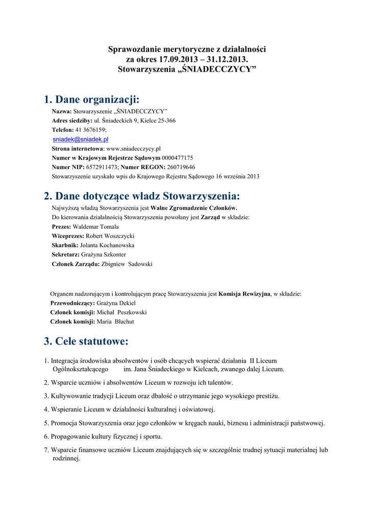 Sprawozdanie merytoryczne z działalności za okres 17.09.2013 – 31.12.2013. Stowarzyszenia „ŚNIADECCZYCY” 1. Dane organizacji: Nazwa: Stowarzyszenie „ŚNIADECCZYCY” Adres siedziby: ul. Śniadeckich 9, Kielce 25-366 Telefon: 41 3676159; [email protected] Strona internetowa: www.sniadecczycy.pl Numer w Krajowym Rejestrze Sądowym 0000477175 Numer NIP: 6572911473; Numer REGON: 260719646 Stowarzyszenie uzyskało wpis do Krajowego Rejestru Sądowego 16 września 2013 2. Dane dotyczące władz Stowarzyszenia: Najwyższą władzą Stowarzyszenia jest Walne Zgromadzenie Członków. Do kierowania działalnością Stowarzyszenia powołany jest Zarząd w składzie: Prezes: Waldemar Tomala Wiceprezes: Robert Woszczycki Skarbnik: Jolanta Kochanowska Sekretarz: Grażyna Szkonter Członek Zarządu: Zbigniew Sadowski Organem nadzorującym i kontrolującym pracę Stowarzyszenia jest Komisja Rewizyjna, w składzie: Przewodniczący: Grażyna Dekiel Członek komisji: Michał Peszkowski Członek komisji: Maria Błachut 3. Cele statutowe: 1. Integracja środowiska absolwentów i osób chcących wspierać działania II Liceum Ogólnokształcącego im. Jana Śniadeckiego w Kielcach, zwanego dalej Liceum. 2. Wsparcie uczniów i absolwentów Liceum w rozwoju ich talentów. 3. Kultywowanie tradycji Liceum oraz dbałość o utrzymanie jego wysokiego prestiżu. 4. Wspieranie Liceum w działalności kulturalnej i oświatowej. 5. Promocja Stowarzyszenia oraz jego członków w kręgach nauki, biznesu i administracji państwowej. 6. Propagowanie kultury fizycznej i sportu. 7. Wsparcie finansowe uczniów Liceum znajdujących się w szczególnie trudnej sytuacji materialnej lub rodzinnej. Stowarzyszenie może realizować swoje cele poprzez: 1. Organizowanie zjazdów absolwentów, konferencji, seminariów, sympozjów, szkoleń oraz spotkań z przedstawicielami świata nauki, biznesu oraz urzędnikami administracji państwowej, a także organizowanie innych wydarzeń mających na celu rozwój członków Stowarzyszenia. 2. Organizowanie wydarzeń o charakterze sportowym, kulturalnym, rozrywkowym, dobroczynnym i innym, wspierających rozwój kontaktów towarzyskich członków Stowarzyszenia. 3. Współpracę z osobami fizycznymi i prawnymi prowadzącymi działalność gospodarczą. 4. Współpracę z instytucjami naukowymi, innymi stowarzyszeniami oraz organami administracji państwowej. 4. Wykaz działań, które podjęto w 2013 r. celem realizacji zadań statutowych: 1. Organizacja obchodów jubileuszu 110-lecia Drugiego Liceum Ogólnokształcącego im. Jana Śniadeckiego w Kielcach. Komitet organizacyjny obchodów jubileuszu zwrócił się do stowarzyszenia z prośbą o współpracę przy realizacji oficjalnych uroczystości szkolnego jubileuszu 110-lecia II LO w Kielcach. Stowarzyszenie podjęło działania zmierzające do pozyskiwania środków finansowych na pokrycie kosztów organizacji obchodów jubileuszu szkoły. Dzięki wpłatom darczyńców udało się pozyskać pieniądze, za które zakupiono dla celów organizacji jubileuszu: zaproszenia dla gości, identyfikatory dla osób z obsługi imprezy, banery reklamowe, wielkoformatowe zdjęcia, antyramy z pleksi, pocztówki, papier zwykły i ozdobny, opaski identyfikacyjne na rękę, plakaty informacyjne, gadgety reklamowe, kwiaty ozdobne do udekorowania Sali gimnastycznej, artykuły spożywcze jako przekąski. Opłacono też nagłośnienie sali gimnastycznej w części oficjalnej obchodów jubileuszu. 2. Impreza integracyjna „Bal absolwenta” W dniu 11 listopada 2013 członkowie naszego Stowarzyszenia, liczni absolwenci II Liceum Ogólnokształcącego oraz osoby zaprzyjaźnione ze szkołą wzięły udział w wieczorowym balu – łącznie w balu uczestniczyło 410 osób. Wynajęcie Sali w Best Western Grand Hotel oraz organizacja balu kosztowało 36 900 zł 3. Akcja charytatywna Choinka pod choinkę. Nasze Stowarzyszenie wzięło udział w akcji charytatywnej Choinka pod choinkę. Członkowie zarządu wzięli udział w promocji aukcji świątecznego drzewka wykonanego przez uczniów i nauczycieli szkoły. Na zaproszenie Polskiego Radia Kielce uczestniczyliśmy w audycji promującej akcję zbierania pieniędzy między innymi dla uczniów naszego liceum. Polskie Radio Kielce wylicytowało drzewko ze Śniadka za 3600,11 złotych. Pieniądze uzyskane ze sprzedaży świątecznych drzewek i ozdób zostaną przeznaczone na stypendia dla uzdolnionej świętokrzyskiej młodzieży. Drzewko na licytację przygotowali uczniowie i nauczyciele II LO im. J. Śniadeckiego. Składnikami choinki są tylko i wyłącznie naturalne elementy, takie jak: szyszki, żołędzie, orzechy. Gwiazdka wykonana jest z kory brzozy, suszonej pomarańczy i makaronu. Choinka kolorami nawiązuje do barw natury oraz tych, które kojarzą się nam ze świętami Bożego Narodzenia. Impreza miała na celu: - pozyskanie środków pieniężnych na stypendia dla uczniów; - aktywizowanie uczniów do twórczej pracy; - aktywizowanie środowiska śniadecczyków (uczniów, absolwentów i przyjaciół II LO w Kielcach) - promocję II Liceum w mieście i regionie. 4. Założenie strony internetowej www.sniadecczycy.pl. W celu promocji stowarzyszenia w nowoczesnych mediach podpisano umowę o rezerwacji domeny i wykupu zasobów na jednym z komercyjnych serwerów www. Jeden z członków stowarzyszenia wykonał nieodpłatnie stronę www. Na stronie internetowej Stowarzyszenia znajdują się artykuły upowszechniające wiedzę o stowarzyszeniu. Można tam znaleźć także wszystkie informacje dotyczące Stowarzyszenia oraz aktualności z jego działalności. Treść merytoryczna wzbogacona jest galeriami zdjęć naszych podopiecznych, które wykonane zostały podczas imprez okolicznościowych a także podczas zajęć. Na stronie znajdują się również ważne informacje dotyczące działań stowarzyszenia. 5. Promocja stowarzyszenia Stowarzyszenie rozpoczęło akcję, mającą na celu pozyskanie nowych cz