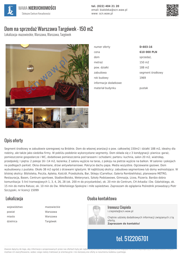 tel. (022) 404 21 20 email: [email protected] www: scn.waw.pl Dom na sprzedaż Warszawa Targówek - 150 m2 Lokalizacja: mazowieckie, Warszawa, Warszawa, Targówek numer oferty D-603-16 cena 610 000 PLN dom sprzedaż, metraż 150 m2 pow. działki 188 m2 zabudowa segment środkowy rok budowy 1969 informacje dodatkowe materiał budynku pustak Opis oferty Segment środkowy w zabudowie szeregowej na Bródnie. Dom do własnej aranżacji o pow. całkowitej 150m2 i działki 188 m2, idealny dla rodziny, ale także jako siedziba firmy. W pobliżu podobnie wykorzystane segmenty. Dom składa się z 3 kondygnacji: piwnica: garaż, pomieszczenie gospodarcze i WC, dodatkowe pomieszczenia pod tarasem i schodami; parteru: kuchnia, salon 20 m2, wiatrołap, przedpokój; I piętra: 2 pokoje 16 i 14 m2, łazienka; Z salonu wyjście na taras, z pokoju na pietrze wyjście na balkon. W salonie i pokojach na podłogach parkiet. Okna drewniane, drzwi antywłamaniowe. Pokrycie dachu papa. Media wszystkie. Ogrzewanie gazowe. Dom wybudowany z pustaka. Około 38 m2 ogród z drzewami iglastymi. W najbliższej okolicy: zabudowa segmentowa lub domy wolnostojące. W bliskiej okolicy: Biblioteka, Poczta, Apteka, Kościół, Przedszkola, Bar, Sklepy (Carrefour, Galeria Rembielińska), planowane METRO, Restauracja, Basen, Centrum sportowe, Stadion/Boisko, Weterynarz, Szkoły Podstawowe, Gimnazja, Licea, Pizzeria. Bardzo dobra komunikacja: 5 linii tramwajowych 1, 3, 4, 26, 28 (ok. 200 m do przystanków), ok. 20 min do Centrum, CH Arkadia i Dw. Gdańskiego, ok. 15 min do metra Ratusz, ok. 10 min do Dw. Wileńskiego Spokojne i miłe sąsiedztwo. Zapraszam do oglądania Pośrednik prowadzący Piotr Szczypski, nr licencji 15099 Lokalizacja Osoba kontaktowa Ireneusz Ciepiela województwo mazowieckie powiat Warszawa [email protected] miasto Warszawa dzielnica Targówek Chętnie udzielę dodatkowych informacji związanych z tą ofertą. Zapraszam do kontaktu! tel. 512206701 Zawsze dążymy do tego, aby informacje o proponowanych przez nas ofertach były jak najbardziej dokładne. Niekiedy jednak, ze względu na fakt, iż uzyskujemy je od osób trzecich nie jest możliwe ich zweryfikowanie, wobec czego należy traktować je orientacyjnie i nie stanowią one oferty w rozumieniu kodeksu cywilnego.