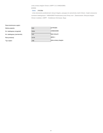 Linka zmiany biegów Citroen JUMPY 2.0 (1496242080) [04083] Cena: 210,00zł Linka sterowania przełożeniami skrzyni biegów, pasująca do samochodu marki Citroen. Część oznaczona numerem katalogowym: 1496242080 Produkowana przez firmę Linor . Zastosowanie: Skrzynia biegów Citroen model(e): JUMPY . Dodatkowe informacje: długa. Dane techniczne części: Marka pojazdu: 300 CITROEN Nr. katalogowy (oryginał): 3524 1496242080 Nr. katalogowy (zamiennik): 167 brak danych Rok produkcji: 3418 2003-> Typ części: 168 linka zmiany biegów 1/1