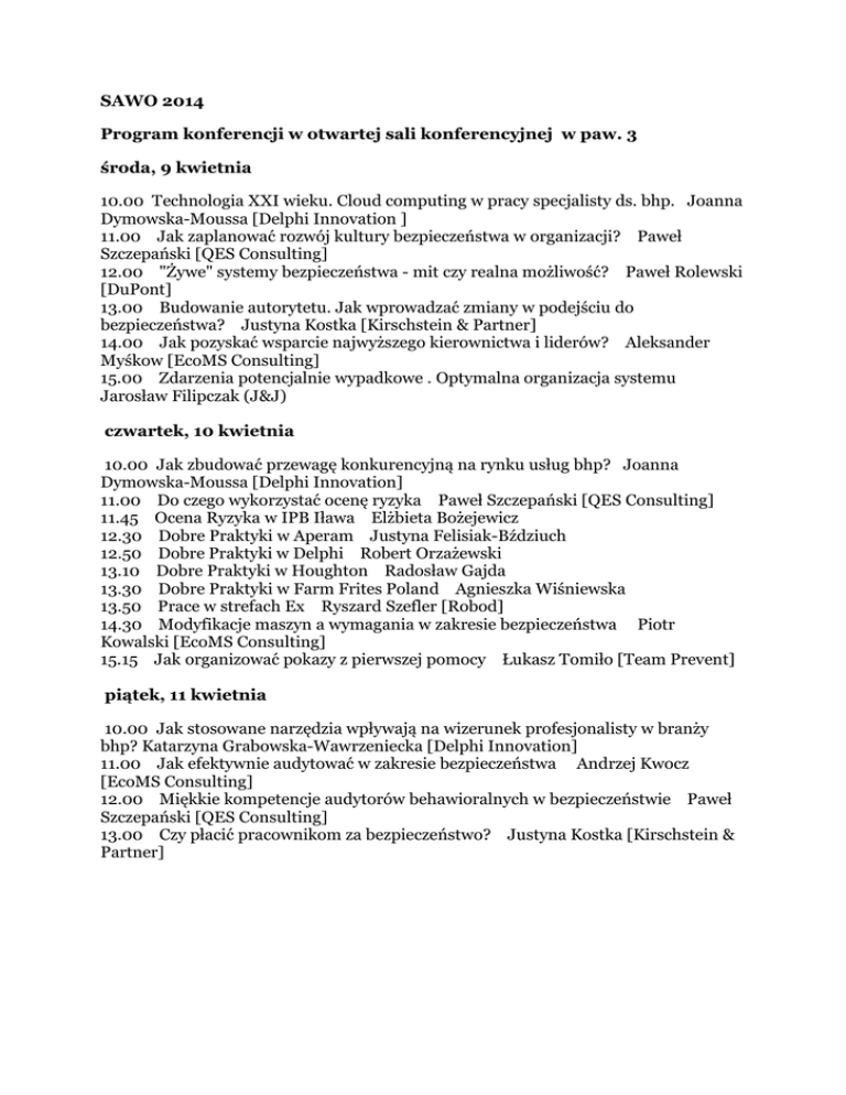 SAWO 2014 Program konferencji w otwartej sali konferencyjnej w paw. 3 środa, 9 kwietnia 10.00 Technologia XXI wieku. Cloud computing w pracy specjalisty ds. bhp. Joanna Dymowska-Moussa [Delphi Innovation ] 11.00 Jak zaplanować rozwój kultury bezpieczeństwa w organizacji? Paweł Szczepański [QES Consulting] 12.00 "Żywe" systemy bezpieczeństwa - mit czy realna możliwość? Paweł Rolewski [DuPont] 13.00 Budowanie autorytetu. Jak wprowadzać zmiany w podejściu do bezpieczeństwa? Justyna Kostka [Kirschstein & Partner] 14.00 Jak pozyskać wsparcie najwyższego kierownictwa i liderów? Aleksander Myśkow [EcoMS Consulting] 15.00 Zdarzenia potencjalnie wypadkowe . Optymalna organizacja systemu Jarosław Filipczak (J&J) czwartek, 10 kwietnia 10.00 Jak zbudować przewagę konkurencyjną na rynku usług bhp? Joanna Dymowska-Moussa [Delphi Innovation] 11.00 Do czego wykorzystać ocenę ryzyka Paweł Szczepański [QES Consulting] 11.45 Ocena Ryzyka w IPB Iława Elżbieta Bożejewicz 12.30 Dobre Praktyki w Aperam Justyna Felisiak-Bździuch 12.50 Dobre Praktyki w Delphi Robert Orzażewski 13.10 Dobre Praktyki w Houghton Radosław Gajda 13.30 Dobre Praktyki w Farm Frites Poland Agnieszka Wiśniewska 13.50 Prace w strefach Ex Ryszard Szefler [Robod] 14.30 Modyfikacje maszyn a wymagania w zakresie bezpieczeństwa Piotr Kowalski [EcoMS Consulting] 15.15 Jak organizować pokazy z pierwszej pomocy Łukasz Tomiło [Team Prevent] piątek, 11 kwietnia 10.00 Jak stosowane narzędzia wpływają na wizerunek profesjonalisty w branży bhp? Katarzyna Grabowska-Wawrzeniecka [Delphi Innovation] 11.00 Jak efektywnie audytować w zakresie bezpieczeństwa Andrzej Kwocz [EcoMS Consulting] 12.00 Miękkie kompetencje audytorów behawioralnych w bezpieczeństwie Paweł Szczepański [QES Consulting] 13.00 Czy płacić pracownikom za bezpieczeństwo? Justyna Kostka [Kirschstein & Partner]