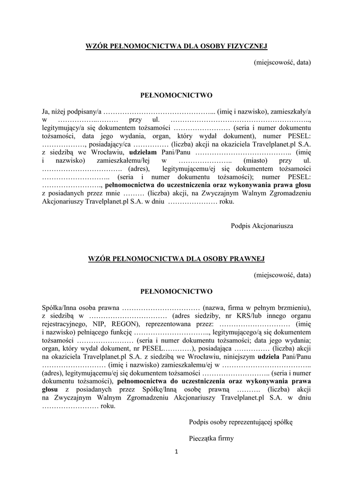 WZÓR PEŁNOMOCNICTWA DLA OSOBY FIZYCZNEJ (miejscowość, data) PEŁNOMOCNICTWO Ja, niŜej podpisany/a ………………………………………... (imię i nazwisko), zamieszkały/a w ……………..……… przy ul. ………………………………………………….., legitymujący/a się dokumentem toŜsamości …………………… (seria i numer dokumentu toŜsamości, data jego wydania, organ, który wydał dokument), numer PESEL: ………………, posiadający/ca …………… (liczba) akcji na okaziciela Travelplanet.pl S.A. z siedzibą we Wrocławiu, udzielam Pani/Panu ………………………………….. (imię i nazwisko) zamieszkałemu/łej w ………………….. (miasto) przy ul. ……………………………. (adres), legitymującemu/ej się dokumentem toŜsamości ……………………….. (seria i numer dokumentu toŜsamości); numer PESEL: ……………………., pełnomocnictwa do uczestniczenia oraz wykonywania prawa głosu z posiadanych przez mnie ……… (liczba) akcji, na Zwyczajnym Walnym Zgromadzeniu Akcjonariuszy Travelplanet.pl S.A. w dniu ………………… roku. Podpis Akcjonariusza WZÓR PEŁNOMOCNICTWA DLA OSOBY PRAWNEJ (miejscowość, data) PEŁNOMOCNICTWO Spółka/Inna osoba prawna …………………………… (nazwa, firma w pełnym brzmieniu), z siedzibą w …………………………… (adres siedziby, nr KRS/lub innego organu rejestracyjnego, NIP, REGON), reprezentowana przez: ………………………… (imię i nazwisko) pełniącego funkcję ………………………….., legitymującego/ą się dokumentem toŜsamości …………………… (seria i numer dokumentu toŜsamości; data jego wydania; organ, który wydał dokument, nr PESEL…………), posiadająca …………… (liczba) akcji na okaziciela Travelplanet.pl S.A. z siedzibą we Wrocławiu, niniejszym udziela Pani/Panu ……………………… (imię i nazwisko) zamieszkałemu/ej w ……………………………….. (adres), legitymującemu/ej się dokumentem toŜsamości ……………………….. (seria i numer dokumentu toŜsamości), pełnomocnictwa do uczestniczenia oraz wykonywania prawa głosu z posiadanych przez Spółkę/Inną osobę prawną ………. (liczba) akcji na Zwyczajnym Walnym Zgromadzeniu Akcjonariuszy Travelplanet.pl S.A. w dniu …………………… roku. Podpis osoby reprezentującej spółkę Pieczątka firmy 1 IDENTYFIKACJA AKCJONARIUSZA W celu identyfikacji Akcjonariusza udzielającego pełnomocnictwa, do dokumentu pełnomocnictwa powinny zostać załączone następujące dokumenty: • W przypadku akcjonariusza, będącego osobą fizyczną - kopia dowodu osobistego, paszportu lub innego urzędowego dokumentu toŜsamości akcjonariusza. Dodatkowo akcjonariusz, będący osobą fizyczną, powinien załączyć oświadczenie o wyraŜeniu zgody na przetwarzanie przez Spółkę danych osobowych w celu identyfikacji akcjonariusza na potrzeby weryfikacji waŜności pełnomocnictwa udzielonego w postaci elektronicznej, • W przypadku akcjonariusza innego niŜ osoba fizyczna – kopia odpisu z właściwego rejestru lub innego dokumentu potwierdzającego umocowanie do udzielenia upowaŜnienia pełnomocnikowi do reprezentowania akcjonariusza na Walnym Zgromadzeniu Akcjonariuszy Travelplanet.pl S.A. • W przypadku wątpliwości co do prawdziwości kopii wyŜej wymienionych dokumentów, Zarząd Spółki zastrzega sobie prawo do Ŝądania od pełnomocnika okazania przy sporządzaniu listy obecności następujących dokumentów: W przypadku akcjonariusza będącego osobą fizyczną – potwierdzonej za zgodność z oryginałem przez notariusza lub inny podmiot uprawniony do potwierdzania za zgodność z oryginałem kopii dowodu osobistego, paszportu lub innego urzędowego dokumentu toŜsamości akcjonariusza; W przypadku akcjonariusza innego niŜ osoba fizyczna - oryginału lub kopii potwierdzonej za zgodność z oryginałem przez notariusza lub inny podmiot uprawniony do potwierdzania za zgodność z oryginałem odpisu z właściwego rejestru lub innego dokumentu potwierdzającego umocowanie do udzielenia upowaŜnienia pełnomocnikowi do reprezentowania akcjonariusza na Walnym Zgromadzeniu Akcjonariuszy Travelplanet.pl S.A. IDENTYFIKACJA PEŁNOMOCNIKA W celu identyfikacji pełnomocnika, Zarząd Spółki zastrzega sobie prawo do Ŝądania od pełnomocnika okazania przy sporządzaniu listy obecności następujących dokumentów: • W przypadku pełnomocnika będącego osobą fizyczną - dowodu osobistego, paszportu lub innego urzędowego dokumentu toŜsamości pełnomocnika; • W przypadku pełnomocnika innego niŜ osoba fizyczna - oryginału lub kopii potwierdzonej za zgodność z oryginałem przez notariusza lub inny podmiot uprawniony do potwierdzania za zgodność z oryginałem odpisu z właściwego rejestru lub innego dokumentu, potwierdzającego upowaŜnienie osoby fizycznej (osób fizycznych) do reprezentowania pełnomocnika na Walnym Zgromadzeniu Akcjonariuszy Travelplanet.pl S.A. oraz okazania dowodu osobistego, paszportu lub 2 innego urzędowego dokumentu toŜsamości osoby fizycznej, reprezentującej pełnomocnika innego niŜ osoba fizyczna. UWAGA ! W PRZYPADKU ZAISTNIENIA I STWIERDZENIA ROZBIEśNOŚCI POMIĘDZY DANYMI AKCJONARIUSZA WSKAZANYMI W PEŁNOMOCNICTWIE A DANYMI TEGO AKCJONARIUSZA, ZNAJDUJĄCYMI SIĘ NA LIŚCIE AKCJONARIUSZY UPRAWNIONYCH DO UDZIAŁU W ZWYCZAJNYM WALNYM ZGROMADZENIU AKCJONARIUSZY TRAVELPLANET.PL S.A., SPORZĄDZONEJ PRZEZ SPÓŁKĘ W OPARCIU O WYKAZ OTRZYMANY OD PODMIOTU PROWADZĄCEGO DEPOZYT PAPIERÓW WARTOŚCIOWYCH (KRAJOWY DEPOZYT PAPIERÓW WARTOŚCIOWYCH S.A.) I PRZEKAZANEGO SPÓŁCE, ZGODNIE Z ART. 4063 KODEKSU SPÓŁEK HANDLOWYCH, AKCJONARIUSZ ORAZ/LUB PEŁNOMOCNIK MOGĄ ZOSTAĆ NIE DOPUSZCZENI DO UCZESTNICTWA W ZWYCZAJNYM WALNYM ZGROMADZENIU AKCJONARIUSZY TRAVELPLANET.PL S.A. 3