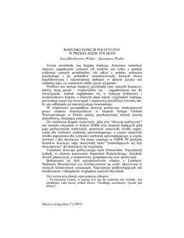 ROSYJSKI DOWCIP POLITYCZNY W PRZEKLADZIE POLSKIM Ewa Blachowicz-Wolny – Kazimierz Wolny Teoria przekładu ma bogatą tradycję. Fenomen translacji stanowi zagadnienie ciekawe od wieków nie tylko z punktu widzenia samych przekładów, ale także z punktu widzenia psychologii i jej pokładów semantycznych, których słowa najefektowniej i najstaranniej dobrane w danym języku nie oddadzą tego, co zamierzał oddác język oryginału. Problem ten nurtuje badaczy przekładu oraz samych tłumaczy, którzy stoją przed – wydawałoby się – zagadnieniem nie do rozwiązania. Jednak zagłębianie się w tradycje kulturowe i środowiskowe krajów, o których dane teksty oryginałów traktują, pozwalają węzeł ten rozwiązać i częściowo przybliżyć kwestię tak, by nie odbiegała od macierzystego komunikatu. W większości przypadków dowcip polityczny funkcjonował przez ostatnie dziesięciolecia w krajach byłego Układu Warszawskiego w formie ustnej, przekazywany niemal pocztą pantoflową, omijającą cenzurę. Do niedawna bogata twórczość, jaką jest “dowcip polityczny” nie istniała oficjalnie w byłym ZSRR oraz krajach będących pod jego politycznymi wpływami, ponieważ stanowiła źródło zagrozenia dla wolności osobistej opowiadającego, a często stanowiła źródło zagrożenia dla wolności osobistej opowiadającego, a często również i dla słuchacza. Na mocy znanego w ZSRR 58 artykułu Kodeksu Karnego sądy skazywały ludzi “ośmielających się być dowcipnymi” do dziesięciu lat więzienia. Tematyka dowcipu politycznego była różnorodna. Najczęściej jednak, w okresie panowania Imperium Radzieckiego, dotykała dwóch płaszczyzn, a mianowicie: gospodarczej oraz społecznej. Bohaterami jej byli przedstawiciele władzy z Leninem, Stalinem, Breżniewem czy Gorbaczowem na czele, ukazywani w różnych komicznych sytuacjach. Najczęściej podkreślających ich bezduszność i obojętność względem szarych obywateli. Do Lenina przychodzi reprezentacja chłopów: – Towarzyszu Lenin, w naszej wsi nic do jedzenia nie zostało. Już zjedliśmy całą trawę wokół drzew. Niedługo zaczniemy ryczeć jak krowy! Slavica tergestina 5 (1997) 36 Ewa Blachowicz-Wolny – Kazimierz Wolny – Nie wiem, nie wiem, moi drodzy. Ja dziś rano kaczuszkę zjadłem, a jakoś nie kwaczę. Rosjanie bawili się i umieli śmiać także ze swoich prywatnych spraw, na przykład pytali, jaki to jest “rodzinny szampan rosyjski? Mąż pije, żona syczy” (Русское шампанское по-семейному: муж пьёт, жена шипит). Względna bliskość brzmieniowa i gramatyczna języka polskiego i rosyjskiego umożliwia niekiedy, zachowanie w przekładach nawet tych samych struktur gramatycznych jak i podobnych dźwięków. Dotyczy to także intonacji: W latach dwudziestych: – Jak wy їyjecie? Wczesne lata trzydzieste: – Jak wy? №yjecie? Koniec lat trydziestych: – Jak? Wy їyjecie? (В двадцатые годы: – Как вы живёте? Начало тридцатых годов: – Как вы? Живёте? Конец тридцатых годов: – Как? Вы живёте?). Sposób wypowiadania tekstu – intonacja i akcent logiczny odgrywają decydującą rolę w rozumieniu treści. Często w polskich przekładach mówionych spotyka się rusycyzmy składniowe. Pojawia się wtedy przydawka kwalifikująca przed rzeczownikiem, np.: “Dlaczego należy zaprzestać produkcji karakułowych czapek dla niższych oficerów radzieckich? Dlatego, że ściąganie skóry z jednych baranów i zakładanie jej na innych okazało się nierentowne”. W polskim języku potocznym nieprawidłowość ta jest jednak dopuszczalna i zaciera się granica poprawności. Zrozumienie i podtekst wymowy dowcipu politycznego nie nastręczają trudności tłumaczowi, a następnie odbiorcy. Wykluczona jest w tym wypadku interpretacja translatorska. Wybór synonimicznych zasobów języka polskiego daje, jak się okazuje, możliwość skalkowania warstwy nie tylko fonicznej tekstu, ale i instrumentacji głoskowej. Przekład taki nie wymaga stylistycznej pretensjonalności. Trzyma się raczej dosłowności w sferze leksykalno-semantycznej, np.: – Panie doktorze, proszę o tabletki od chciwości. Tylko dużo, dużo! (Доктор, дайте мне таблетку от жадности. Да побольше, побольше!). Slavica tergestina 5 (1997) ROSYJSKI DOWCIP POLITYCZNY W PRZEKLADZIE POLSKIM 37 Cechą charakterystyczną dowcipu jest jego anonimowość. Dotyczy to także przekładu. Nikomu nie można go przypisać. Bazuje się tylko na tzw. przekazach ustnych, które są często typową “sztuką interpretacji” na płaszczyźnie fonicznej jak i kulturowej. Wykluczyć tu należy w związku z tym ocenę artystyczną tego typu przekładów, które skupiają się wokół treści oraz sensów przekazywanych podtekstów. Kontakty między Polską a byłym Związkiem Radzieckim rozwijały się bardzo intensywnie – tak na szczeblu oficjalnym jak i nieoficjalnym. Opowiadane przez Rosjan i Polaków dowcipy polityczne można było przypisywać tak jednej jak i drugiej stronie. Granice narzucone, choć dobrze strzeżone, nie rozdzieliły rozsądnych Polaków i Rosjan na tyle, by wspólnie nie mogli się pośmiać z chciwości i braku tolerancji najwyższych władz państwowych. Dla uczczenia wizyty Breżniewa w jednym z bratnich krajów zarządzono salwy artyleryjskie. Po drugiej z nich staruszka na ulicy pyta przechodnia: – Dlaczego strzelają? – Breżniew przyjechał, babciu. – Aha, rozumiem. Za pierwszym razem nie trafili. W polskiej tradycji kulturowo-językowej nie istnieje forma grzecznościowa zwracania się do nieznanych sobie starszych osób “babciu” bądź “dziadku”. Tłumacze starają się zachować, jak widać, grzecznościową formę rosyjską w polskim przekładzie, ale częściej wprowadzają polskie “pan”, “pani” dla podkr