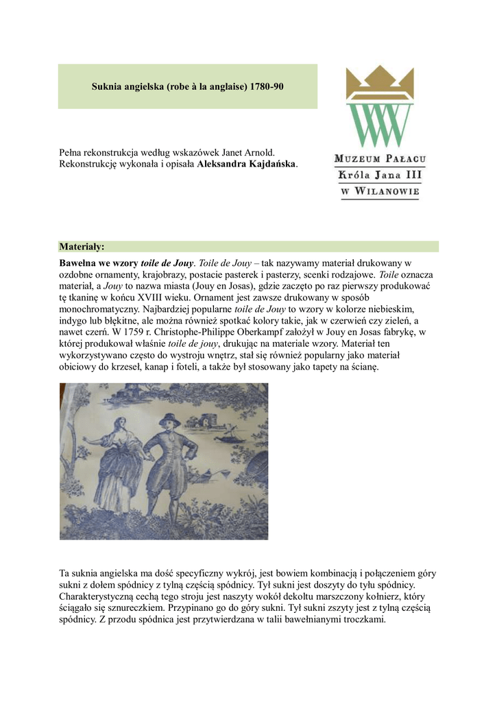 Suknia angielska (robe à la anglaise) 1780-90 Pełna rekonstrukcja według wskazówek Janet Arnold. Rekonstrukcję wykonała i opisała Aleksandra Kajdańska. Materiały: Bawełna we wzory toile de Jouy. Toile de Jouy – tak nazywamy materiał drukowany w ozdobne ornamenty, krajobrazy, postacie pasterek i pasterzy, scenki rodzajowe. Toile oznacza materiał, a Jouy to nazwa miasta (Jouy en Josas), gdzie zaczęto po raz pierwszy produkować tę tkaninę w końcu XVIII wieku. Ornament jest zawsze drukowany w sposób monochromatyczny. Najbardziej popularne toile de Jouy to wzory w kolorze niebieskim, indygo lub błękitne, ale można również spotkać kolory takie, jak w czerwień czy zieleń, a nawet czerń. W 1759 r. Christophe-Philippe Oberkampf założył w Jouy en Josas fabrykę, w której produkował właśnie toile de jouy, drukując na materiale wzory. Materiał ten wykorzystywano często do wystroju wnętrz, stał się również popularny jako materiał obiciowy do krzeseł, kanap i foteli, a także był stosowany jako tapety na ścianę. Ta suknia angielska ma dość specyficzny wykrój, jest bowiem kombinacją i połączeniem góry sukni z dołem spódnicy z tylną częścią spódnicy. Tył sukni jest doszyty do tyłu spódnicy. Charakterystyczną cechą tego stroju jest naszyty wokół dekoltu marszczony kołnierz, który ściągało się sznureczkiem. Przypinano go do góry sukni. Tył sukni zszyty jest z tylną częścią spódnicy. Z przodu spódnica jest przytwierdzana w talii bawełnianymi troczkami. Etapy szycia Najpierw kopiujemy wykrój według wskazówek z książki. Dopasowujemy do pożądanych wymiarów. Pamiętajmy, że suknia jest noszona na gorset, halkę i wałek. Materiał: Toile de jouy, bawełna na podszewkę (tylko góra sukni). Nici: Gutermann, nici jedwabne. Jeśli nie ma dostępu do nici jedwabnych, można zastąpić nićmi bawełnianymi. Jeśli wykrój jest już gotowy, rozmieszczamy go na tkaninie i wykrawamy z niej wszystkie potrzebne elementy stroju. To samo robimy z podszewką. Zszywamy wszystkie elementy pleców z podszewki i z materiału wierzchniego. Ściegi: Ścieg za igłą, źródło: https://www.austintatiousofferings.com/pages.php?pID=5&CDpath=1 Fastryga, źródło: http://www.embroiderersguild.com/stitch/stitches/running.html ETAP 1. Najpierw zszywamy górę sukni, boki oraz ramiona – zarówno z materiału, jak i z podszewki. ETAP 2. Zszywamy rękawy z podszewki i z materiału. Przykładamy materiał do podszewki i upinamy górę do pożądanego rozmiaru i według określonych na wykroju zaszewek. Brzegi dołu rękawa podwijamy do środka i zaszywamy ściegiem krytym. Ścieg kryty. Ilustracja z książki Patchworkowe torebki Ellen Kharade. Rękaw wszyty ściegiem za igłą. Brzegi podszywamy bawełnianą taśmą ze skosu. W niektórych zachowanych obiektach można zaobserwować ten typ podszywania brzegów tkaniny: za pomocą taśmy ze skosu, którą bardzo często wykonywano z resztek. Było to ekonomiczne, gdyż zużywało się tkaninę w całości bez konieczności kupowania pasmanterii. ETAP 3. Kołnierz. Wycinamy według wykroju – im będzie dłuższy, tym bardziej będziemy go ściągać sznurkiem i będzie wymagał większego zmarszczenia. Kołnierz jest bez podszewki. Jego brzegi wycinamy w zygzaki. Oryginalnie zygzakowaty brzeg jest podszyty bawełnianą albo jedwabną taśmą ze skosu. Ja musiałam to zmienić, gdyż zabrakło mi bawełnianej taśmy ze skosu, która jest rzadko dostępna, a nie chciałam używać sztucznej. Wykorzystałam więc inny sposób ozdobienia brzegów kołnierza – ząbkowanie krawieckie (ang. pinking). Jest to metoda dekorowania tkaniny delikatnymi nacięciami, tzw. rzezanie, także na brzegach tkaniny, dla utworzenia wzorów w postaci ząbków poprzez ich perforację przy pomocy małych modelowanych dziurkaczy – przebijaków. Moje ząbkowanie zrobiłam za pomocą ząbkowanych nożyczek. Na lewej stronie kołnierza przyszywamy taśmę bawełnianą ze skosu, przez którą potem przeciągamy bawełniany sznurek. Sznurek trzeba mocno przymocować do końca drugiego brzegu taśmy. Górne brzegi kołnierza wykańczamy taśmą ze skosu. Następnie kołnierz przyszywamy do brzegów góry sukni. Ale tylko do ramion – nie przyszywamy całego kołnierza do przodu sukni, w tym miejscu będzie on upinany szpilkami po ściągnięciu sznureczkiem. ETAP 4. Wszywanie paneli do sznurowania. Suknia ta ma dość nietypowe jak na koniec XVIII wieku zapięcie, które jest sznurowane. Wygląda to trochę na styl rustykalno-pasterski. Do sznurowania są potrzebne panele z dziurkami, przez które przeciągamy sznurek i regulujemy w ten sposób zapięcie stanika. Każdy panel jest wzmocniony fiszbinem. Używam fiszbinów bambusowych. Każdy z fiszbinów wszywamy ściegiem za igłą, później robimy dziurki, obszywając je ściegiem na okrętkę i przyszywamy do przodu góry wąziutkim ściegiem za igłą. ETAP 5. Spódnica. Zszywamy dwa kawałki materiału ze sobą ściegiem za igłą. Wyrównujemy długość spódnicy, biorąc poprawkę na buty na obcasie. Tylną część spódnicy przyszywamy do górnej tylnej części sukni, robiąc odpowiednio plisy w talii. Warto wymodelować to na manekinie z założoną całą bielizną i z wałkiem na biodrach, jeśli chcemy, aby spódnica układała się ładnie z tyłu. Przód spódnicy modelujemy według pożądanych rozmiarów pliskami i wszywamy bawełnianą taśmę do sznurowania. Od góry spódnicy po obu bokach powinno zostać ok. 30 cm niezszytej tkaniny, tak aby można było swobodnie założyć suknię i zawiązać przód wokół talii. BIBLIOGRAFIA I IKONOGRAFIA: 1. Janet Arnold, Pattern of Fashion 1 1660-1860 2. Zachowany ubiór 1780–90 w The Gallery of English Costume, Manchester 3. Jane Ashelford, The Art of Dress. Clothes and Society 1500–1914, The National Trust, 1996 4. Suknia angielska z drukowanej bawełny z 1790 roku z Snowshill Collection, Snowshill Mu