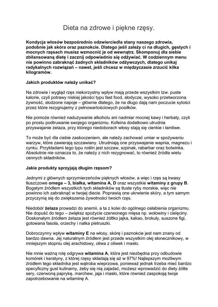 Dieta na zdrowe i piękne rzęsy. Kondycja włosów bezpośrednio odzwierciedla stany naszego zdrowia, podobnie jak skóra oraz paznokcie. Dlatego jeśli zależy ci na długich, gęstych i mocnych rzęsach musisz wzmocnić je od wewnątrz. Skomponuj dla siebie zbilansowaną dietę i zacznij odpowiednio się odżywiać. W codziennym menu nie powinno zabraknąć żadnych składników odżywczych, dlatego unikaj radykalnych rozwiązań – nawet, jeśli chcesz w międzyczasie zrzucić kilka kilogramów. Jakich produktów należy unikać? Na zdrowie i wygląd rzęs niekorzystny wpływ mają przede wszystkim tzw. puste kalorie, czyli potrawy niskiej jakości typu fast food, słodycze, wysoko przetworzona żywność, słodzone napoje – głównie dlatego, że na długo dają nam poczucie sytości przez które rezygnujemy z pełnowartościowych posiłków. Nie pomoże również nadużywanie alkoholu ani nadmiar mocnej kawy i herbaty, czyli po prostu podtruwanie swojego organizmu. Kofeina dodatkowo utrudnia przyswajanie żelaza, przy którego niedoborach włosy stają się cienkie i łamliwe. To może być dla ciebie zaskoczeniem, ale należy zachować umiar w spożywaniu warzyw, które zawierają szczawiany. Utrudniają one przyswajanie wapnia, magnezu i cynku. Przykładami tego typu roślin jest szczaw, szpinak, rabarbar oraz botwinka. Absolutnie nie oznacza to, że należy z nich rezygnować, to również źródła wielu cennych składników. Jakie produkty sprzyjają długim rzęsom? Jednymi z głównych sprzymierzeńców pięknych włosów, a więc i rzęs są kwasy tłuszczowe omega – 3, białka, witamina A, D oraz wszystkie witaminy z grupy B. Bogatym źródłem wszystkich tych składników są tłuste ryby morskie, więc nie powinno ich zabraknąć w twojej diecie. Poprawią one ukrwienie skóry, a tym samym przyczynią się do zwiększenia żywotności twoich rzęs. Niedobór żelaza prowadzi do anemii, a ta z kolei do ogólnego osłabienia organizmu. Nie dopuść do tego – zwiększ spożycie czerwonego mięsa np. wołowiny i cielęciny. Doskonałym źródłem żelaza jest również żółtko jajka, kakao, brokuły, suszone figi, gotowana fasola, orzechy i natka pietruszki. Dobroczynny wpływ witaminy E na włosy, skórę i paznokcie jest nam znany od bardzo dawna. Jej naturalnym źródłem jest przede wszystkim olej słonecznikowy, w mniejszym stopniu olej arachidowy, oliwa z oliwek i masło. Nie mnie ważną rolę odgrywa witamina A, która jest niezbędna przy odbudowie komórek i keratyny, z której rzęsy składają się aż w 97%! Najlepszym możliwym źródłem tego składnika jest wątroba wieprzowa, ponieważ jednak trzeba mieć bardzo specyficzny gust kulinarny, żeby się nią zajadać, możesz wprowadzić do diety żółte sery, czerwoną paprykę, marchew, jaja i masło, które również zaspokoją twoje zapotrzebowanie na witaminę A. Równie ważna jest biotyna, która wywiera wyjątkowo dobroczynny wpływu na wzrost i wygląd włosów (zapobiega nawet siwieniu i łysieniu), zdrowie skóry oraz paznokci. Jej źródłem w pożywieniu są pomidory, orzechy, migdały i marchew. Szczególnie orzechy powinny stać się częścią codziennego jadłospisu. Wystarczy zalewie garść dziennie żeby skutecznie zaspokoić również zapotrzebowanie na cynk, który zapobiegnie wypadaniu rzęs. Dieta przyjazna rzęsom musi być bogata w białko. Najlepszym jego źródłem jest mięso drobiowe, ryby, rośliny strączkowe, ser twarogowy oraz białko jaj. Jeśli pragniesz długich i gęstych rzęs, spożywaj go od 50 do 80 gramów dziennie. W przypadku niedoboru białka szybko zauważysz nadmierne wypadanie włosów oraz ich łamliwość. Witaminy i antyoksydanty to równie ważne elementy zdrowego odżywiania. Wprowadź kolory do swojej diety! Przede wszystkim jedz warzywa, tak często, jak to tylko możliwe, owoce ogranicz do dwóch rozsądnych porcji dziennie, ponieważ zawierają sporo cukrów prostych. Bez ograniczeń może się zajadać papryką, pomidorami, marchewką, dynią, fasolką szparagową, kapustą pekińską, cykorią, sałatą i czarną rzepą. W rozsądnych ilościach twoim rzęsom przysłużą się winogrona, jabłka, banany, kiwi, pomarańcze, ananas i awokado. Jeśli będziesz stosowała się do powyższych zasad i mimo tego po trzech miesiącach nie zauważysz poprawy w wyglądzie swoich rzęs, jak i włosów na głowie, może to sygnalizować problemy hormonalne. W takim przypadku warto, a nawet trzeba skontaktować się z lekarzem.