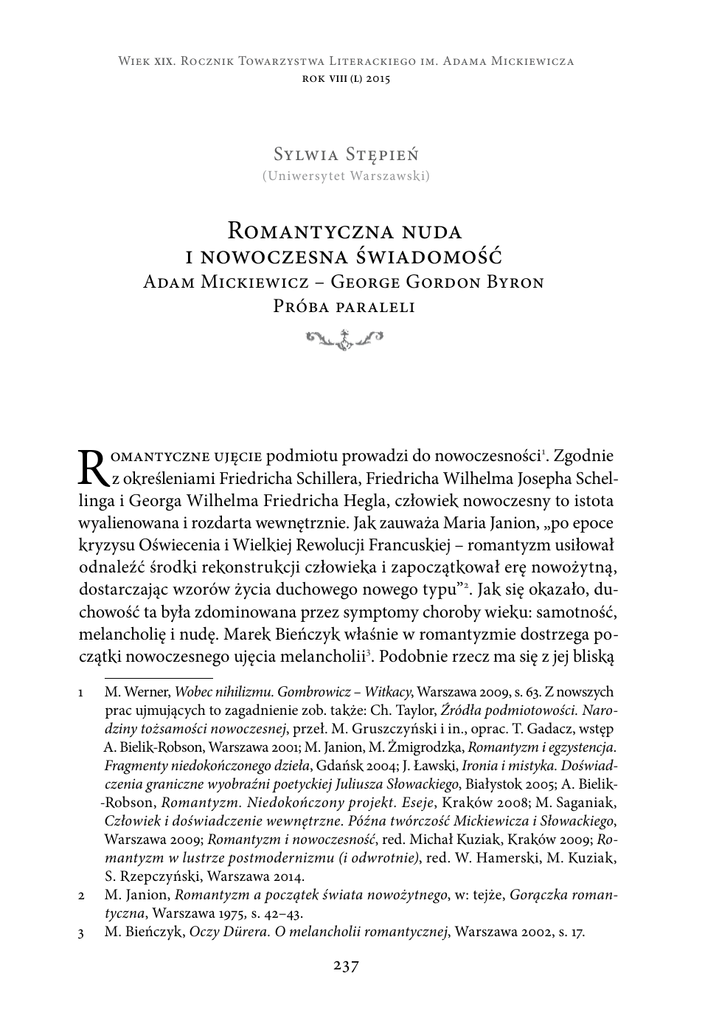 Wiek XIX . Rocznik Towarzystwa Literackiego im. Adama Mickiewicza rok VIii (L) 2015 Sylwia Stępień (Uniwersy tet Warszawski) Romantyczna nuda i nowoczesna świadomość Adam Mickiewicz – George Gordon Byron Próba paraleli R omantyczne ujęcie podmiotu prowadzi do nowoczesności1. Zgodnie z określeniami Friedricha Schillera, Friedricha Wilhelma Josepha Schellinga i Georga Wilhelma Friedricha Hegla, człowiek nowoczesny to istota wyalienowana i rozdarta wewnętrznie. Jak zauważa Maria Janion, „po epoce kryzysu Oświecenia i Wielkiej Rewolucji Francuskiej – romantyzm usiłował odnaleźć środki rekonstrukcji człowieka i zapoczątkował erę nowożytną, dostarczając wzorów życia duchowego nowego typu”2. Jak się okazało, duchowość ta była zdominowana przez symptomy choroby wieku: samotność, melancholię i nudę. Marek Bieńczyk właśnie w romantyzmie dostrzega początki nowoczesnego ujęcia melancholii3. Podobnie rzecz ma się z jej bliską M. Werner, Wobec nihilizmu. Gombrowicz – Witkacy, Warszawa 2009, s. 63. Z nowszych prac ujmujących to zagadnienie zob. także: Ch. Taylor, Źródła podmiotowości. Narodziny tożsamości nowoczesnej, przeł. M. Gruszczyński i in., oprac. T. Gadacz, wstęp A. Bielik-Robson, Warszawa 2001; M. Janion, M. Żmigrodzka, Romantyzm i egzystencja. Fragmenty niedokończonego dzieła, Gdańsk 2004; J. Ławski, Ironia i mistyka. Doświadczenia graniczne wyobraźni poetyckiej Juliusza Słowackiego, Białystok 2005; A. Bielik-Robson, Romantyzm. Niedokończony projekt. Eseje, Kraków 2008; M. Saganiak, Człowiek i doświadczenie wewnętrzne. Późna twórczość Mickiewicza i Słowackiego, Warszawa 2009; Romantyzm i nowoczesność, red. Michał Kuziak, Kraków 2009; Romantyzm w lustrze postmodernizmu (i odwrotnie), red. W. Hamerski, M. Kuziak, S. Rzepczyński, Warszawa 2014. 2 M. Janion, Romantyzm a początek świata nowożytnego, w: tejże, Gorączka romantyczna, Warszawa 1975, s. 42–43. 3 M. Bieńczyk, Oczy Dürera. O melancholii romantycznej, Warszawa 2002, s. 17. 1 237 • Sylwia Stępień • krewną – nudą. Nie przez przypadek nuda stała się jawnym aktem kulturowym dopiero w XVIII wieku4, będąc niejako reakcją na rozpad świata i wyczerpanie dotychczasowych wartości. Znudzenie stało się wyrazem buntu i niezgody na wizję rzeczywistości, w której człowiek zajmuje pozycję podrzędną, a jego tożsamość podlega postępującej degradacji. Ennui to doświadczenie nieobecności, zawieszenia, pustki, braku i całkowitego znudzenia światem. Przypomnijmy, że słowo wywodzi się od łacińskiego rzeczownika odium, esse in odio i dosłownie oznacza ‘obiekt nienawiści’. Zgodnie z definicją jest to stan przeciwny błogosławieństwu, łasce. Człowiek znajdujący się w stanie ennui nie ma szans usłyszeć głosu Boga, dręczy go podejrzenie, że Stwórca nie istnieje i że został pozbawiony jego opieki5. Stąd już pozostaje tylko krok do Kierkegaardowskiego „albo-albo” (bez Boga wszystko traci swoją rację bytu) i do nietzscheańskiego nihilizmu, które – jak wiadomo –pozostają ważnymi komponentami nowoczesności6. Zgodnie z ustaleniami Petera Tooheya7, istnieją dwa rodzaje nudy: nuda zwyczajna oraz nuda egzystencjalna. Nuda zwyczajna jest doświadczeniem tymczasowym, kojarzonym zazwyczaj z okresem dzieciństwa. Nuda egzystencjalna8 bywa nazywana chorobą filozoficzną, czyli chorobą duszy, i jest spokrewniona z takimi stanami, jak depresja, melancholia, monotonia, smutek, acedia. Denis Diderot w swojej Encyklopedii (1755) zamieszcza definicję ennui, którą opisuje jako: Rodzaj nieprzyjemności, którego nie da się zdefiniować: nie jest to ani przygnębienie, ani smutek; jest to swego rodzaju brak jakiejkolwiek przyjemności spowodowany nie wiedzieć czym w naszych narządach lub przedmiotach z zewnątrz, który miast zajmować naszą duszę, wytwarza w niej jakąś niemoc lub niesmak, do których nie sposób się przyzwyczaić.9 Warto również przypomnieć, że jednym z pierwszych twórców, który pisał o nudzie, czyniąc z niej w ten sposób zjawisko kulturowe, był Michel de Montaigne. Uznał ją za przypadłość dręczącą ludzi nieświadomych ani siebie, ani zasad rządzących światem. Jego zdaniem, zazwyczaj to właśnie brak samoświa4 5 6 7 8 9 P.M. Spacks, Boredom. The Literary History of a State of Mind, Chicago 1995, s. 30. G. Batten, The Orphaned Imagination: Melancholy and Commodity Culture in English Romanticism, Durham 1998, s. 27. M. Werner, dz. cyt., s. 12 i 17. P. Toohey, Historia nudy, tłum. K. Ciarcińska, Warszawa 2012, s. 15–17. Termin „nuda egzystencjalna” został wprowadzony przez niemieckiego socjologa Martina Doehlemanna (zob. tegoż, Langeweile? Deutung eines verbreiteten Phänomens, Frankfurt am Main 1991). Cyt. za: M.P. Markowski, L’ennui, ułamek historii, w: Nuda w kulturze, pod red. P. Czaplińskiego i P. Śliwińskiego, Poznań, s. 292. 238 • Romantyczna nuda i nowoczesna świadomość • domości prowadzi do ennui. Radził, by unikać znudzenia poprzez zwrócenie się do wnętrza i poszukiwanie pocieszenia w rozmowie z samym sobą. Nuda stanowi zagrożenie tylko dla osób znajdujących się w bezruchu, w bezczynności. Podobną diagnozę postawił Blaise Pascal, stwierdzając, że istotą ludzkiej natury jest poruszanie się między sprzecznościami, do których należą także nuda i rozrywka, namiętność i jej brak. Nuda stanowi tylko jeden z biegunów ludzkiej duszy, pomiędzy którymi trzeba utrzymać równowagę, w przeciwnym razie człowiek pozbawiony divertissement zostaje przytłoczony pustką, samotnością, nicością. Pascal sądził, że tylko Stwórca potrafi wyrwać nas z otchłani znudzenia. François de La Rochefoucauld i Jean de La Bruyère z kolei zmienili perspektywę i zaczęli poszukiwać przyczyn nudy nie we wnętrzu człowieka, ale w jego otoczeniu10. Natomiast Voltaire i inni filozofowie oświeceniowi uważali zaś, że ty
