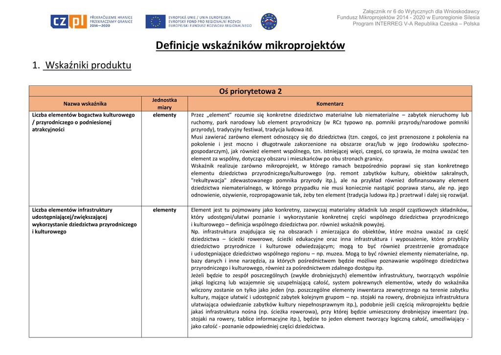 Załącznik nr 6 do Wytycznych dla Wnioskodawcy Fundusz Mikroprojektów 2014 - 2020 w Euroregionie Silesia Program INTERREG V-A Republika Czeska – Polska Definicje wskaźników mikroprojektów 1. Wskaźniki produktu Oś priorytetowa 2 Nazwa wskaźnika Liczba elementów bogactwa kulturowego / przyrodniczego o podniesionej atrakcyjności Liczba elementów infrastruktury udostępniającej/zwiększającej wykorzystanie dziedzictwa przyrodniczego i kulturowego Jednostka miary elementy elementy Komentarz Przez „element” rozumie się konkretne dziedzictwo materialne lub niematerialne – zabytek nieruchomy lub ruchomy, park narodowy lub element przyrodniczy (w RCz typowo np. pomniki przyrody/narodowe pomniki przyrody), tradycyjny festiwal, tradycja ludowa itd. Musi zawierać zarówno element odnoszący się do dziedzictwa (tzn. czegoś, co jest przenoszone z pokolenia na pokolenie i jest mocno i długotrwale zakorzenione na obszarze oraz/lub w jego środowisku społecznogospodarczym), jak również element wspólnego, tzn. istniejącej więzi, czegoś, co sprawia, że można uważać ten element za wspólny, dotyczący obszaru i mieszkańców po obu stronach granicy. Wskaźnik realizuje zarówno mikroprojekt, w którego ramach bezpośrednio poprawi się stan konkretnego elementu dziedzictwa przyrodniczego/kulturowego (np. remont zabytków kultury, obiektów sakralnych, "rekultywacja" zdewastowanego pomnika przyrody itp.), ale na przykład również dofinansowany element dziedzictwa niematerialnego, w którego przypadku nie musi koniecznie nastąpić poprawa stanu, ale np. jego odnowienie, ożywienie, rozpropagowanie tak, żeby ten element (tradycja ludowa itp.) przetrwał i dalej się rozwijał. Element jest tu pojmowany jako konkretny, zazwyczaj materialny składnik lub zespół cząstkowych składników, który udostępni/ułatwi poznanie i wykorzystanie konkretnej części wspólnego dziedzictwa przyrodniczego i kulturowego – definicja wspólnego dziedzictwa por. również wskaźnik powyżej. Np. infrastruktura znajdująca się na obszarach i zmierzająca do obiektów, które można uważać za część dziedzictwa – ścieżki rowerowe, ścieżki edukacyjne oraz inna infrastruktura i wyposażenie, które przybliży dziedzictwo przyrodnicze i kulturowe odwiedzającym; mogą to być również przestrzenie gromadzące i udostępniające dziedzictwo wspólnego regionu – np. muzea. Mogą to być również elementy niematerialne, np. bazy danych i inne narzędzia, za których pośrednictwem będzie możliwe poznawanie wspólnego dziedzictwa przyrodniczego i kulturowego, również za pośrednictwem zdalnego dostępu itp. Jeżeli będzie to zespół poszczególnych (zwykle drobniejszych) elementów infrastruktury, tworzących wspólnie jakąś logiczną lub wzajemnie się uzupełniającą całość, system pokrewnych elementów, wtedy do wskaźnika wliczony zostanie on tylko jako jeden (np. poszczególne elementy inwentarza zewnętrznego na terenie zabytku kultury, mające ułatwić i udostępnić zabytek kolejnym grupom – np. stojaki na rowery, drobniejsza infrastruktura ułatwiająca odwiedzanie zabytków kultury niepełnosprawnym itp.), podobnie jeśli częścią mikroprojektu będzie jakaś infrastruktura nośna (np. ścieżka rowerowa), przy której będzie umieszczony drobniejszy inwentarz (np. stojaki na rowery, tablice informacyjne itp.), będzie to jeden element tworzący logiczną całość, umożliwiający jako całość - poznanie odpowiedniej części dziedzictwa. Załącznik nr 6 do Wytycznych dla Wnioskodawcy Fundusz Mikroprojektów 2014 - 2020 w Euroregionie Silesia Program INTERREG V-A Republika Czeska – Polska Liczba zrealizowanych wspólnych mechanizmów w zakresie dziedzictwa kulturowego i przyrodniczego mechanizmy Przez mechanizm rozumie się rozwiązanie lub kombinację rozwiązań przygotowanych lub realizowanych w ramach mikroprojektu transgranicznego, które skupiają się na wspólnych wyzwaniach (potrzebach lub potencjałach) w obszarze transgranicznym, w zakresie wykorzystania dziedzictwa przyrodniczego i kulturowego regionu przygranicznego. Dotyczy to przeważnie rozwiązań o charakterze systemowym w zakresie wykorzystania i promowania dziedzictwa kulturowego i przyrodniczego. Zatem konkretnym typem rozwiązania mogą być na przykład: analizy i ewaluacje, wspólne koncepcje, strategie i plany lub działania promocyjne, informacyjne i marketingowe, zmierzające do zwiększenia spójności i wspólnego podejścia w zakresie wykorzystania dziedzictwa kulturowego i przyrodniczego wspólnego regionu. Oś priorytetowa 3 Nazwa wskaźnika Liczba uczestników wspólnych programów edukacyjnych oraz przygotowania zawodowego w celu transgranicznego wspierania zatrudnienia młodzieży, zwiększania możliwości edukacyjnych, kształcenia wyższego i przygotowania zawodowego Jednostka miary osoby Komentarz Do wartości wskaźnika należy wliczyć wszystkie osoby biorące bezpośrednio udział we wspólnych programach edukacyjnych czy programach przygotowania zawodowego będących przedmiotem działań mikroprojektu. Zaplanowana wartość wskaźnika musi odpowiadać opisowi działań i zaplanowanym środkom finansowym. Oś priorytetowa 4 Nazwa wskaźnika Liczba partnerów zaangażowanych we wspólne działania Jednostka miary liczba partnerów Komentarz Ujęci zostaną tylko ci partnerzy, którzy biorą rzeczywiście aktywny udział w mikroprojekcie i występują jako partnerzy we wniosku projektowym. Jako partnerzy mikroprojektów mogą być zaliczane jednostki organizacyjne podmiotów publicznych, które realizują mikroprojekt, ale nie posiadają osobowości prawnej, gdyż osobowość prawną ma ich organ prowadzący. Załącznik nr 6 do Wytycznych dla Wnioskodawcy Fundusz Mikroprojektów 2014 - 2020 w Euroregionie Silesia Program INTERREG V-A Republika Czeska – Polska 2. Wskaźniki rezultatu Poszczególne mikroprojekty muszą także przyczynić się do osiągn