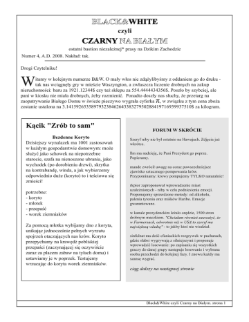 ostatni bastion niezależnej* prasy na Dzikim Zachodzie Numer 4, A.D. 2008. Nakład: tak. Drogi Czytelniku! W itamy w kolejnym numerze B&W. O mały włos nie zdążylibyśmy z oddaniem go do druku tak nas wciągnęły gry w mieście Waszyngton, a zwłaszcza liczenie drobnych na zakup nieruchomości: baru za 1921.12344$ czy też sklepu za 554.4444434356$. Poszło by szybciej, ale pani w kiosku nie miała drobnych, żeby rozmienić. Ponadto doszły nas słuchy, że przetarg na zaopatrywanie Białego Domu w świeże pieczywo wygrała cyferka π, w związku z tym cena zboża zostanie ustalona na 3.14159265358979323846264338327950288419716939937510$ za kilogram. Dzisiejszy wynalazek ma 1001 zastosowań w każdym gospodarstwie domowym: może służyć jako schowek na niepotrzebne starocie, szafa na nienoszone ubrania, jako wychodek (po dorobieniu drzwi), skrytka na kontrabandę, winda, a jak wybierzemy odpowiednio duże (koryto) to i teściowa się zmieści! potrzebne: - koryto - młotek - przepaść - worek ziemniaków Za pomocą młotka wybijamy dno z koryta, unikając jednocześnie pełnych wyrzutu spojrzeń otaczających nas krów. Koryto przepychamy na krawędź pobliskiej przepaści (zaczynającej się oczywiście zaraz za placem zabaw na tyłach domu) i ustawiamy je w poprzek. Testujemy wrzucając do koryta worek ziemniaków. Szeryf niby nie był ostatnio na Hawajach. Zdjęcia już wkrótce. llm ma nadzieję, że Pani Prezydent go poprze. Popieramy. mande zwrócił uwagę na coraz powszechniejsze zjawisko sztucznego pompowania krów. Przypominamy: krowy pompujemy TYLKO naturalnie! rkpior zaproponował wprowadzenie miast uzależnionych - niby w celu podniesienia emocji. Proponujemy sprawdzone metody: od alkoholu, palenia tytoniu oraz miśków Haribo. Emocje gwarantowane. w kanale prezydenckim leżało orędzie, 1500 stron drobnym maczkiem. - to jakby ktoś nie wiedział. sinfulnat ma dość cfaniackich rozgrywek w pucharach, gdzie słabsi wygrywają z silniejszymi i proponuje wprowadzić losowanie: po zapisaniu się wszystkich graczy do danej grupy następuje losowanie i wybrana osoba przechodzi do kolejnej fazy. I znowu każdy ma szansę wygrać. Black&White czyli Czarny na Białym. strona 1 ostatni bastion niezależnej* prasy na Dzikim Zachodzie Poniższy przepis pochodzi z kuchni więziennej - to jednocześnie ulubione danie naszego redakcyjnego praktykanta. potrzebne: - mielone mięso młodego sępa - 300g zmielonej cebuli - puszka fasoli, koncentrat pomidorowy - 2 łyżeczki sproszkowanej chili - łyżeczka kminku, 1 łyżka mąki - 150g startego żółtego sera Cheddar Wrzucamy na patelnię mielone mięso i cebulę, smażymy przez chwilę, aż zbrązowieje. Odsączamy tłuszcz. Dodajemy fasolę i koncentrat, smażymy przez 15 minut. Mieszamy chili, mąkę, wodę i szczyptę soli w małym naczyniu po czym przelewamy miksturę do patelni. Smażymy przez 45 minut na bardzo małym ogniu, mieszając często. Serwujemy nakładając średnią łyżkę farszu na tortillę, posypujemy serem, zawijamy. cd. damnip w rozmowie z Szeryfem wyznał, że "nie wykorzystał go jeszcze". Nie wnikamy. marekk wyświadczył przysługę Klubowi Farmera, dowiadując się jak można usunąć drużynę. Teraz powinno już być z górki, drodzy Klubowicze. W Hyde Parku Izyda rozpoczęła realizację swojego programu wyborczego - otwarcie szkółek niedzielnych. Na pierwszy ogień poszedł alfabet, tytuł lekcji: "Na ostatnią literę". Podpowiadamy: "Ź". hansrobin zauważył, ze opis gry jest dość długi ale bardzo pomocny. My zauważyliśmy, że w 50% pasuje to do orędzia Pani Prezydent. zachęceni wyznaniem niejakiego Donalda T. że w młodości podpalał, gracze na forum pytają "jak kupić działkę?" Przypominamy: narkotyki są be. iwo zaproponował wprowadzenie nowego miasta Alaska. Pomysł pochwalamy, proponujemy wprowadzenie nowej nieruchomości - 'przystanek' oraz nowego zawodu - 'weterynarz'. borysiak chciałby się dowiedzieć jak się napada na banki. Odpowiadamy -szczegółowa instrukcja już wkrótce na łamach B&W. - zrób to sam: znaczona talia kart - jak przemycić broń do saloonu - kącik kulinarny: aligator po kreolsku oraz wiele innych atrakcji dla całej rodziny! Black&White czyli Czarny na Białym. strona 2 ostatni bastion niezależnej* prasy na Dzikim Zachodzie Dziękujemy za dziesiątki tysięcy nadesłanych odpowiedzi. Poniżej przedstawiamy jedyną poprawą wersję: Szef patrzy na Ciebie z góry? Barman Cię nie widzi zza lady? Siodło za wysoko? Wypróbuj nasze Tylko do końca miesiąca przy zakupie lewego buta, prawy gratis! Z pewnym zażenowaniem musimy stwierdzić, że nie mamy pojęcia, gdzie obecnie znajduje się nasz redakcyjny praktykant. Skrzynka kontaktowa jest pusta, gołąb pocztowy powrócił z niczym. Nasza Tajna Instrukcja przewidywała przebranie się za: wieszak na płaszcze, parapet, taczkę pełną liści oraz spinacz biurowy, jednak nie wiemy czy plan się powiódł czy nie. Oczywiście będziemy informować Was na bieżąco o rozwoju sytuacji. oferujemy: - szkalowanie konkurencji, artykuły sponsorowane, sondaże (do 100% poparcia ustalonej odgórnie tezy), czarny PR, ściemnianie, dzielenie włosa na czworo, tendencyjne pytania, recenzje nieprzeczytanych książek oraz szeroki wybór chwytów poniżej pasa. Zapytania cenowe, listy z pogróżkami, niezapłacone rachunki oraz pocztówki z wakacji prosimy kierować za pośrednictwem Poczty Farmerskiej na ręce zastępcy sekretarki kolegi młodszego brata praktykanta, na adres: Black&White czyli Czarny na Białym. strona 3