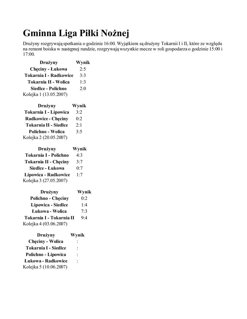 Gminna Liga Piłki Nożnej Drużyny rozgrywają spotkania o godzinie 16:00. Wyjątkiem są drużyny Tokarnii I i II, które ze względu na remont boiska w następnej rundzie, rozgrywają wszystkie mecze w roli gospodarza o godzinie 15:00 i 17:00. Drużyny Wynik Chęciny - Łukowa 2:5 Tokarnia I - Radkowice 3:3 Tokarnia II - Wolica 1:3 Siedlce - Polichno 2:0 Kolejka 1 (13.05.2007) Drużyny Wynik Tokarnia I - Lipowica 3:2 Radkowice - Chęciny 0:2 Tokarnia II - Siedlce 2:1 Polichno - Wolica 3:5 Kolejka 2 (20.05.2007) Drużyny Wynik Tokarnia I - Polichno 4:3 Tokarnia II - Chęciny 3:7 Siedlce - Łukowa 0:7 Lipowica - Radkowice 1:7 Kolejka 3 (27.05.2007) Drużyny Wynik Polichno - Chęciny 0:2 Lipowica - Siedlce 1:4 Łukowa - Wolica 7:3 Tokarnia I - Tokarnia II 9:4 Kolejka 4 (03.06.2007) Drużyny Wynik Chęciny - Wolica : Tokarnia I - Siedlce : Polichno - Lipowica : Łukowa - Radkowice : Kolejka 5 (10.06.2007) Drużyny Wynik Tokarnia I - Wolica (godz. 17:00) : Lipowica - Chęciny : Radkowice - Polichno : Tokarnia II - Łukowa (godz. 15:00) : Kolejka 6 (17.06.2007) Drużyny Wynik Tokarnia I - Chęciny (godz. 15:00) : Łukowa - Lipowica : Tokarnia II - Radkowice (godz. 17:00) : Wolica - Siedlce : Kolejka 7 (24.06.2007) Drużyny Wynik Tokarnia II - Lipowica : Wolica - Radkowice : Chęciny - Siedlce : Polichno - Łukowa : Kolejka 8 (01.07.2007) Drużyny Wynik Wolica - Lipowica : Tokarnia I - Łukowa (godz. 17:00) : Radkowice - Siedlce : Tokarnia II - Polichno (godz. 15:00) : kolejka 9 (08.07.2007)