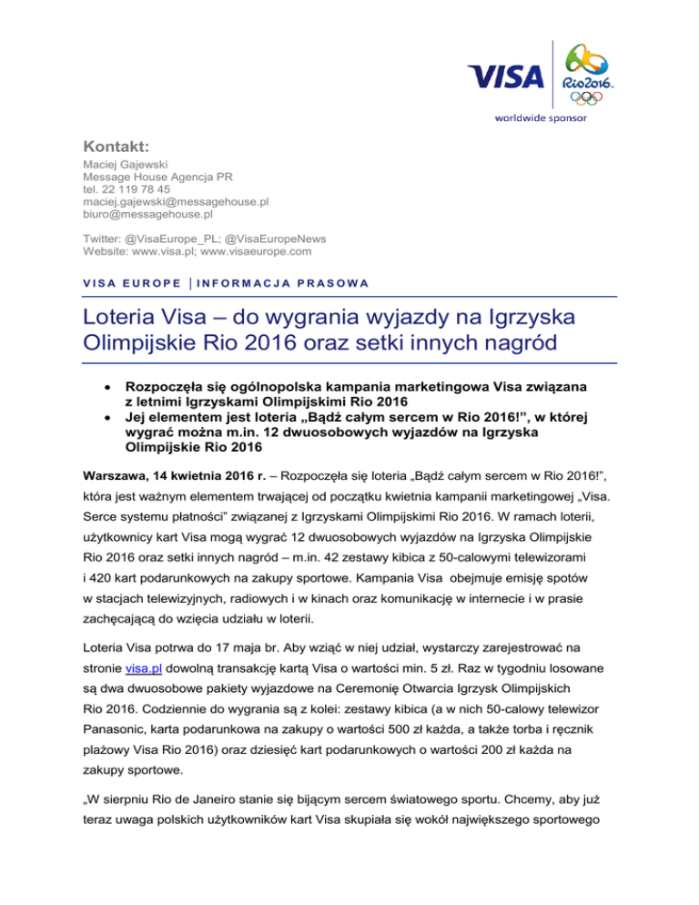 Kontakt: Maciej Gajewski Message House Agencja PR tel. 22 119 78 45 [email protected] [email protected] Twitter: @VisaEurope_PL; @VisaEuropeNews Website: www.visa.pl; www.visaeurope.com VISA EUROPE │INFORM ACJA PRASOWA Loteria Visa – do wygrania wyjazdy na Igrzyska Olimpijskie Rio 2016 oraz setki innych nagród Rozpoczęła się ogólnopolska kampania marketingowa Visa związana z letnimi Igrzyskami Olimpijskimi Rio 2016 Jej elementem jest loteria „Bądź całym sercem w Rio 2016!”, w której wygrać można m.in. 12 dwuosobowych wyjazdów na Igrzyska Olimpijskie Rio 2016 Warszawa, 14 kwietnia 2016 r. – Rozpoczęła się loteria „Bądź całym sercem w Rio 2016!”, która jest ważnym elementem trwającej od początku kwietnia kampanii marketingowej „Visa. Serce systemu płatności” związanej z Igrzyskami Olimpijskimi Rio 2016. W ramach loterii, użytkownicy kart Visa mogą wygrać 12 dwuosobowych wyjazdów na Igrzyska Olimpijskie Rio 2016 oraz setki innych nagród – m.in. 42 zestawy kibica z 50-calowymi telewizorami i 420 kart podarunkowych na zakupy sportowe. Kampania Visa obejmuje emisję spotów w stacjach telewizyjnych, radiowych i w kinach oraz komunikację w internecie i w prasie zachęcającą do wzięcia udziału w loterii. Loteria Visa potrwa do 17 maja br. Aby wziąć w niej udział, wystarczy zarejestrować na stronie visa.pl dowolną transakcję kartą Visa o wartości min. 5 zł. Raz w tygodniu losowane są dwa dwuosobowe pakiety wyjazdowe na Ceremonię Otwarcia Igrzysk Olimpijskich Rio 2016. Codziennie do wygrania są z kolei: zestawy kibica (a w nich 50-calowy telewizor Panasonic, karta podarunkowa na zakupy o wartości 500 zł każda, a także torba i ręcznik plażowy Visa Rio 2016) oraz dziesięć kart podarunkowych o wartości 200 zł każda na zakupy sportowe. „W sierpniu Rio de Janeiro stanie się bijącym sercem światowego sportu. Chcemy, aby już teraz uwaga polskich użytkowników kart Visa skupiała się wokół największego sportowego wydarzenia na świecie” – komentuje Jakub Kiwior, dyrektor ds. rozwoju biznesu i marketingu w regionie Europy Środkowo-Wschodniej, Visa Europe. „W komunikacji marketingowej związanej z zaangażowaniem Visa we wsparcie Igrzysk Olimpijskich Rio 2016 wykorzystaliśmy motyw bijącego serca. Visa jest bijącym sercem systemu płatności, a Igrzyska Olimpijskie gwarantują przyspieszone bicie serca milionów ludzi na całym świecie – od sportowców rywalizujących o najwyższe trofea po kibiców wspierających ich z trybun i przed telewizorami” – dodaje Jakub Kiwior. Bohaterem spotu reklamowego Visa Rio 2016 (do obejrzenia tutaj: https://youtu.be/kPzzQvujYxw) jest lekkoatleta. W spocie widzimy sceny z jego treningów, życia prywatnego i startu na zawodach – całość przeplatają animacje obrazujące pracę ludzkiego organizmu oraz serca, a w tle słychać jego bicie. „Każdy z nas zna mechanizm, dzięki któremu żyjemy. Jego centralnym ośrodkiem jest serce, pracujące ‘w tle’ naszego życia bez chwili wytchnienia. Podobnie jak Visa, która jest dla konsumentów zawsze i wszędzie, gdy chcą dokonać płatności” – dodaje Jakub Kiwior, Visa Europe. Spoty przygotowano w czterech wersjach: 15-, 20-, 30- i 60-sekundowej. Dodatkowo w wersji 30-sekundowej został przygotowany spot promujący loterię – do obejrzenia tutaj: https://youtu.be/Mb9lnk2vna0. Ich emisja obejmuje ogólnopolską telewizję oraz wybrane sieci kin. Kampania przewiduje również emisję spotów w radiu, działania marketingowe na głównych portalach internetowych, w serwisie YouTube oraz w prasie. Materiały reklamowe w komunikacji ze swoimi klientami wykorzystują także banki-wydawcy kart Visa. Regulamin oraz więcej informacji nt. loterii „Bądź całym sercem w Rio!” dostępne są pod adresem www.visa.pl/zlota-strefa/promocje/rio2016/. – koniec – Visa Europe Visa Europe, organizacja zajmująca się technologiami płatniczymi, stanowi własność instytucji członkowskich – banków oraz innych firm świadczących usługi płatnicze z 38 krajów, które sprawują nadzór nad jej zarządem. Visa Europe znajduje się w samym centrum ekosystemu płatności, dostarczając usługi oraz infrastrukturę, które umożliwiają dokonywanie płatności elektronicznych milionom konsumentów, firm i instytucji sektora publicznego w Europie. Instytucje członkowskie Visa Europe zajmują się wydawnictwem kart płatniczych i świadczeniem usług akceptacji kart na rzecz detalistów, a także ustalają poziom opłat pobieranych od użytkowników kart i punktów usługowo-handlowych. Visa Europe jest również największym w Europie dostawcą usług przetwarzania danych transakcji, który obsługuje ponad 18 miliardów transakcji rocznie. W Europie zostało wydanych ponad 500 milionów kart Visa, którymi jest już opłacane jedno na każde 6 euro wydawane w Europie na konsumpcję. Całkowita wartość transakcji z użyciem kart Visa w całej Europie przekracza poziom 2 bilionów euro rocznie, z czego płatności w punktach handlowo-usługowych wynoszą 1,5 biliona euro. 2 Organizacja Visa Europe jest niezależną firmą posiadającą wyłączną, nieodwołalną i nieograniczoną w czasie licencję na posługiwanie się marką Visa na obszarze Europy. Visa Europe współpracuje z Visa Inc. na rzecz wzajemnej globalnej akceptacji na obszarze ponad 200 krajów i terytoriów. Strona internetowa: www.visaeurope.com; Twitter: @VisaEuropeNews Visa Europe w Polsce – strona internetowa: www.visa.pl; Twitter: @VisaEurope_PL 3