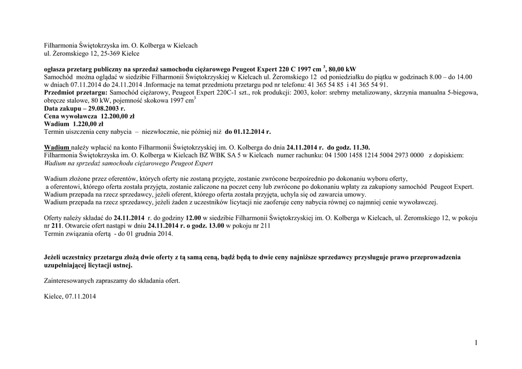 Filharmonia Świętokrzyska im. O. Kolberga w Kielcach ul. Żeromskiego 12, 25-369 Kielce ogłasza przetarg publiczny na sprzedaż samochodu ciężarowego Peugeot Expert 220 C 1997 cm 3, 80,00 kW Samochód można oglądać w siedzibie Filharmonii Świętokrzyskiej w Kielcach ul. Żeromskiego 12 od poniedziałku do piątku w godzinach 8.00 – do 14.00 w dniach 07.11.2014 do 24.11.2014 .Informacje na temat przedmiotu przetargu pod nr telefonu: 41 365 54 85 i 41 365 54 91. Przedmiot przetargu: Samochód ciężarowy, Peugeot Expert 220C-1 szt., rok produkcji: 2003, kolor: srebrny metalizowany, skrzynia manualna 5-biegowa, obręcze stalowe, 80 kW, pojemność skokowa 1997 cm3 Data zakupu – 29.08.2003 r. Cena wywoławcza 12.200,00 zł Wadium 1.220,00 zł Termin uiszczenia ceny nabycia – niezwłocznie, nie później niż do 01.12.2014 r. Wadium należy wpłacić na konto Filharmonii Świętokrzyskiej im. O. Kolberga do dnia 24.11.2014 r. do godz. 11.30. Filharmonia Świętokrzyska im. O. Kolberga w Kielcach BZ WBK SA 5 w Kielcach numer rachunku: 04 1500 1458 1214 5004 2973 0000 z dopiskiem: Wadium na sprzedaż samochodu ciężarowego Peugeot Expert Wadium złożone przez oferentów, których oferty nie zostaną przyjęte, zostanie zwrócone bezpośrednio po dokonaniu wyboru oferty, a oferentowi, którego oferta została przyjęta, zostanie zaliczone na poczet ceny lub zwrócone po dokonaniu wpłaty za zakupiony samochód Peugeot Expert. Wadium przepada na rzecz sprzedawcy, jeżeli oferent, którego oferta została przyjęta, uchyla się od zawarcia umowy. Wadium przepada na rzecz sprzedawcy, jeżeli żaden z uczestników licytacji nie zaoferuje ceny nabycia równej co najmniej cenie wywoławczej. Oferty należy składać do 24.11.2014 r. do godziny 12.00 w siedzibie Filharmonii Świętokrzyskiej im. O. Kolberga w Kielcach, ul. Żeromskiego 12, w pokoju nr 211. Otwarcie ofert nastąpi w dniu 24.11.2014 r. o godz. 13.00 w pokoju nr 211 Termin związania ofertą - do 01 grudnia 2014. Jeżeli uczestnicy przetargu złożą dwie oferty z tą samą ceną, bądź będą to dwie ceny najniższe sprzedawcy przysługuje prawo przeprowadzenia uzupełniającej licytacji ustnej. Zainteresowanych zapraszamy do składania ofert. Kielce, 07.11.2014 1