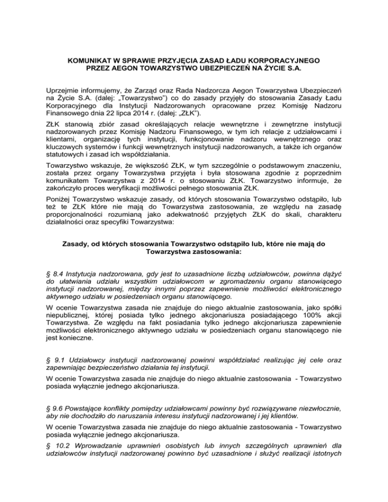 KOMUNIKAT W SPRAWIE PRZYJĘCIA ZASAD ŁADU KORPORACYJNEGO PRZEZ AEGON TOWARZYSTWO UBEZPIECZEŃ NA ŻYCIE S.A. Uprzejmie informujemy, że Zarząd oraz Rada Nadzorcza Aegon Towarzystwa Ubezpieczeń na Życie S.A. (dalej: „Towarzystwo”) co do zasady przyjęły do stosowania Zasady Ładu Korporacyjnego dla Instytucji Nadzorowanych opracowane przez Komisję Nadzoru Finansowego dnia 22 lipca 2014 r. (dalej: „ZŁK”). ZŁK stanowią zbiór zasad określających relacje wewnętrzne i zewnętrzne instytucji nadzorowanych przez Komisję Nadzoru Finansowego, w tym ich relacje z udziałowcami i klientami, organizację tych instytucji, funkcjonowanie nadzoru wewnętrznego oraz kluczowych systemów i funkcji wewnętrznych instytucji nadzorowanych, a także ich organów statutowych i zasad ich współdziałania. Towarzystwo wskazuje, że większość ZŁK, w tym szczególnie o podstawowym znaczeniu, została przez organy Towarzystwa przyjęta i była stosowana zgodnie z poprzednim komunikatem Towarzystwa z 2014 r. o stosowaniu ZŁK. Towarzystwo informuje, że zakończyło proces weryfikacji możliwości pełnego stosowania ZŁK. Poniżej Towarzystwo wskazuje zasady, od których stosowania Towarzystwo odstąpiło, lub też te ZŁK które nie mają do Towarzystwa zastosowania, ze względu na zasadę proporcjonalności rozumianą jako adekwatność przyjętych ZŁK do skali, charakteru działalności oraz specyfiki Towarzystwa: Zasady, od których stosowania Towarzystwo odstąpiło lub, które nie mają do Towarzystwa zastosowania: § 8.4 Instytucja nadzorowana, gdy jest to uzasadnione liczbą udziałowców, powinna dążyć do ułatwiania udziału wszystkim udziałowcom w zgromadzeniu organu stanowiącego instytucji nadzorowanej, między innymi poprzez zapewnienie możliwości elektronicznego aktywnego udziału w posiedzeniach organu stanowiącego. W ocenie Towarzystwa zasada nie znajduje do niego aktualnie zastosowania, jako spółki niepublicznej, której posiada tylko jednego akcjonariusza posiadającego 100% akcji Towarzystwa. Ze względu na fakt posiadania tylko jednego akcjonariusza zapewnienie możliwości elektronicznego aktywnego udziału w posiedzeniach organu stanowiącego nie jest konieczne. § 9.1 Udziałowcy instytucji nadzorowanej powinni współdziałać realizując jej cele oraz zapewniając bezpieczeństwo działania tej instytucji. W ocenie Towarzystwa zasada nie znajduje do niego aktualnie zastosowania - Towarzystwo posiada wyłącznie jednego akcjonariusza. § 9.6 Powstające konflikty pomiędzy udziałowcami powinny być rozwiązywane niezwłocznie, aby nie dochodziło do naruszania interesu instytucji nadzorowanej i jej klientów. W ocenie Towarzystwa zasada nie znajduje do niego aktualnie zastosowania - Towarzystwo posiada wyłącznie jednego akcjonariusza. § 10.2 Wprowadzanie uprawnień osobistych lub innych szczególnych uprawnień dla udziałowców instytucji nadzorowanej powinno być uzasadnione i służyć realizacji istotnych celów działania instytucji nadzorowanej. Posiadanie takich uprawnień przez udziałowców powinno być odzwierciedlone w podstawowym akcie ustrojowym tej instytucji. W ocenie Towarzystwa zasada nie znajduje do niego aktualnie zastosowania - Towarzystwo posiada wyłącznie jednego akcjonariusza, Statut Towarzystwa nie przyznaje żadnych uprawnień osobistych akcjonariuszowi. § 12.1 Udziałowcy są odpowiedzialni za niezwłoczne dokapitalizowanie instytucji nadzorowanej w sytuacji, gdy jest to niezbędne do utrzymania kapitałów własnych instytucji nadzorowanej na poziomie wymaganym przez przepisy prawa lub regulacje nadzorcze, a także gdy wymaga tego bezpieczeństwo instytucji nadzorowanej. Jedyny akcjonariusz Towarzystwa wypowiedział się co do możliwości stosowania wskazanej zasady, podkreślając, że uwzględnia krajowe wymogi regulacyjne oraz interesy podmiotów, za pomocą których wykonuje działalność gospodarczą. Natomiast jako spółka prawa holenderskiego podejmuje własne, niezależne decyzje kierując się interesem akcjonariuszy oraz regulacjami własnego prawa krajowego. Z tego względu zainwestowanie dodatkowych środków zależy od każdorazowej decyzji akcjonariusza. Na tej podstawie akcjonariusz zapewnia, że będzie starał się realizować wskazaną zasadę, natomiast nie jest w stanie zagwarantować jej bezwarunkowego przestrzegania. § 12.2 Udziałowcy powinni być odpowiedzialni za niezwłoczne dostarczenie instytucji nadzorowanej wsparcia finansowego w sytuacji, gdy jest to niezbędne do utrzymania płynności instytucji nadzorowanej na poziomie wymaganym przez przepisy prawa lub regulacje nadzorcze, a także gdy wymaga tego bezpieczeństwo instytucji nadzorowanej. Patrzy wyjaśnienia do § 12.1 § 12.3 Decyzje w zakresie wypłaty dywidendy powinny być uzależnione od potrzeby utrzymania odpowiedniego poziomu kapitałów własnych oraz realizacji strategicznych celów instytucji nadzorowanej, a także powinny uwzględniać rekomendacje i indywidualne zalecenia wydane przez organy nadzoru. Akcjonariusz Towarzystwa regularnie i z należytą starannością monitoruje sytuację finansową Towarzystwa. W szczególności z uwagę przeanalizuje każdą sytuację, która może prowadzić do destabilizacji finansowej Towarzystwa, a każda decyzje odnośnie podwyższenia kapitału lub wypłaty dywidendy zostanie podjęta z uwzględnieniem interesu Towarzystwa oraz interesu jego klientów. Przy czym akcjonariusz wskazuje, że dotychczas zawsze brał pod uwagę wytyczne organów nadzoru dotyczące wypłaty dywidendy. § 19.2 Indywidualne kompetencje poszczególnych członków kolegialnego organu nadzorującego powinny uzupełniać się w taki sposób, aby umożliwiać zapewnienie odpowiedniego poziomu kolegialnego sprawowania nadzoru nad wszystkimi obszarami działania instytucji nadzorowanej. Akcjonariusz jest zdania, że zapewnienie odpowiedniego poziomu nadzoru jest możliwe także wtedy, gdy kwalifikacje poszczególn