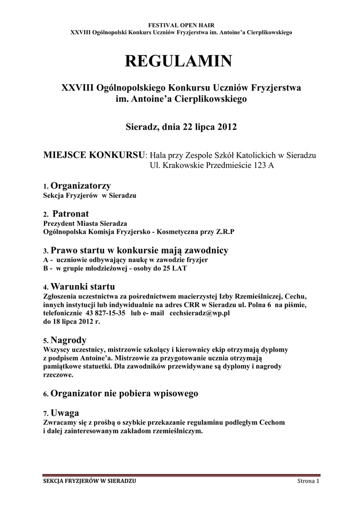 FESTIVAL OPEN HAIR XXVIII Ogólnopolski Konkurs Uczniów Fryzjerstwa im. Antoine’a Cierplikowskiego REGULAMIN XXVIII Ogólnopolskiego Konkursu Uczniów Fryzjerstwa im. Antoine’a Cierplikowskiego Sieradz, dnia 22 lipca 2012 MIEJSCE KONKURSU: Hala przy Zespole Szkół Katolickich w Sieradzu Ul. Krakowskie Przedmieście 123 A 1. Organizatorzy Sekcja Fryzjerów w Sieradzu 2. Patronat Prezydent Miasta Sieradza Ogólnopolska Komisja Fryzjersko - Kosmetyczna przy Z.R.P 3. Prawo startu w konkursie mają zawodnicy A - uczniowie odbywający naukę w zawodzie fryzjer B - w grupie młodzieżowej - osoby do 25 LAT 4. Warunki startu Zgłoszenia uczestnictwa za pośrednictwem macierzystej Izby Rzemieślniczej, Cechu, innych instytucji lub indywidualnie na adres CRR w Sieradzu ul. Polna 6 na piśmie, telefonicznie 43 827-15-35 lub e- mail [email protected] do 18 lipca 2012 r. 5. Nagrody Wszyscy uczestnicy, mistrzowie szkolący i kierownicy ekip otrzymają dyplomy z podpisem Antoine’a. Mistrzowie za przygotowanie ucznia otrzymają pamiątkowe statuetki. Dla zawodników przewidywane są dyplomy i nagrody rzeczowe. 6. Organizator nie pobiera wpisowego 7. Uwaga Zwracamy się z prośbą o szybkie przekazanie regulaminu podległym Cechom i dalej zainteresowanym zakładom rzemieślniczym. SEKCJA FRYZJERÓW W SIERADZU Strona 1 FESTIVAL OPEN HAIR XXVIII Ogólnopolski Konkurs Uczniów Fryzjerstwa im. Antoine’a Cierplikowskiego Jednym z priorytetów XXVIII Ogólnopolskiego Konkursu Uczniów Fryzjerstwa im. Antoine’a Cierplikowskiego jest wyłonienie Zwycięzcy SIERADZ OPEN HAIR FESTIVAL 2012 w klasyfikacji damskiej i męskiej. Ten prestiżowy Konkurs odbędzie się pod patronatem Prezydenta Miasta Sieradza i Ogólnopolskiej Komisji Fryzjersko Kosmetycznej i stanowi dodatkową kategorię obok Laureatów wyłonionych w XXVIII Ogólnopolskim Konkursie Uczniów Fryzjerstwa im. Antoine’a Cierplikowskiego. W klasyfikacji damskiej o wyborze zwycięzcy decyduje suma punktów w następujących konkurencjach: 1) Fryzura Dzienna Konsumencka 2) Fryzura Wieczorowa 3) Fryzura Twoich Marzeń W klasyfikacji męskiej pod uwagę brana będzie suma punktów z następujących konkurencji: 1) Modelowanie Fryzury z Długich Włosów 2) Modelowanie Fryzury Klasycznej SEKCJA FRYZJERÓW W SIERADZU Strona 2 FESTIVAL OPEN HAIR XXVIII Ogólnopolski Konkurs Uczniów Fryzjerstwa im. Antoine’a Cierplikowskiego KONKURS OBEJMUJE NASTĘPUJĄCE KONKURENCJE FRYZJERSTWO DAMSKIE I. W y c i s k a n i e f a l n a mokro Przed rozpoczęciem konkurencji włosy muszą być zmoczone i zaczesane gładko do tyłu. 1. PRODUKTY - wszystkie produkty dozwolone 2. NARZĘDZIA - można użyć klipsów do wykończenia, włosy nie mogą być spięte 3. KOLOR WŁOSÓW - kolory włosów są dozwolone. Zabronione są kolory neonowe i kolorowe spray, nie wolno używać brokatu 4. CZAS TRWANIA - 25 minut II. F r y z u r a d z i e n n a k o n s u m e n c k a Fryzura dla dziewczyny wybierającej się na casting modelek - pokaz mody Mokre włosy - przed rozpoczęciem konkurencji włosy muszą być mokre i gładko zaczesane do tyłu głowy. Długość włosów dowolna. Zadanie: wykonanie fryzury 1. 2. 3. 4. 5. PRODUKTY - wszystkie produkty dozwolone NARZĘDZIA - wszystkie narzędzia modelujące dozwolone KOLOR WŁOSÓW - według uznania uczestnika UBIÓR – strój, akcesoria, makijaż muszą harmonizować z fryzurą CZAS TRWANIA - 30 minut III. F r y z u r a w i e c z o r o w a Fryzura na specjalną okazję /wizytowa/ - plecionki i warkocze z długich włosów Włosy rozpuszczone i gładko zaczesane do tyłu głowy/, mokre lub suche - wg uznania zawodnika/ 1. FRYZURA - bez dopinek, wykonana wyłącznie przy użyciu rąk, grzebieni i szczotek 2. PRODUKTY - dozwolone wszystkie produkty 3. KOLOR WŁOSÓW - według uznania uczestnika 4. MAKIJAŻ - stosowny do fryzury wizytowej 5. CZAS WYKONANIA - 30 minut SEKCJA FRYZJERÓW W SIERADZU Strona 3 FESTIVAL OPEN HAIR XXVIII Ogólnopolski Konkurs Uczniów Fryzjerstwa im. Antoine’a Cierplikowskiego IV . F r y z u r a t w o i c h m a r z e ń Fryzura według własnego pomysłu Mokre włosy - przed rozpoczęciem konkurencji włosy muszą być mokre i gładko zaczesane do tyłu głowy 1. DŁUGOŚĆ WŁOSÓW - dowolna 2. NARZĘDZIA - wszystkie dozwolone 3. KOLORY - bez ograniczeń, możliwość zastosowania wszelkich środków koloryzujących 4. CZAS TRWANIA - 25 minut V. F r y z u r a ś l u b n a z d ł u g i c h w ł o s ó w Fryzura ślubna na długich włosach wykonana na główkach treningowych lub modelach. Włosy - przed rozpoczęciem konkurencji włosy mają być suche, rozpuszczone, gładko zaczesane do tyłu. 1. PRODUKTY – wszystkie dozwolone 2. NARZĘDZIA - wszystkie narzędzia modelujące dozwolone 3. KOLOR WŁOSÓW - wybór koloru jest dowolny. Zabronione są kolory neonowe kolor spray’e i brokaty 4. FRYZURA - fryzura ma charakter elegancki 5. UBIÓR - kreacja i makijaż muszą mieć charakter ślubny, wszystkie materiały do dekoracji są dozwolone, ale nie mogą przykrywać więcej niż 25% fryzury. Treski, dopinki i peruki są zabronione 6. CZAS WYKONANIA - 30 minut UWAGA! KONKURENCJE MOGĄ BYĆ WYKONANE NA MODELACH LUB MANEKINACH Punktacja: max 30 punktów, noty minimalne w zależności od ilości zawodników. Zawodnik może startować w kilku lub jednej wybranej konkurencji. Model nie może pomagać zawodnikowi przy fryzurze, suszyć, dotykać włosów. Dopuszcza się trzymanie przez modela narzędzi fryzjerskich. SEKCJA FRYZJERÓW W SIERADZU Strona 4 FESTIVAL OPEN HAIR XXVIII Ogólnopolski Konkurs Uczniów Fryzjerstwa im. Antoine’a Cierplikowskiego Model, manekin w czasie przejścia jury znajdują się twarzą do lustra. Za nieprzestrzeganie zasad i ustaleń zawartych w regulaminie, członkowie Komisji Kontroli mają prawo przyznać do 3 punktów karnych za każde uchybienie. Zabroniona jest zamiana numerów lustra. SEKCJA FRYZJERÓW W SIERADZU Strona 5 FESTIVAL OPEN HAIR XXVIII Ogólnopolski Konkurs 
