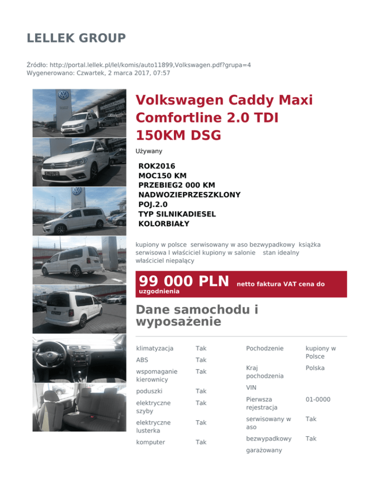 LELLEK GROUP Źródło: http://portal.lellek.pl/lel/komis/auto11899,Volkswagen.pdf?grupa=4 Wygenerowano: Czwartek, 2 marca 2017, 07:57 Volkswagen Caddy Maxi Comfortline 2.0 TDI 150KM DSG Używany ROK2016 MOC150 KM PRZEBIEG2 000 KM NADWOZIEPRZESZKLONY POJ.2.0 TYP SILNIKADIESEL KOLORBIAŁY kupiony w polsce serwisowany w aso bezwypadkowy książka serwisowa I właściciel kupiony w salonie stan idealny właściciel niepalący 99 000 PLN netto faktura VAT cena do uzgodnienia Dane samochodu i wyposażenie klimatyzacja Tak Pochodzenie kupiony w Polsce ABS Tak wspomaganie kierownicy Tak Kraj pochodzenia Polska poduszki Tak elektryczne szyby Tak Pierwsza rejestracja 01-0000 elektryczne lusterka Tak serwisowany w aso Tak komputer Tak bezwypadkowy Tak VIN garażowany Skrzynia automatyczna I właściciel Tak kupiony w salonie Tak homologacja Marcin Sojka zapytaj mobile +48 693 153 245 Gwarancja mechaniczna 24 miesięcy perforacja nadwozia 144 miesięcy Ubezpieczenie dostępne Kredyt Kredyt Tak tunning Handlowiec Ubezpieczenie książka serwisowa dostępny Zeskanuj kod, aby zobaczyć ofertę online stan idealny Tak właściciel niepalący Tak Tak halogeny Tak Opis dodatkowy AUTO CENTRUM GLIWICE LELLEK GROUP SP. Z O.O. SP.K. VOLKSWAGEN CADDY 4 MAXI COMFORTLINE 2.0 TDI 110 kW DSG 6-G kolor: B4B4 biały - pakiet Cool&Find (Climatronic, nawigacja Discover Media, MFAPlus, system rozpoz.zmęczenie kierowcy, - alarm antywłamaniowy - koło zapasowe z podnośnikiem, obręcz aluminiowa - siedzenia kierowcy i pasażera ogrzewane - szyba przednia ogrzewana - system obserwacji otoczenia Front Assist z funkcją awaryjnego hamowania w mieście (City Emergency Braking) - wskaźnik ciśnienia w oponach "Plus" - siedzenia kierowcy i pasażera z regulacją podparcia odcinka lędźwiowego - mapa Europy do nawigacji, karta SD - czujniki parkowania w tylnym zderzaku - światła przeciwmgielne z przodu zintegrowane ze zderzakiem z funkcją doświetlania zakrętów - przygotowanie do telefonu komórkowego / moduł internetowy WLAN - pakiet dla palących (popielniczka i zapalniczka) - reflektory bi-ksenonowe, światła do jazdy dziennej typu LED - kierownica wielofunkcyjna, skórzana, skórzana dźwignia zmiany biegów i hamulca ręcznego, MFA Plus - system Car-Net "Guide & Inform", bezpłatny przez 3 lata po zakupie - obręcze kół ze stopów metali lekkich "Canyon" 6Jx17 (odcień czarny) UWAGA: SAMOCHÓD JEST SAMOCHODEM SŁUŻBOWYM I MOŻLIWY BĘDZIE DO ODBIORU NA PRZEŁOMIE PAŹDZIERNIKA/LISTOPADA ROKU 2016 Marcin Sojka Specjalista ds.Sprzedaży Samochodów Użytkowych | LELLEK Group kom. 693 153 245 E-mail: marcin.sojka lellek com pl Telefon: +48 32 335 92 21 SAMOCHÓD ZNAJDUJE SIĘ NA RÓŻNYCH AUKCJACH I PORTALACH. JEDYNYM POTWIERDZENIEM ZAKUPU SAMOCHODU JEST PODPISANIE UMOWY W NASZYM SALONIE. ZAMIESZCZONE OGŁOSZENIE SŁUŻY JEDYNIE DO PRZYBLIŻENIA NASZEJ BARDZO BOGATEJ OFERTY SAMOCHODÓW UŻYTKOWYCH. Nota prawna Informacja nie stanowi oferty w rozumieniu art. 66 Kodeksu Cywilnego. Podane dane mają charakter wyłącznie informacyjny. Pełna informacja dostępna jest u handlowca. Sprzedający nie odpowiada za ewentualne błędy lub nieaktualność ogłoszen Nota prawna Informacja nie stanowi oferty w rozumieniu art. 66 Kodeksu Cywilnego. Podane dane mają charakter wyłącznie informacyjny. Pełna informacja dostępna jest u handlowca. Sprzedający nie odpowiada za ewentualne błędy lub nieaktualność ogłoszenia.