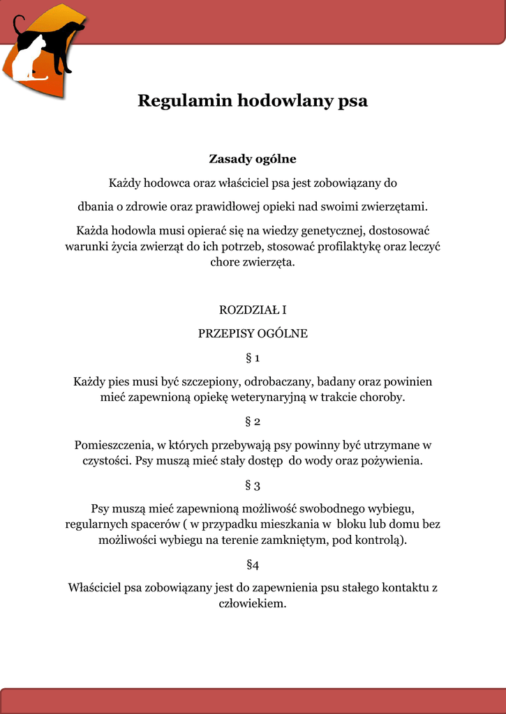 Regulamin hodowlany psa Zasady ogólne Każdy hodowca oraz właściciel psa jest zobowiązany do dbania o zdrowie oraz prawidłowej opieki nad swoimi zwierzętami. Każda hodowla musi opierać się na wiedzy genetycznej, dostosować warunki życia zwierząt do ich potrzeb, stosować profilaktykę oraz leczyć chore zwierzęta. ROZDZIAŁ I PRZEPISY OGÓLNE §1 Każdy pies musi być szczepiony, odrobaczany, badany oraz powinien mieć zapewnioną opiekę weterynaryjną w trakcie choroby. §2 Pomieszczenia, w których przebywają psy powinny być utrzymane w czystości. Psy muszą mieć stały dostęp do wody oraz pożywienia. §3 Psy muszą mieć zapewnioną możliwość swobodnego wybiegu, regularnych spacerów ( w przypadku mieszkania w bloku lub domu bez możliwości wybiegu na terenie zamkniętym, pod kontrolą). §4 Właściciel psa zobowiązany jest do zapewnienia psu stałego kontaktu z człowiekiem. §5 Ciężarna suczka musi mieć zapewniony spokój oraz w razie potrzeby, opiekę weterynaryjną. §6 Szczenięta mogą trafić do nowego właściciela dopiero po ukończeniu przez nie 6 tygodnia życia. Przed trafieniem do nowego właściciela szczenięta powinny być co najmniej 2 razy odrobaczone i zaszczepione szczepionką właściwą do wieku. §8 Niedopuszczalne jest trzymanie suczki i/lub suczki ze szczeniętami w klatce. Szczenięta muszą przebywać w pomieszczeniach, w których będą swobodnie się rozwijały. Szczenięta muszą mieć zapewnione miejsce do aktywnego życia, zabawy ,wybiegu na świeżym powietrzu oraz światła dziennego w zamkniętym pomieszczeniu. §9 Zabroniona jest sprzedaż szczeniąt do sklepów zoologicznych, do ośrodków badawczych prowadzących fizyczne badania, testy lub eksperymenty na zwierzętach. §11 Hodowcą jest każdy członek zarejestrowany w SMZR. Rozdział II Suki Hodowlane §12 Do rozrodu dopuszcza się sukę, która ukończyła 12 miesięcy życia, jest wolna od wad genetycznych oraz rozwojowych i jest zarejestrowana w SMZR. §13 Suki dopuszczane do rozrodu powinny spełniać co najmniej średni standard danej rasy. §14 Dopuszcza się krycie suki w liczbie nie większej niż 2 razy w roku. Suka może być kryta do ukończenia przez nią 8 roku życia. Po tym okresie o dalszym kryciu może decydować lekarz weterynarii na prośbę hodowcy, oceniając stan suki jako bardzo dobry. §15 Hodowca powinien prowadzić planowe dopuszczanie suki, dopuszczać do krycia sukę zdrową w bardzo dobrej kondycji fizycznej. §16 Hodowca suki zobowiązany jest do zapewnienia suce hodowlanej oraz jej potomstwu dobrych warunków bytowych, z dostępem do świeżego powietrza oraz światła słonecznego. §17 Nie dopuszcza się krycia suki, psem będącym bezpośrednim rodzeństwem lub ojcem suki. Zalecane jest dopuszczanie suki do psa z innej linii genetycznej. §18 Dopuszczalne jest krycie suki, psem zrzeszonym w innej organizacji niż SMZR po dostarczeniu ksera rodowodu lub metryki psa oraz wypełnieniu podbitej przez organizację do której należy pies, karty krycia. Psy hodowlane §19 Pies dopuszczony do hodowli nie może wykazywać żadnych wad genetycznych oraz rozwojowych. Pies kryjący powinien spełniać co najmniej średni standard danej rasy. §20 Do hodowli dopuszcza się psy zarejestrowane w SMZR §21 Hodowca jest zobowiązany do zapewnienia psu dobrych warunków bytowania z dostępem do świeżego powietrza oraz światła słonecznego, utrzymywać go w dobrej kondycji fizycznej oraz zdrowiu. §22 Niedopuszczalne jest trzymanie psa w klatce. §23 Hodowca powinien w sposób kontrolowany dopuszczać psa do własnych suczek hodowlanych. Rozdział III Rodowody / metryki §24 Każdy kociak urodzony z rodziców posiadających rodowód, zarejestrowanych w SMZR lub innej organizacji fenologicznej ma prawo do świadectwa urodzenia – rodowodu. §25 Wystawienie rodowodów dla szczeniąt odbywa się na podstawie karty zgłoszenia miotu oraz opłacenia kosztu wydania rodowodów. §26 Miot powinien być zgłoszony przez hodowcę przed ukończeniem przez szczenięta 4 tygodnia życia. §27 Jeżeli suczka była kryta psem z poza SMZR, do karty zgłoszenia miotu należy dołączyć doskonałej jakości ksero rodowodu lub metryki psa oraz kartę krycia potwierdzoną przez organizację do, której przynależy pies. §28 Hodowca zarejestrowany w SMZR ma obowiązek zgłoszenia każdego miotu, w celu wystawienia dla szczeniąt rodowodów/metryk. Rozdział IX Przepisy końcowe §29 Zaleca się spisywanie mów kupna/sprzedaży szczeniąt oraz krycia psem hodowlanym. §29 Imiona szczeniąt w poszczególnych miotach mogą rozpoczynać się na dowolną literę alfabetu. §30 W przypadku przekazania psa/suki innemu właścicielowi lub zgonu zwierzęcia zarejestrowanego w SMZR, w ciągu 2 miesięcy od zaistniałego faktu należy powiadomić SMZR drogą elektroniczną lub listową o zaistniałym fakcie. § 31 W przypadku zgubienia rodowodu/metryki psa/suki, należy niezwłocznie powiadomić o tym fakcie SMZR. § 32 Niniejszy regulamin wchodzi w życie z dniem 09.11.2012