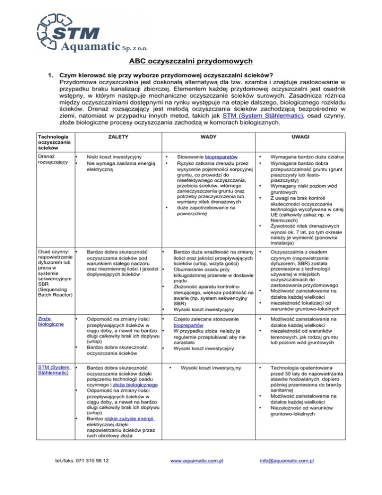 ABC oczyszczalni przydomowych 1. Czym kierować się przy wyborze przydomowej oczyszczalni ścieków? Przydomowa oczyszczalnia jest doskonałą alternatywą dla tzw. szamba i znajduje zastosowanie w przypadku braku kanalizacji zbiorczej. Elementem każdej przydomowej oczyszczalni jest osadnik wstępny, w którym następuje mechaniczne oczyszczanie ścieków surowych. Zasadnicza różnica między oczyszczalniami dostępnymi na rynku występuje na etapie dalszego, biologicznego rozkładu ścieków. Drenaż rozsączający jest metodą oczyszczania ścieków zachodzącą bezpośrednio w ziemi, natomiast w przypadku innych metod, takich jak STM (System Stählermatic), osad czynny, złoże biologiczne procesy oczyszczania zachodzą w komorach biologicznych. Technologia oczyszczania ścieków Drenaż rozsączający ZALETY • • WADY • • Niski koszt inwestycyjny Nie wymaga zasilania energią elektryczną Stosowanie biopreparatów Ryzyko zatkania drenażu przez wysycenie pojemności sorpcyjnej gruntu, co prowadzi do nieefektywnego oczyszczania, przebicia ścieków, wtórnego zanieczyszczenia gruntu oraz potrzeby przeczyszczenia lub wymiany nitek drenażowych duże zapotrzebowanie na powierzchnię • UWAGI • • • • • Osad czynny: • napowietrzanie dyfuzorem lub praca w systemie sekwencyjnym SBR (Sequencing Batch Reactor) Bardzo dobra skuteczność • oczyszczania ścieków pod warunkiem stałego nadzoru oraz niezmiennej ilości i jakości • dopływających ścieków • • Złoże biologiczne • • STM (System Stählermatic) • • • Odporność na zmiany ilości • przepływających ścieków w ciągu doby, a nawet na bardzo • długi całkowity brak ich dopływu (urlop) Bardzo dobra skuteczność • oczyszczania ścieków Bardzo dobra skuteczność oczyszczania ścieków dzięki połączeniu technologii osadu czynnego i złoża biologicznego Odporność na zmiany ilości przepływających ścieków w ciągu doby, a nawet na bardzo długi całkowity brak ich dopływu (urlop) Bardzo niskie zużycie energii elektrycznej dzięki napowietrzaniu ścieków przez ruch obrotowy złoża tel./faks: 071 310 98 12 • Bardzo duża wrażliwość na zmiany ilości oraz jakości przepływających ścieków (urlop, wizyta gości) Obumieranie osadu przy kilkugodzinnej przerwie w dostawie prądu Złożoność aparatu kontrolnosterującego, większa podatność na awarie (np. system sekwencyjny SBR) Wysoki koszt inwestycyjny • Często zalecane stosowanie bioprepartów W przypadku złoża należy je regularnie przepłukiwać aby nie zarastało Wysoki koszt inwestycyjny • Wysoki koszt inwestycyjny • • • • • • www.aquamatic.com.pl Wymagana bardzo duża działka Wymagana bardzo dobra przepuszczalność gruntu (grunt piaszczysty lub ilastopiaszczysty) Wymagany niski poziom wód gruntowych Z uwagi na brak kontroli skuteczności oczyszczania technologia wycofywana w całej UE (całkowity zakaz np. w Niemczech) Żywotność nitek drenażowych wynosi ok. 7 lat, po tym okresie należy je wymienić (ponowna instalacja) Oczyszczalnia z osadem czynnym (napowietrzanie dyfuzorem, SBR) została przeniesiona z technologii używanej w miejskich oczyszczalniach do zastosowania przydomowego Możliwość zainstalowania na działce każdej wielkości niezależność lokalizacji od warunków gruntowo-lokalnych Możliwość zainstalowania na działce każdej wielkości niezależność od warunków terenowych, jak rodzaj gruntu lub poziom wód gruntowych Technologia opatentowana przed 30 laty do napowietrzania stawów hodowlanych, dopiero później przeniesiona do branży sanitarnej Możliwość zainstalowania na działce każdej wielkości Niezależność od warunków gruntowo-lokalnych [email protected] Przy podejmowaniu decyzji o zakupie oczyszczalni ścieków nie należy kierować się jedynie ceną, ale należy zwrócić uwagę na: • koszty eksploatacyjne (energia elektryczna, biopreparaty, prace serwisowe, części zamienne); • gwarancję: należy sprawdzić warunki, czas i przedmiot gwarancji (często zdarza się, że gwarancją są objęte jedynie zbiorniki, bez części mechanicznych); • certyfikat jakości – produkty oznakowane europejskim znakiem jakości CE spełniają wszelkie wymagania zawarte w normach polskich i unijnych; • skuteczność oczyszczania ścieków – każda oczyszczalnia powinna mieć udokumentowaną redukcję zanieczyszczeń (parametry ścieków oczyszczonych) oraz spełniać obowiązujące normy ochrony środowiska. 2. Co to jest technologia STM? Technologia Stählermatic (STM) powstała przed około 30 laty w Niemczech w związku z oczyszczaniem wód w stawach hodowlanych. Twórca systemu Theo Stähler, aby podnieść jakość wody, połączył w jeden proces technologiczny dwa systemy – osad czynny i złoże biologiczne w jednej komorze. Z czasem okazało się, że rozwiązanie to jest innowacyjne zarówno dla hodowców ryb jak i dla branży ściekowej. Proces oczyszczania ścieków następuje równocześnie dzięki swobodnie unoszącemu się osadowi czynnemu (biomasa w formie zawiesiny), jak i poprzez osiadłe mikroorganizmy znajdujące się na powierzchni rotujących tarcz (złoża biologicznego). System STM jest systemem hybrydowym łączącym w procesie oczyszczania dwa czynniki biologicznego rozkładu ścieków, a to wiąże się ze zwiększoną efektywnością usuwania zanieczyszczeń i małymi gabarytami oraz niskimi kosztami eksploatacyjnymi oczyszczalni. Więcej informacji (plik PDF, 221 kB). 3. Jaka jest zasada działania oczyszczalni Aquamatic STM? System STM jest w pełni biologiczną, opatentowaną metodą oczyszczania ścieków, opartą na połączeniu technologii osadu czynnego i złoża biologicznego w jednej komorze. Ścieki po podczyszczeniu w osadniku wstępnym (sedymentacja zawiesin i fermentacja osadów) grawitacyjnie kierowane są do komory biologicznej, gdzie podlegają biologicznym procesom rozkładu. Neutralizacja zanieczyszc