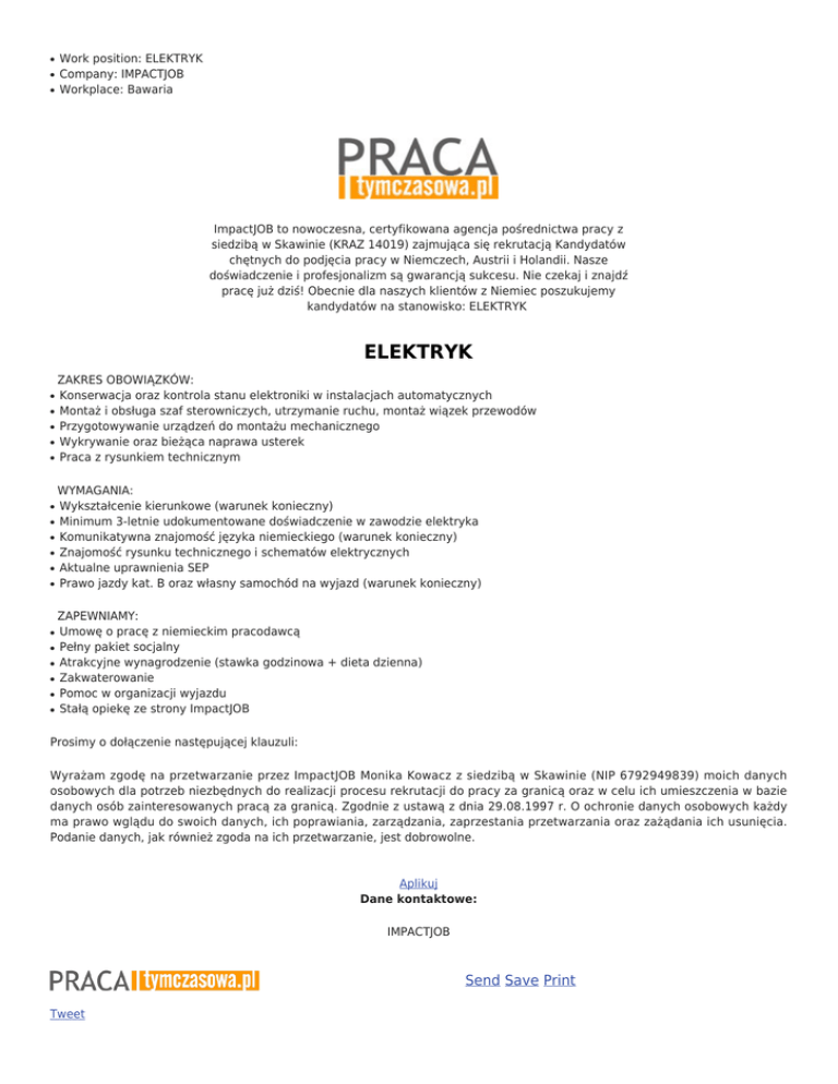 ● ● ● Work position: ELEKTRYK Company: IMPACTJOB Workplace: Bawaria ImpactJOB to nowoczesna, certyfikowana agencja pośrednictwa pracy z siedzibą w Skawinie (KRAZ 14019) zajmująca się rekrutacją Kandydatów chętnych do podjęcia pracy w Niemczech, Austrii i Holandii. Nasze doświadczenie i profesjonalizm są gwarancją sukcesu. Nie czekaj i znajdź pracę już dziś! Obecnie dla naszych klientów z Niemiec poszukujemy kandydatów na stanowisko: ELEKTRYK ELEKTRYK ● ● ● ● ● ● ● ● ● ● ● ● ● ● ● ● ● ZAKRES OBOWIĄZKÓW: Konserwacja oraz kontrola stanu elektroniki w instalacjach automatycznych Montaż i obsługa szaf sterowniczych, utrzymanie ruchu, montaż wiązek przewodów Przygotowywanie urządzeń do montażu mechanicznego Wykrywanie oraz bieżąca naprawa usterek Praca z rysunkiem technicznym WYMAGANIA: Wykształcenie kierunkowe (warunek konieczny) Minimum 3-letnie udokumentowane doświadczenie w zawodzie elektryka Komunikatywna znajomość języka niemieckiego (warunek konieczny) Znajomość rysunku technicznego i schematów elektrycznych Aktualne uprawnienia SEP Prawo jazdy kat. B oraz własny samochód na wyjazd (warunek konieczny) ZAPEWNIAMY: Umowę o pracę z niemieckim pracodawcą Pełny pakiet socjalny Atrakcyjne wynagrodzenie (stawka godzinowa + dieta dzienna) Zakwaterowanie Pomoc w organizacji wyjazdu Stałą opiekę ze strony ImpactJOB Prosimy o dołączenie następującej klauzuli: Wyrażam zgodę na przetwarzanie przez ImpactJOB Monika Kowacz z siedzibą w Skawinie (NIP 6792949839) moich danych osobowych dla potrzeb niezbędnych do realizacji procesu rekrutacji do pracy za granicą oraz w celu ich umieszczenia w bazie danych osób zainteresowanych pracą za granicą. Zgodnie z ustawą z dnia 29.08.1997 r. O ochronie danych osobowych każdy ma prawo wglądu do swoich danych, ich poprawiania, zarządzania, zaprzestania przetwarzania oraz zażądania ich usunięcia. Podanie danych, jak również zgoda na ich przetwarzanie, jest dobrowolne. Aplikuj Dane kontaktowe: IMPACTJOB Send Save Print Tweet