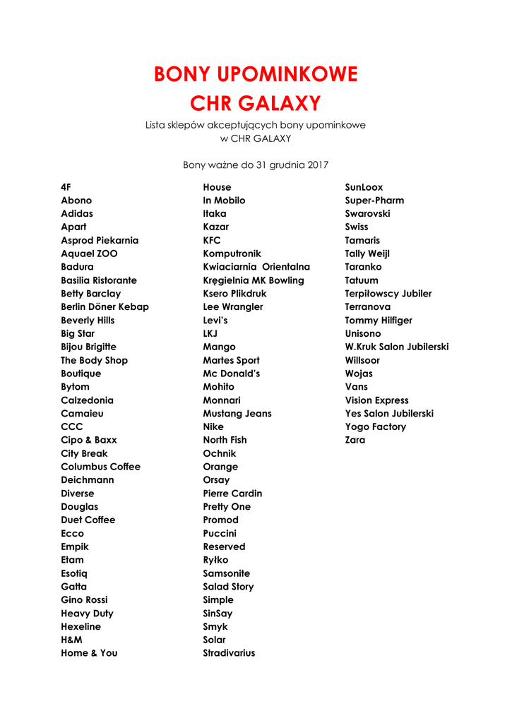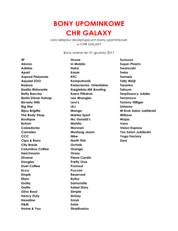 BONY UPOMINKOWE CHR GALAXY Lista sklepów akceptujących bony upominkowe w CHR GALAXY Bony ważne do 31 grudnia 2017 4F Abono Adidas Apart Asprod Piekarnia Aquael ZOO Badura Basilia Ristorante Betty Barclay Berlin Döner Kebap Beverly Hills Big Star Bijou Brigitte The Body Shop Boutique Bytom Calzedonia Camaieu CCC Cipo & Baxx City Break Columbus Coffee Deichmann Diverse Douglas Duet Coffee Ecco Empik Etam Esotiq Gatta Gino Rossi Heavy Duty Hexeline H&M Home & You House In Mobilo Itaka Kazar KFC Komputronik Kwiaciarnia Orientalna Kręgielnia MK Bowling Ksero Plikdruk Lee Wrangler Levi’s LKJ Mango Martes Sport Mc Donald’s Mohito Monnari Mustang Jeans Nike North Fish Ochnik Orange Orsay Pierre Cardin Pretty One Promod Puccini Reserved Ryłko Samsonite Salad Story Simple SinSay Smyk Solar Stradivarius SunLoox Super-Pharm Swarovski Swiss Tamaris Tally Weijl Taranko Tatuum Terpiłowscy Jubiler Terranova Tommy Hilfiger Unisono W.Kruk Salon Jubilerski Willsoor Wojas Vans Vision Express Yes Salon Jubilerski Yogo Factory Zara