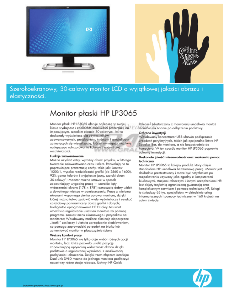 Szerokoekranowy, 30-calowy monitor LCD o wyjątkowej jakości obrazu i elastyczności. Monitor płaski HP LP3065 Monitor płaski HP LP3065 oferuje najlepszą w swojej klasie wydajność i znakomite możliwości prezentacji na imponującym, szerokim ekranie 30-calowym. Jest to doskonały wyświetlacz dla użytkowników zaawansowanych, projektantów, twórców i specjalistów zajmujących się wizualizacją, którzy wymagają możliwie najlepszego odwzorowania kolorów i najwyższej rozdzielczości. Release2 (dostarczany z monitorem) umożliwia montaż monitora na ścianie po odłączeniu podstawy. Funkcje zaawansowane Można uzyskać ostry, wyraźny obraz projektu, w którego tworzenie zainwestowano czas i talent. Pozwalają na to poprawiające prezentację cechy, takie jak: kontrast 1000:1, wysoka rozdzielczość grafiki (do 2560 x 1600), 92% gama kolorów i wyjątkowo jasny, szeroki ekran 30-calowy1; Monitor można ustawić w sposób zapewniający wygodną pracę — szerokie kąty widoczności ekranu (178 x 178°) oznaczają dobry widok z dowolnego miejsca w pomieszczeniu; Pracę z wieloma ekranami wspomaga cienka oprawa monitora, dzięki której można łatwo zestawić wiele wyświetlaczy i uzyskać całościowy panoramiczny obraz grafiki i danych; Inteligentne oprogramowanie HP Display Assistant umożliwia regulowanie ustawień monitora za pomocą programu, zamiast menu ekranowego i przycisków na monitorze; Wbudowany zasilacz eliminuje nieporęczne „kostki” zasilaczy i ułatwia zarządzanie okablowaniem, co pomaga zaprowadzić porządek na biurku lub zamontować monitor w płaszczyźnie ściany Doskonała jakość i niezawodność oraz znakomita pomoc techniczna Monitor HP LP3065 to kolejny produkt, który dzięki standardom HP umożliwia bezstresową pracę. Monitor jest dokładnie przetestowany i może być natychmiast po rozpakowaniu używany jako zgodny z komputerami biurkowymi, stacjami roboczymi i innymi urządzeniami HP. Jest objęty trzyletnią ograniczoną gwarancją oraz kompleksowym serwisem i pomocą techniczną HP. Usługi te świadczy 65 tys. specjalistów w dziedzinie usług informatycznych i pomocy technicznej w 160 krajach na całym świecie. Wyższy komfort pracy Monitor HP LP3065 nie tylko daje wybór różnych opcji montażu, lecz także pozwala ustalić pozycję zapewniającą optymalną widoczność ekranu dzięki podstawie o regulowanej wysokości, z możliwością pochylania i obracania. Dzięki trzem złączom interfejsu Dual Link DVI-D można do jednego monitora podłączyć nawet trzy różne stacje robocze. Uchwyt HP Quick Dokument pobrano z http://www.gral.pl Ochrona inwestycji Wbudowany koncentrator USB ułatwia podłączanie urządzeń peryferyjnych, takich jak opcjonalna listwa HP Speaker Bar, do monitora, a nie bezpośrednio do komputera. W ten sposób monitor HP LP3065 poprawia ochronę inwestycji. Monitor płaski HP LP3065 Typ Aktywna matryca TFT (thin film transistor); powłoka antyrefleksyjna i antystatyczna Widoczny obszar obrazu Przekątna 30,0 cali Kąt podglądu 178° w poziomie, 178° w pionie Jasność 300 nitów Kontrast obrazu 1000:1 Poziom reakcji 6 ms (typowy, od szarości do szarości), 12 ms (czas zapalania i gaszenia plamki) Rozstaw plamki/pikseli 0,250 mm Obsługiwana głębia kolorów 16,7 miliona kolorów Częstotliwość Częstotliwość pozioma: 100 kHz, Częstotliwość pionowa: 60 Hz Rozdzielczość 2560 x 1600 przy 60 Hz (naturalna) Sygnał wejściowy Trzy wejścia Dual Link DVI-D (komputer PC z systemem Windows i kartą graficzną obsługującą porty DVI z pasmem cyfrowym dual-link i standardem VESA DDC umożliwiającym konfigurację w trybie plug-and-play (podłącz i pracuj) wymaga karty graficznej dual-link DVI-D obsługującej rozdzielczość WQXGA 2560 x 1600). Kabel monitora Dwa kable interfejsu Dual Link DVI-D Sterowanie (menu ekranowe) Regulacja jasności, wybór wejścia Funkcje podstawowe Zakres przechyłu: od -5° do +30° (przechył pionowy), zakres obrotu: od -45° do +45°, regulacja wysokości: 100 mm, odłączana podstawa. Pobór mocy Maks. 176 W, typowo 118 W Zasilacz Automatyczne rozpoznawanie napięcia wejściowego, zakres od 100 do 240 V, od 50 Hz (+/-3 Hz) do 60 Hz (+/-3 Hz) Pobór mocy, czuwanie 2 W Wymiary (szer. x głęb. x wys.) W opakowaniu: 79,0 x 37,8 x 56,8 cm, bez opakowania, z podstawą: 69,2 x 24,0 x 49,0-59,0 cm, bez opakowania, bez podstawy: 69,2 x 8,4 x 45,5 cm Waga 13,4 kg Certyfikaty, normy Atest ACA (Australia), spełnia wymagania kanadyjskie/CSA, znak CE, atest CCIB/CCEE (Chiny), spełnia wymagania CISPR, atesty wschodnioeuropejskie, zgodność z normą Energy Star, atest FCC, niemiecka norma ergonomiczna (znaki TUV i GS), zgodność z normą ISO 9241-3,7,8 VDT, zgodność z normą ISO 13406-2 (wytyczne dotyczące wadliwych pikseli), zgodność z MIC (Nowa Zelandia), zgodność z MPR-II, atesty Nemko, Fimko, Demko, Semko (Skandynawia), atest MIC (Korea Płd.), atest BSMI (Tajwan), zgodność z TCO 99 (emisja, ergonomia, ekologia), TUV-Ergo, atest UL, atesty VCCI, certyfikat Microsoft® Windows® (Microsoft® Windows® 98, Microsoft Windows 2000 i Microsoft Windows XP) Gwarancja Trzyletnia ograniczona gwarancja na części, robociznę i serwis u klienta, obejmująca podświetlenie. Dostępność zależy od regionu. Obowiązują pewne ograniczenia i wyłączenia. Więcej informacji można uzyskać w dziale pomocy technicznej lub obsługi klienta HP. 1 Wszystkie specyfikacje odpowiadają typowym danym technicznym udostępnianym przez producentów podzespołów stosowanych w produktach HP; rzeczywiste parametry mogą się różnić. 2 Maksymalne obciążenie uchwytu HP Flat Panel Monitor Quick Release zależy od konfiguracji montażu i nie może przekraczać 10,9 kg. Należy pamiętać, że jest to limit łącznej wagi wszystkich zamontowanych urządzeń. Łączniki montażowe nie są dostarczane z monitorem (z wyjątkiem śrub zgodnych ze standardem VESA). HP zaleca konsultację z wyk