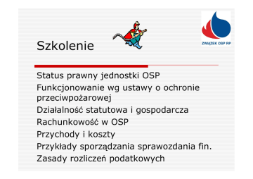 Szkolenie Status prawny jednostki OSP Funkcjonowanie wg ustawy o ochronie przeciwpoŜarowej Działalność statutowa i gospodarcza Rachunkowość w OSP Przychody i koszty Przykłady sporządzania sprawozdania fin. Zasady rozliczeń podatkowych Podstawowe akty prawne -OSP Ustawa Prawo o stowarzyszeniach Statut OSP Ustawa o Krajowym Rejestrze Sądowym Ustawa o ochronie przeciwpoŜarowej Ustawa o Rachunkowości Rozporządzenie Ministra Fin. -zasady szczególne Ustawa o poŜytku publicznym i wolontariacie Ustawa o swobodzie działalności gospodarczej Ustawa o podatku dochodowym od os. Prawnych Ustawa o podatku VAT Ordynacja podatkowa 2 Status prawny jednostki OSP OSP jest stowarzyszeniem posiada osobowość prawną jest wpisana do KRS posługuje się NIP i numerem identyfikacyjnym REGON posiada rachunek bankowy jest podatnikiem podatku dochodowego od osób prawnych jest jednostką pozarządową (wg ustawy o ppiw) nie działa w celu osiągnięcia zysku jest przedsiębiorcą – jeŜeli prowadzi dział. gosp. 3 Rejestracja jednostki OSP w rejestrze stowarzyszeń KRS – jako podmiot nie prowadzący działalności gospodarczej w rejestrze przedsiębiorców KRS – dodatkowo jako podmiot prowadzący działalność gospodarczą w rejestrze organizacji poŜytku publicznego KRS – jako organizacja posiadająca status OPP w urzędzie statystycznym – REGON w urzędzie skarbowym – NIP w rejestrze podatników VAT (działalność gospodarcza) w internetowym Systemie OSP 4 Zarejestrowanie działalności gosp. Zmiany w statucie OSP – dokładne wyszczególnienie Rejestracja OSP w Rejestrze przedsiębiorców KRS formularz KRS-W9 ze zmianami w statucie formularz KRS-WM „Przedmiot działalności” uchwały o zmianie statutu i protokół z zebrania potwierdzone notarialnie wzory podpisów czł. zarządu dowód opłaty za wpis do rejestru – 1 000 zł. dowód opłaty za ogłoszenie w Monitorze Sądowym i Gospodarczym – 500 zł. 5 Ustawa o ochronie przeciwpoŜarowej Nowelizacja ustawy z dniem 25 września 2008r. Wszyscy członkowie OSP za kaŜdą godzinę uczestniczenia w działaniach ratowniczych lub szkoleniach otrzymują ekwiwalent (wyjątek – pracujący, którym zachowano prawo do wynagrodzenia) Rada gminy uchwala wysokość ekwiwalentu nie większą niŜ 1/175 przeciętnego wynagr. w gospod. uspołeczn. Wójt (burmistrz, prezydent m.) koordynuje funkcjonowanie KSRG na terenie gminy i moŜe to wykonywać przy pomocy komendanta gminnego ochrony ppoŜ lub komendanta gminnego Związku OSP Komendant moŜe być przez wójta zatrudniony 6 Gmina ma obowiązek dokonać ubezpieczenia – imiennie lub zbiorowo nieimiennie – członków OSP i młodzieŜowej druŜyny poŜarniczej Zmiana w Prawie o ruchu drogowym: wozem straŜackim moŜe kierować osoba, która posiada zaświadczenie wydane przez odpowiedniego wójta (burmistrza, prezydenta m.), potwierdzające spełnienie wymagań w zakresie badań lekarskich i psychologicznych. Jednostki samorządu terytorialnego: gminy, powiaty, województwa mogą przekazywać OSP środki pienięŜne w formie dotacji 7 Działalność statutowa, a działalność gospodarcza Dokładne określenia w statucie jednostki OSP Działalność gospodarcza w OSP: wynajem lokali, wynajem powierzchni reklamowej, udostępnianie sprzętu, usługi parkingowe, organizacja zabaw OdróŜnienie działalności statutowej od działalności gospodarczej konieczne ze względów podatkowych i dla prowadzenia wyodrębnionej rachunkowości. Uregulowane prawo do nieruchomości a prawo do dysponowania Działalność gospodarcza w OSP słuŜy wykonywaniu działalności statutowej 8 Rachunkowość OSP Podstawa ksiąg rachunkowych stowarzyszenia: dokument - Przyjęte zasady (polityka) rachunkowości opracowany wg przepisów Ustawy o rachunkowości Dla jednostek nie prowadzących działalności gospodarczej – dokument uwzględnia szczególne zasady rachunkowości określone w rozporządzeniu Ministra Finansów Odpowiedzialność za wykonywanie obowiązków w zakresie rachunkowości ponosi zarząd OSP Prezes zarządu moŜe w formie pisemnej powierzyć te obowiązki innej osobie za jej zgodą. 9 Księgi rachunkowe prowadzone w siedzibie OSP przez skarbnika lub osobę zatrudnioną z zewnątrz Księgi rachunkowe poza siedzibą OSP prowadzone przez osobę lub firmę z uprawnieniami do usługowego prowadzenia ksiąg rachunkowych Społeczny charakter działalności OSP nie zwalnia zarządu OSP z odp. karnej (grzywna, do 2 lat p.w.) KsiąŜka „Rachunkowość w OSP” – źródło wiedzy oraz dokument przyjętych zasad rachunkowości 10 Przychody OSP Według ustawy Prawo o stowarzyszeniach: Składki członkowskie Darowizny, spadki, zapisy Dochody z własnej działalności Dochody z majątku stowarzyszenia Z ofiarności publicznej Według ustawy o poŜytki publicznym i wolontariacie: 1% podatku dochodowego od osób fizycznych Według ustawy o ochronie przeciwpoŜarowej Dotacje celowe z budŜetu jednostek samorządowych 11 Za pośrednictwem Oddziału Wojewódzkiego Związku OSP RP: dzielone w oparciu o przepisy rozporządzenia Ministra Spraw Wewnętrznych i Administracji w sprawie szczegółowych zasad rozdziału środków finansowych przeznaczonych na cele ochrony przeciwpoŜarowej Środki z dotacji MSWiA na remonty remiz oraz zakup sprzętu i umundurowania Środki na remonty remiz oraz zakup sprzętu ppoŜ przekazywane przez zakłady ubezpieczeń Środki przekazywane dla OSP w ramach KSRG Środki pozyskiwane indywidualnie : z Funduszu Ochrony Środowiska i Gospodarki Wodnej z funduszu prewencyjnego PZU SA 12 Koszty OSP Koszty realizacji zadań statutowych Koszty działalności gospodarczej Koszty administracyjne, związane z funkcjonowaniem i utrzymaniem jednostki Pozostałe koszty operacyjne Koszty finansowe Straty nadzwyczajne Do kosztów jednostki OSP nie zalicza się tych, które poniosła gmina realizując ustawowy obowiązek wyposaŜenia, wyszkolenia, ubezpieczenia i zapewnienia gotowości bojowej 