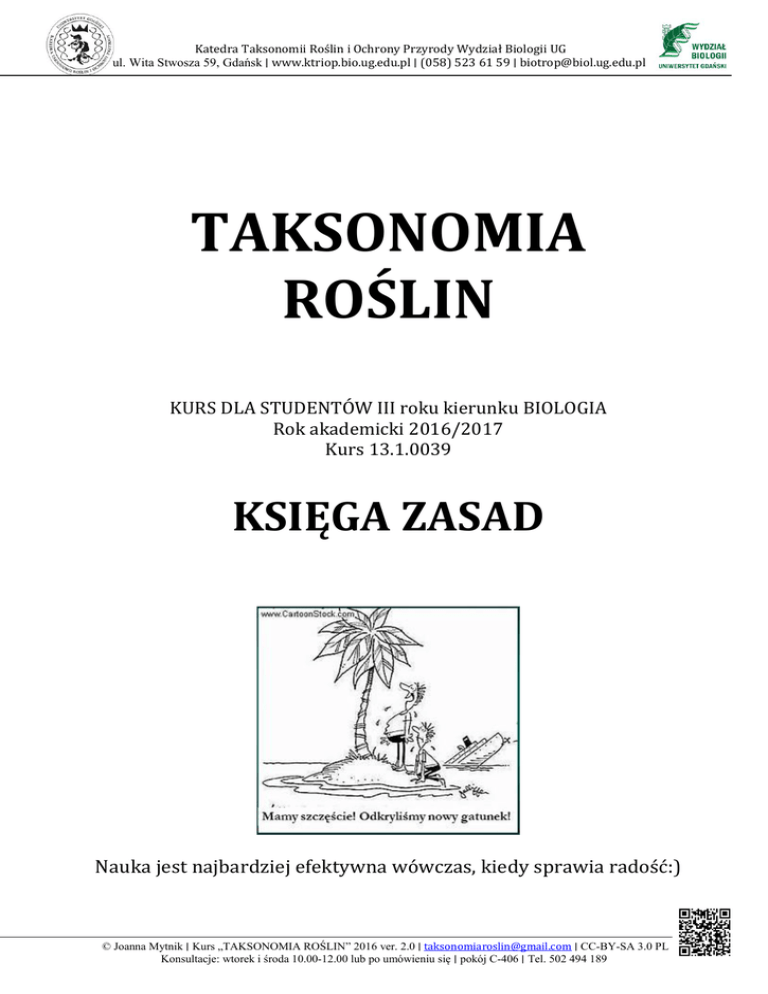 Katedra Taksonomii Roślin i Ochrony Przyrody Wydział Biologii UG ul. Wita Stwosza 59, Gdańsk ∣ www.ktriop.bio.ug.edu.pl ∣ (058) 523 61 59 ∣ [email protected] TAKSONOMIA ROŚLIN KURS DLA STUDENTÓW III roku kierunku BIOLOGIA Rok akademicki 2016/2017 Kurs 13.1.0039 KSIĘGA ZASAD Nauka jest najbardziej efektywna wówczas, kiedy sprawia radość:) © Joanna Mytnik ∣ Kurs „TAKSONOMIA ROŚLIN” 2016 ver. 2.0 ∣ [email protected] ∣ CC-BY-SA 3.0 PL Konsultacje: wtorek i środa 10.00-12.00 lub po umówieniu się ∣ pokój C-406 ∣ Tel. 502 494 189 Katedra Taksonomii Roślin i Ochrony Przyrody Wydział Biologii UG ul. Wita Stwosza 59, Gdańsk ∣ www.ktriop.bio.ug.edu.pl ∣ (058) 523 61 59 ∣ [email protected] Gra (kurs) toczy się w trzech przenikających się płaszczyznach: wykłady (kończące się egzaminem) ćwiczenia laboratoryjne chmura z zadaniami. W Grze biorą udział: Mistrz Gry (główny prowadzący kurs zwany także wykładowcą): dr hab. prof. UG Joanna Mytnik (pokój C-406) , kontakt: [email protected] Lab Masterzy (prowadzący ćwiczenia): mgr Sławomir Nowak (pokój C-417) główny prowadzący, kontakt: [email protected] mgr Elżbieta Grochocka (pokój C-417) kontakt: [email protected] mgr Natalia Olędrzyńska (pokój C-417) kontakt: [email protected] mgr Iwona Skorowska ((pokój C-418) kontakt: [email protected] Gracze (zwani studentami jeśli nie uczestniczą w Grze). Udział w Grze jest dobrowolny. Każdy student sam decyduje czy i w jakim stopniu chce zaangażować się w Grę i podjąć się wykonywania dodatkowych zadań zmniejszając sobie tym samym liczbę punktów potrzebnych do uzyskania podczas egzaminu. Udział w ćwiczeniach jest obowiązkowy, obecność na ćwiczeniach zapewnia ocenę dostateczną z ćwiczeń, ocena wyższa jest możliwa po wykonaniu wybranych zadań. Udział w wykładach nie jest obowiązkowy, każdy student po zakończeniu kursu ma prawo podejść do egzaminu. Systematyczna praca w trakcie trwania kursu (wykonywanie zadań w chmurze podzielonych na 5 specjalności tematycznych obejmujących program kursu, tj. efekty kształcenia przewidziane w sylabusie) pozwala na zmniejszenie się wagi egzaminu (poszczególnych pytań) adekwatnie do ilości i jakości pracy wcześniej wykonanej przez studenta. Student może specjalizować się w każdej z 5 dziedzin zależnie od jego zainteresowań i potrzeb. SPECJALIZACJE Zakres treści kursu został podzielony na 5 działów tematycznych: A. B. C. D. E. KOLEKCJE BOTANICZNE / HISTORIA BADAŃ TAKSONOMICZNYCH ICN / E- TAKSONOMIA HERBARIUM TAKSONOMIA MOLEKUARNA GEOGRAFIA ROŚLIN W każdej ze specjalności student ma prawo wykonywać wybrane zadania poszerzające swoją wiedzę i umiejętności. Za każde zadanie można otrzymać punkty. Liczba zdobytych punktów w poszczególnych specjalnościach w trakcie trwania kursu jest liczbą punktów, którą student może wykorzystać na egzaminie odpowiadając na pytanie z danej specjalności. W każdej ze specjalności można zdobyć 100 pkt. W przypadku uzyskania 100% punktów za zadania z danej specjalności (100 pkt) student zostaje automatycznie zwolniony z odpowiedzi na pytanie egzaminacyjne z tej dziedziny i otrzymuje maksymalną liczę punktów za to pytanie. Na wybranych wykładach oraz ćwiczeniach mogą pojawić się zadania z danej specjalności nie ujęte w tabeli, za których wykonanie student może otrzymać punkty. Dodatkowo punkty można gromadzić wykonując quizy on-line w poszczególnych specjalnościach. Informacje dotyczące quizów będą pojawiać się na wykładach oraz będą przekazywane drogą elektroniczną. Student może wykonać zgłosić się po kolejne zadanie (lub przesłać już wykonane) dopiero po otrzymaniu punktów za poprzednie zadanie. Mistrz Gry oraz Lab Masterzy zobowiązują się do oceniania na © Joanna Mytnik ∣ Kurs „TAKSONOMIA ROŚLIN” 2016 ver. 2.0 ∣ [email protected] ∣ CC-BY-SA 3.0 PL Konsultacje: wtorek i środa 10.00-12.00 lub po umówieniu się ∣ pokój C-406 ∣ Tel. 502 494 189 Katedra Taksonomii Roślin i Ochrony Przyrody Wydział Biologii UG ul. Wita Stwosza 59, Gdańsk ∣ www.ktriop.bio.ug.edu.pl ∣ (058) 523 61 59 ∣ [email protected] bieżąco zadań Graczy (każdy Gracz otrzyma ocenę swojego zadania w ciągu 48 godzin). Wyjątkiem są wybrane zadania ze specjalności HERABRIUM (oznaczone na żółto w ostatniej kolumnie), można je wykonywać podczas wykonywania innego zadania (ze względu na rozłożenie w czasie pracy w herbarium). Każdy student widzi swój postęp na 2 wykresach udostępnionych mu w google sheets przez Mistrza Gry (opcja przeglądania, edycji dokonuje na bieżąco Mistrz Gry i Lab Masterzy). Pierwszy wykres pokazuje czy i na jaką ocenę student zaliczył ćwiczenia (kolor NIEBIESKI, obecność i praca na zajęciach to 30 pkt = ocena dostateczna) oraz ile punktów uzyskał za zadania (kolor ZIELONY), co podnosi jego ocenę z ćwiczeń (o pół oceny co 5 pkt) i zmniejsza liczbę koniecznych punktów do zdobycia na egzaminie. Drugi wykres pokazuje proporcje między zaliczonymi zadaniami w poszczególnych specjalnościach a pozostałą liczbą punktów konieczną do zdobycia na egzaminie (kolor CZERWONY). W miarę wykonywania zadań i zdobywania za nie punktów, liczba punktów „egzaminacyjnych” odpowiednio maleje. 1. Stan początkowy widoku postępu Gracza: 2. Przykładowy obraz postępu Gracza po zakończeniu kursu: © Joanna Mytnik ∣ Kurs „TAKSONOMIA ROŚLIN” 2016 ver. 2.0 ∣ [email protected] ∣ CC-BY-SA 3.0 PL Konsultacje: wtorek i środa 10.00-12.00 lub po umówieniu się ∣ pokój C-406 ∣ Tel. 502 494 189 Katedra Taksonomii Roślin i Ochrony Przyrody Wydział Biologii UG ul. Wita Stwosza 59, Gdańsk ∣ www.ktriop.bio.ug.edu.pl ∣ (058) 523 61 59 ∣ [email protected] ZADANIA W SPECJALNOŚCIACH KOLEKCJE BOTANICZNE / HISTORIA TAKSONOMII (A) Strona www Założenie strony internetowej dotyczącej historii taksonomii roślin na darmowej