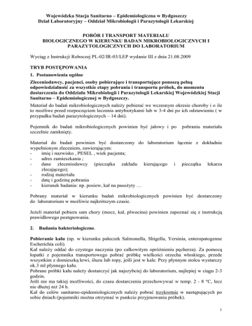 Wojewódzka Stacja Sanitarno – Epidemiologiczna w Bydgoszczy Dział Laboratoryjny – Oddział Mikrobiologii i Parazytologii Lekarskiej POBÓR I TRANSPORT MATERIAŁU BIOLOGICZNEGO W KIERUNKU BADAN MIKROBIOLOGICZNYCH I PARAZYTOLOGICZNYCH DO LABORATORIUM Wyciąg z Instrukcji Roboczej PL-02/IR-03/LEP wydanie III z dnia 21.08.2009 TRYB POSTĘPOWANIA 1. Postanowienia ogólne Zleceniodawcy, pacjenci, osoby pobierające i transportujące ponoszą pełną odpowiedzialność za wszystkie etapy pobrania i transportu próbek, do momentu dostarczenia do Oddziału Mikrobiologii i Parazytologii Lekarskiej Wojewódzkiej Stacji Sanitarno – Epidemiologicznej w Bydgoszczy. Materiał do badań mikrobiologicznych należy pobierać we wczesnym okresie choroby i o ile to możliwe przed rozpoczęciem leczenia antybiotykami lub w 3-4 dni po ich odstawieniu ( w przypadku badań parazytologicznych – 14 dni). Pojemnik do badań mikrobiologicznych powinien być jałowy i po szczelnie zamknięty. pobraniu materiału Materiał do badań powinien być dostarczony do laboratorium łącznie z dokładnie wypełnionym zleceniem, zawierającym: imię i nazwisko , PESEL , wiek pacjenta; adres zamieszkania ; dane zleceniodawcy (pieczątka zakładu kierującego i pieczątka lekarza zlecającego); rodzaj materiału datę i godzinę pobrania kierunek badania: np. posiew, kał na pasożyty … Pobrany materiał w kierunku badań mikrobiologicznych powinien być dostarczony do laboratorium w możliwie najkrótszym czasie. Jeżeli materiał pobiera sam chory (mocz, kał, plwocina) powinien zapoznać się z instrukcją prawidłowego postępowania. 2. Badania bakteriologiczne. Pobieranie kału (np. w kierunku pałeczek Salmonella, Shigella, Yersinia, enteropatogenne Escherichia coli). Kał należy oddać do czystego naczynia (po całkowitym opróżnieniu pęcherza). Za pomocą łopatki z pojemnika transportowego pobrać próbkę wielkości orzecha włoskiego, przede wszystkim z domieszką krwi, śluzu lub ropy, jeśli jest w kale. Przy płynnym stolcu wystarczy ok.3 ml płynnego kału. Pobrane próbki kału należy dostarczyć jak najszybciej do laboratorium, najlepiej w ciągu 2-3 godzin. Jeśli nie ma takiej możliwości, do czasu dostarczenia przechowywać w temp. 2 - 8 °C, lecz nie dłużej niż 24 h. Kał do celów sanitarno-epidemiologicznych należy pobrać trzykrotnie w następujących po sobie dniach (pojemniki można otrzymać w punkcie przyjmowania próbek). 1 Pobranie wymazu z odbytu . Wymaz z odbytu należy pobrać przez wprowadzenie i wielokrotne pokręcenie wymazówki do odbytnicy poza zwieracz zewnętrzny. Pobrany materiał należy możliwie jak najszybciej dostarczyć do laboratorium. Do czasu dostarczenia przechowywać w temp. 2 - 8 °C lecz nie dłużej niż 24 h. . Pobranie i transport moczu. Mocz należy pobrać ze środkowego strumienia. Preferowana jest pierwsza poranna próbka moczu. Próbka powinna być dostarczona do laboratorium natychmiast po pobraniu. Jeśli jest to niemożliwe, mocz należy aż do chwili transportu przechowywać w lodówce, lecz nie dłużej niż 4 h. Mocz do badania mikrobiologicznego należy pobierać do jałowego pojemnika lub na podłoże transportowo - wzrostowe np. Uromedium. Pobieranie moczu dla mężczyzn. Dokładnie umyć ręce wodą i mydłem, osuszyć. Po odciągnięciu napletka i dokładnym umyciu okolic ujścia cewki moczowej bieżącą wodą i mydłem, oddać pierwszy strumień moczu do ubikacji, zaś środkowy strumień oddać do sterylnego pojemnika, unikając zanieczyszczenia brzegów i wewnętrznych jego części. Pobieranie moczu dla kobiet. Dokładnie umyć ręce wodą i mydłem, osuszyć. Następnie dokładnie umyć okolice krocza w kierunku z przodu do tyłu. Oddać do ubikacji pierwszy strumień moczu, zaś środkowy strumień oddać do sterylnego pojemnika, unikając zanieczyszczeń brzegów i wewnętrznych jego części. Pobieranie moczu u dzieci. Mocz pobierany u dzieci do przyklejanych woreczków na skórę krocza nie może być uznany za miarodajny do badania mikrobiologicznego. Tylko ujemny wynik z tak pobranego moczu może być brany pod uwagę. Mocz pobierany cewnikiem. Do pobrania próbki moczu należy używać jednorazowego cewnika. Chory powinien uprzednio wypić wystarczającą ilość płynu. Po odpowiednim ułożeniu chorego starannie myje się okolicę krocza i narządy moczowo - płciowe a następnie wprowadza cewnik. Pierwszą porcję moczu odrzuca się, a następną zbiera i przesyła do badania. U chorych z cewnikiem założonym na stałe w żadnym przypadku nie wolno pobierać moczu do badania z worka zbierającego mocz. Próbkę moczu można wielokrotnie pobierać przez nakłucie uprzednio starannie zdezynfekowanej, bliższej części cewnika. Nie należy przy tym odłączać rurki odprowadzającej od cewnika. Pobranie wymazu z gardła lub jamy nosowo-gardłowej. Pacjent powinien być na czczo. Przed pobraniem powinien przepłukać usta przegotowaną wodą. Jałowym wacikiem pobrać materiał z migdałków, łuków podniebiennych i tylnej ściany gardła, lub ze zmian ropnych (czopy). W przypadku suchych błon śluzowych wacik można zwilżyć jałowym roztworem 0,9 % NaCl . Należy pamiętać, aby nie dotykać języka i języczka podniebiennego oraz nie zanieczyścić wymazów śliną. W przypadku pobierania materiału z jamy nosowo-gardłowej należy posługiwać się małym wacikiem na giętkim pręcie. Wacik wprowadza się za języczkiem podniebiennym ku górze w celu wymazania tylnej ściany gardła. W kierunku Neisseria meningitidis wymaz należy pobrać z jamy nosowo - gardłowej. W przypadku braku możliwości natychmiastowego przesyłania i opracowania próbki wymaz należy pobrać za pomocą specjalnych, fabrycznych zestawów zawierających wacik i podłoże transportowe. 2 Wymazówki z pobranym materiałem można przesłać w jałowej probówce bez podłoża transportowego, gdy materiał zostanie opracowany w laboratorium do 