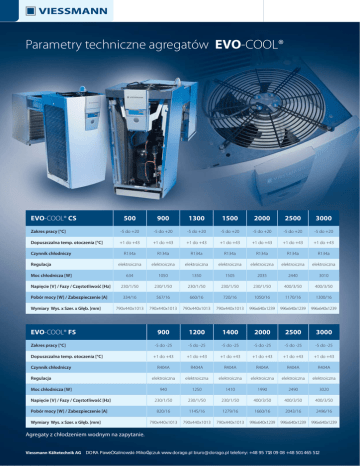 Parametry techniczne agregatów EVO-COOL® EVO-COOL® CS 500 900 1300 1500 2000 2500 3000 Zakres pracy [°C] -5 do +20 -5 do +20 -5 do +20 -5 do +20 -5 do +20 -5 do +20 -5 do +20 Dopuszczalna temp. otoczenia [°C] +1 do +43 +1 do +43 +1 do +43 +1 do +43 +1 do +43 +1 do +43 +1 do +43 R134a R134a R134a R134a R134a R134a R134a elektroiczna elektroiczna elektroiczna elektroiczna elektroiczna elektroiczna elektroiczna 634 1050 1350 1505 2035 2440 3010 230/1/50 230/1/50 230/1/50 230/1/50 230/1/50 400/3/50 400/3/50 334/16 567/16 660/16 720/16 1050/16 1170/16 1300/16 790x440x1013 790x440x1013 790x440x1013 790x440x1013 996x640x1239 996x640x1239 996x640x1239 900 1200 1400 2000 2500 3000 Zakres pracy [°C] -5 do -25 -5 do -25 -5 do -25 -5 do -25 -5 do -25 -5 do -25 Dopuszczalna temp. otoczenia [°C] +1 do +43 +1 do +43 +1 do +43 +1 do +43 +1 do +43 +1 do +43 R404A R404A R404A R404A R404A R404A elektroiczna elektroiczna elektroiczna elektroiczna elektroiczna elektroiczna 940 1250 1410 1990 2490 3020 230/1/50 230/1/50 230/1/50 400/3/50 400/3/50 400/3/50 820/16 1145/16 1279/16 1660/16 2043/16 2496/16 790x440x1013 790x440x1013 790x440x1013 996x640x1239 996x640x1239 996x640x1239 Czynnik chłodniczy Regulacja Moc chłodnicza [W] Napięcie [V] / Fazy / Częstotliwość [Hz] Pobór mocy [W] / Zabezpieczenie [A] Wymiary Wys. x Szer. x Głęb. [mm] EVO-COOL® FS Czynnik chłodniczy Regulacja Moc chłodnicza [W] Napięcie [V] / Fazy / Częstotliwość [Hz] Pobór mocy [W] / Zabezpieczenie [A] Wymiary Wys. x Szer. x Głęb. [mm] Agregaty z chłodzeniem wodnym na zapytanie. Viessmann Kältetechnik AG DORA Paweł Kalinowski-Mikołajczuk www.dorago.pl [email protected] telefony: +48 95 718 09 08 +48 501 465 512