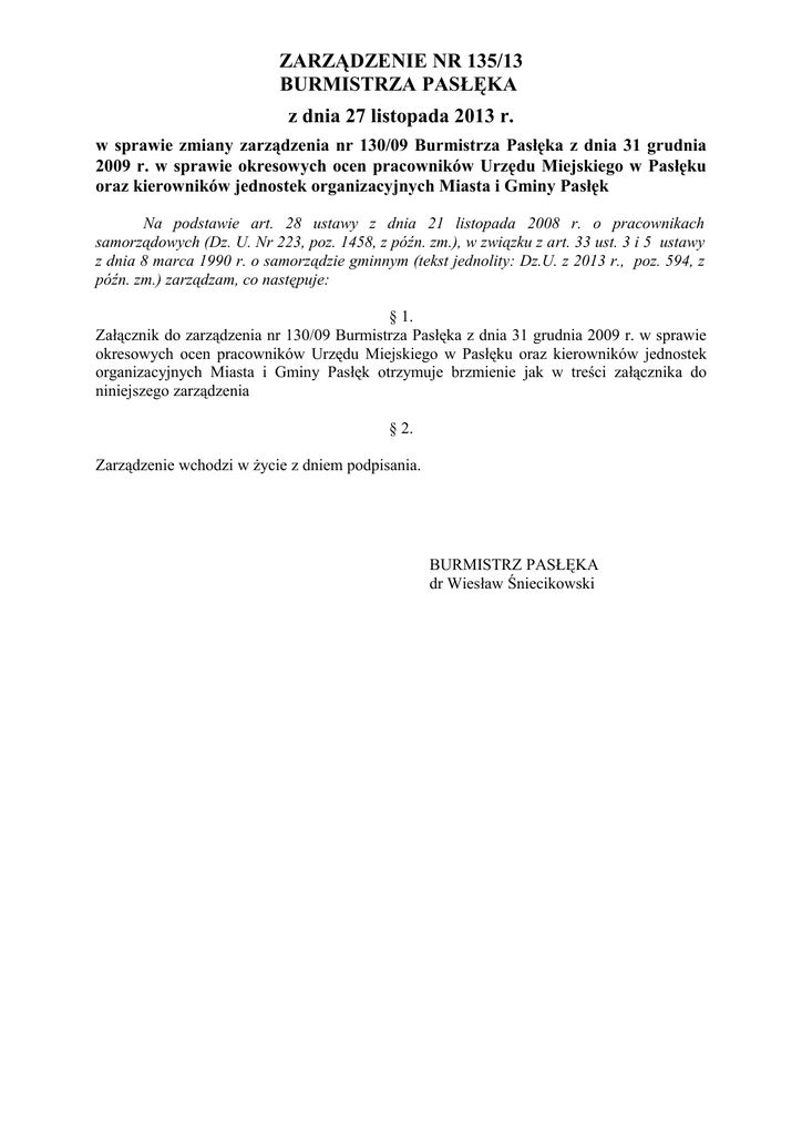 ZARZĄDZENIE NR 135/13 BURMISTRZA PASŁĘKA z dnia 27 listopada 2013 r. w sprawie zmiany zarządzenia nr 130/09 Burmistrza Pasłęka z dnia 31 grudnia 2009 r. w sprawie okresowych ocen pracowników Urzędu Miejskiego w Pasłęku oraz kierowników jednostek organizacyjnych Miasta i Gminy Pasłęk Na podstawie art. 28 ustawy z dnia 21 listopada 2008 r. o pracownikach samorządowych (Dz. U. Nr 223, poz. 1458, z późn. zm.), w związku z art. 33 ust. 3 i 5 ustawy z dnia 8 marca 1990 r. o samorządzie gminnym (tekst jednolity: Dz.U. z 2013 r., poz. 594, z późn. zm.) zarządzam, co następuje: § 1. Załącznik do zarządzenia nr 130/09 Burmistrza Pasłęka z dnia 31 grudnia 2009 r. w sprawie okresowych ocen pracowników Urzędu Miejskiego w Pasłęku oraz kierowników jednostek organizacyjnych Miasta i Gminy Pasłęk otrzymuje brzmienie jak w treści załącznika do niniejszego zarządzenia § 2. Zarządzenie wchodzi w życie z dniem podpisania. BURMISTRZ PASŁĘKA dr Wiesław Śniecikowski Załącznik do Zarządzenia nr 135/13 Burmistrza Pasłęka z dnia 27 listopada 2013 r. ARKUSZ OKRESOWEJ OCENY PRACOWNIKA SAMORZĄDOWEGO CZĘŚĆ A I. Dane dotyczące ocenianego pracownika : Imię ( imiona ) i nazwisko_______________________________________________ Miejsce pracy ( jednostka )_______________________________________ _______ Komórka organizacyjna_________________________________________________ Stanowisko __________________________________________________________ Data zatrudnienia na stanowisku urzędniczym _______________________________ Data rozpoczęcia pracy na obecnym stanowisku _____________________________ A II. Ocena opisowa pracownika za okres ________- _________ oraz uzasadnienie wystawionej oceny opisowej: L.p. Oceniane kryteria 1. Prawidłowość i rzetelność wywiązywania się pracownika z obowiązków wynikających z przydzielonego mu zakresu czynności na zajmowanym stanowisku. Opisowa ocena-opinia oceniającego : ...................................................................................................... ...................................................................................................... ...................................................................................................... ...................................................................................................... ...................................................................................................... ...................................................................................................... ...................................................................................................... ...................................................................................................... ...................................................................................................... ...................................................................................................... Uzasadnienie wystawionej oceny opisowej (czynniki wpływające na wystawioną ocenę) ............................................................................................................................ ............................................................................................................................ ............................................................................................................................ ............................................................................................................................ ............................................................................................................................ ............................................................................................................................ ............................................................................................................................ 2. Przestrzeganie przez pracownika regulaminu pracy i innych przepisów regulujących funkcjonowanie jednostki, w której jest zatrudniony. Opisowa ocena-opinia oceniającego : ...................................................................................................... ...................................................................................................... ...................................................................................................... ...................................................................................................... ...................................................................................................... ...................................................................................................... ...................................................................................................... ...................................................................................................... ...................................................................................................... Uzasadnienie wystawionej oceny opisowej (czynniki wpływające na wystawioną ocenę) ............................................................................................................................ ............................................................................................................................ ............................................................................................................................ ............................................................................................................................ ............................................................................................................................ ............................................................................................................................ ..........................................................................................................