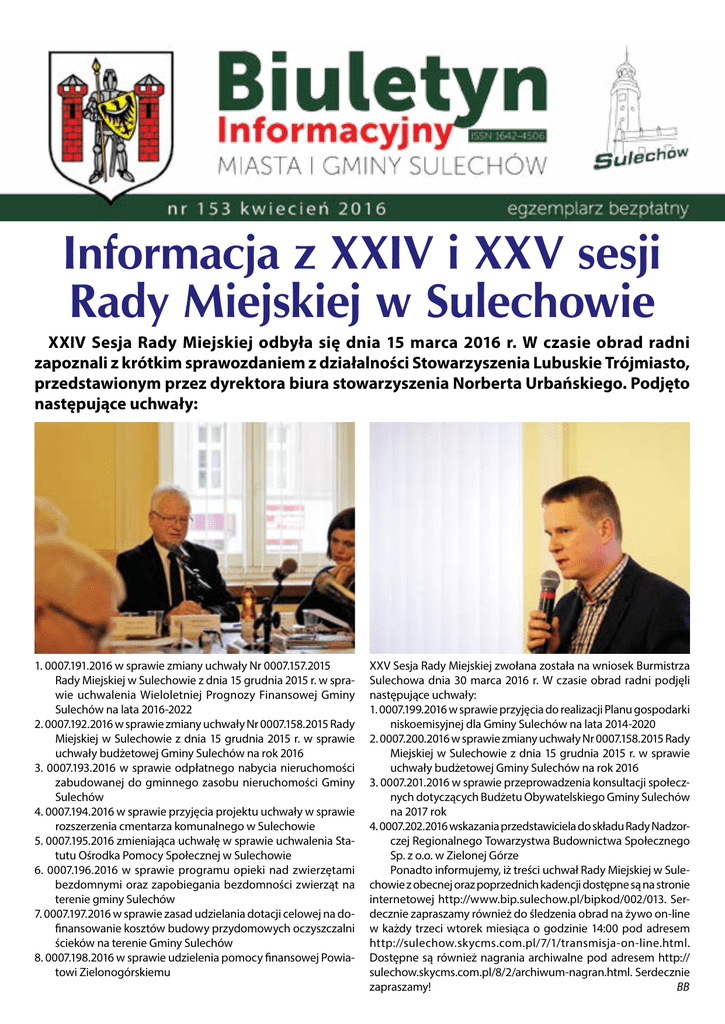 Informacja z XXIV i XXV sesji Rady Miejskiej w Sulechowie XXIV Sesja Rady Miejskiej odbyła się dnia 15 marca 2016 r. W czasie obrad radni zapoznali z krótkim sprawozdaniem z działalności Stowarzyszenia Lubuskie Trójmiasto, przedstawionym przez dyrektora biura stowarzyszenia Norberta Urbańskiego. Podjęto następujące uchwały: 1. 0007.191.2016 w sprawie zmiany uchwały Nr 0007.157.2015 Rady Miejskiej w Sulechowie z dnia 15 grudnia 2015 r. w sprawie uchwalenia Wieloletniej Prognozy Finansowej Gminy Sulechów na lata 2016-2022 2. 0007.192.2016 w sprawie zmiany uchwały Nr 0007.158.2015 Rady Miejskiej w Sulechowie z dnia 15 grudnia 2015 r. w sprawie uchwały budżetowej Gminy Sulechów na rok 2016 3. 0007.193.2016 w sprawie odpłatnego nabycia nieruchomości zabudowanej do gminnego zasobu nieruchomości Gminy Sulechów 4. 0007.194.2016 w sprawie przyjęcia projektu uchwały w sprawie rozszerzenia cmentarza komunalnego w Sulechowie 5. 0007.195.2016 zmieniająca uchwałę w sprawie uchwalenia Statutu Ośrodka Pomocy Społecznej w Sulechowie 6. 0007.196.2016 w sprawie programu opieki nad zwierzętami bezdomnymi oraz zapobiegania bezdomności zwierząt na terenie gminy Sulechów 7. 0007.197.2016 w sprawie zasad udzielania dotacji celowej na dofinansowanie kosztów budowy przydomowych oczyszczalni ścieków na terenie Gminy Sulechów 8. 0007.198.2016 w sprawie udzielenia pomocy finansowej Powiatowi Zielonogórskiemu XXV Sesja Rady Miejskiej zwołana została na wniosek Burmistrza Sulechowa dnia 30 marca 2016 r. W czasie obrad radni podjęli następujące uchwały: 1. 0007.199.2016 w sprawie przyjęcia do realizacji Planu gospodarki niskoemisyjnej dla Gminy Sulechów na lata 2014-2020 2. 0007.200.2016 w sprawie zmiany uchwały Nr 0007.158.2015 Rady Miejskiej w Sulechowie z dnia 15 grudnia 2015 r. w sprawie uchwały budżetowej Gminy Sulechów na rok 2016 3. 0007.201.2016 w sprawie przeprowadzenia konsultacji społecznych dotyczących Budżetu Obywatelskiego Gminy Sulechów na 2017 rok 4. 0007.202.2016 wskazania przedstawiciela do składu Rady Nadzorczej Regionalnego Towarzystwa Budownictwa Społecznego Sp. z o.o. w Zielonej Górze Ponadto informujemy, iż treści uchwał Rady Miejskiej w Sulechowie z obecnej oraz poprzednich kadencji dostępne są na stronie internetowej http://www.bip.sulechow.pl/bipkod/002/013. Serdecznie zapraszamy również do śledzenia obrad na żywo on-line w każdy trzeci wtorek miesiąca o godzinie 14:00 pod adresem http://sulechow.skycms.com.pl/7/1/transmisja-on-line.html. Dostępne są również nagrania archiwalne pod adresem http:// sulechow.skycms.com.pl/8/2/archiwum-nagran.html. Serdecznie zapraszamy! BB 2 Biuletyn Informacyjny nr 153 Kwicień 2016 O drodze S3 i nie tylko rozmawiamy z Przemysławem Hamerą, dyrektorem Oddziału GDDKiA w Zielonej Górze. - Panie dyrektorze aż serce się raduje widząc tempo pracy na budowie S3 od Sulechowa do Legnicy. Proszę powiedzieć w jakich terminach zakończone zostaną prace na poszczególnych odcinkach budowy? - Zielonogórski Oddział GDDKiA odpowiedzialny jest za budowę 5 odcinków drogi S3 między Sulechowem a węzłem „Kaźmierzów”. Termin oddania do użytku każdego z nich jest inny, no prawie każdego. I tak: odcinek od Sulechowa do węzła „Zielona Góra Północ” ma zostać zakończony w sierpniu 2017 roku, od węzła „Zielona Góra Północ” do węzła „Niedoradz” w maju 2018, od węzła „Niedoradz” do Nowej Soli w lipcu 2018, a dwa ostatnie Nowa Sól – Gaworzyce i Gaworzyce-Kaźmierzów w czerwcu 2018. Przy czym musimy pamiętać o tym, że jeden z nowych mostów na Odrze, który powstanie w miejscu obecnego, będzie gotowy dwa lata później niż nowa jezdnia na tym odcinku, czyli w 2019 roku. swojej roli, zostaną usunięte, a nowa jezdnia będzie biegła na tym samym poziomie co obecna. - Na odcinku Sulechów – Zielona Góra budowane są dwa potężne przejścia dla zwierząt. Czym podyktowane są ich monstrualne konstrukcje? Przemysław Hamera, dyrektor Oddziału GDDKiA w Zielonej Górze. - Mieszkańcy Gminy Sulechów i nie tylko często pytają, dlaczego jadąc z Sulechowa do Zielonej Góry za mostem w Cigacicach usypane są potężne wały z ziemi i kruszywa? - Tak, do nas też często trafiają takie pytania. Odpowiedź jest prosta, są to tzw. nasypy dociążeniowe, czyli jedna z metod zagęszczania gruntu pod korpus drogi. Nasypy, po spełnieniu - Jak można zauważyć takich przejść w lubuskim mamy sporo, a wszystko to wynika ze specyfiki obszaru. Jesteśmy przecież najbardziej zalesionym województwem w Polsce. Stąd potrzeba z jednej strony ochrony kierowców przed wypadkami z udziałem zwierząt, a z drugiej ochrona zwierząt i zapewnienie im odpowiednich warunków do życia. Rozmiary i specyficzna konstrukcja tych obiektów wynika z różnych aspektów m.in. gatunków zwierząt, które mają z niego korzystać. Te dwa największe na tym odcinku mają służyć między innymi jeleniom. Projektując przejścia dla zwierząt opieramy się na przepisach i wytycznych opracowanych specjalnie dla tych budowli, aby spełniały one swoją funkcję. Ich ostateczna ilość, jaka ma powstać na danym odcinku i parametry każdego z nich, określone zostają w decyzji środowiskowej dla danej inwestycji, wydawanej przez Regionalną Dyrekcją Ochrony Środowiska. To nas obliguje do ich wybudowania. Kwicień 2016 jednorazowo. Będzie to raczej realizowane mniejszymi fragmentami, gdzie ruch, podczas prac na „starej” jezdni, będzie skierowany na nową jezdnię. Ale wszystkie prace, na „starej” jak i nowej jezdni, mają zakończyć się w sierpniu 2017 roku i wtedy kierowcy będą mogli korzystać z obu, z wyłączeniem tylko mostu. Przez dwa kolejne lata wykonawca będzie musiał wyburzyć stary i w jego miejsce wybudować nowy most, spełniający obowiązujące parametry. - Pojawiły się pomysły, aby zdemontowane przęsła mostowe wykorzystać do budowy nowej przeprawy