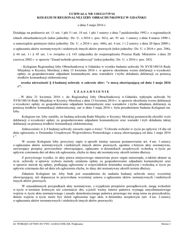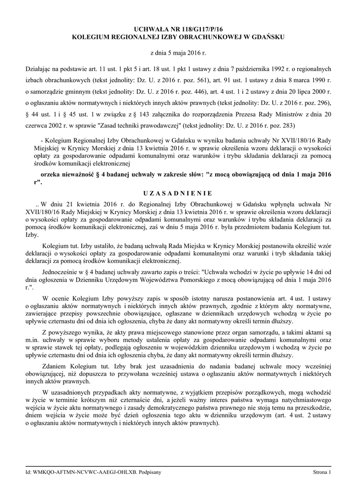 UCHWAŁA NR 118/G117/P/16 KOLEGIUM REGIONALNEJ IZBY OBRACHUNKOWEJ W GDAŃSKU z dnia 5 maja 2016 r. Działając na podstawie art. 11 ust. 1 pkt 5 i art. 18 ust. 1 pkt 1 ustawy z dnia 7 października 1992 r. o regionalnych izbach obrachunkowych (tekst jednolity: Dz. U. z 2016 r. poz. 561), art. 91 ust. 1 ustawy z dnia 8 marca 1990 r. o samorządzie gminnym (tekst jednolity: Dz. U. z 2016 r. poz. 446), art. 4 ust. 1 i 2 ustawy z dnia 20 lipca 2000 r. o ogłaszaniu aktów normatywnych i niektórych innych aktów prawnych (tekst jednolity: Dz. U. z 2016 r. poz. 296), § 44 ust. 1 i § 45 ust. 1 w związku z § 143 załącznika do rozporządzenia Prezesa Rady Ministrów z dnia 20 czerwca 2002 r. w sprawie "Zasad techniki prawodawczej" (tekst jednolity: Dz. U. z 2016 r. poz. 283) - Kolegium Regionalnej Izby Obrachunkowej w Gdańsku w wyniku badania uchwały Nr XVII/180/16 Rady Miejskiej w Krynicy Morskiej z dnia 13 kwietnia 2016 r. w sprawie określenia wzoru deklaracji o wysokości opłaty za gospodarowanie odpadami komunalnymi oraz warunków i trybu składania deklaracji za pomocą środków komunikacji elektronicznej orzeka nieważność § 4 badanej uchwały w zakresie słów: "z mocą obowiązującą od dnia 1 maja 2016 r". UZASADNIENIE .. W dniu 21 kwietnia 2016 r. do Regionalnej Izby Obrachunkowej w Gdańsku wpłynęła uchwała Nr XVII/180/16 Rady Miejskiej w Krynicy Morskiej z dnia 13 kwietnia 2016 r. w sprawie określenia wzoru deklaracji o wysokości opłaty za gospodarowanie odpadami komunalnymi oraz warunków i trybu składania deklaracji za pomocą środków komunikacji elektronicznej, zaś w dniu 5 maja 2016 r. była przedmiotem badania Kolegium tut. Izby. Kolegium tut. Izby ustaliło, że badaną uchwałą Rada Miejska w Krynicy Morskiej postanowiła określić wzór deklaracji o wysokości opłaty za gospodarowanie odpadami komunalnymi oraz warunki i tryb składania takiej deklaracji za pomocą środków komunikacji elektronicznej. Jednocześnie w § 4 badanej uchwały zawarto zapis o treści: "Uchwała wchodzi w życie po upływie 14 dni od dnia ogłoszenia w Dzienniku Urzędowym Województwa Pomorskiego z mocą obowiązującą od dnia 1 maja 2016 r.". W ocenie Kolegium Izby powyższy zapis w sposób istotny narusza postanowienia art. 4 ust. 1 ustawy o ogłaszaniu aktów normatywnych i niektórych innych aktów prawnych, zgodnie z którym akty normatywne, zawierające przepisy powszechnie obowiązujące, ogłaszane w dziennikach urzędowych wchodzą w życie po upływie czternastu dni od dnia ich ogłoszenia, chyba że dany akt normatywny określi termin dłuższy. Z powyższego wynika, że akty prawa miejscowego stanowione przez organ samorządu, a takimi aktami są m.in. uchwały w sprawie wyboru metody ustalenia opłaty za gospodarowanie odpadami komunalnymi oraz w sprawie stawek tej opłaty, podlegają ogłoszeniu w wojewódzkim dzienniku urzędowym i wchodzą w życie po upływie czternastu dni od dnia ich ogłoszenia chyba, że dany akt normatywny określi termin dłuższy. Zdaniem Kolegium tut. Izby brak jest uzasadnienia do nadania badanej uchwale mocy wcześniej obowiązującej, niż dopuszcza to przywołana wcześniej ustawa o ogłaszaniu aktów normatywnych i niektórych innych aktów prawnych. W uzasadnionych przypadkach akty normatywne, z wyjątkiem przepisów porządkowych, mogą wchodzić w życie w terminie krótszym niż czternaście dni, a jeżeli ważny interes państwa wymaga natychmiastowego wejścia w życie aktu normatywnego i zasady demokratycznego państwa prawnego nie stoją temu na przeszkodzie, dniem wejścia w życie może być dzień ogłoszenia tego aktu w dzienniku urzędowym (art. 4 ust. 2 ustawy o ogłaszaniu aktów normatywnych i niektórych innych aktów prawnych). Id: WMKQO-AFTMN-NCVWC-AAEGJ-OHLXB. Podpisany Strona 1 Na kategoryczny charakter przepisu art. 4 ust. 1 przywołanej ustawy, stanowiącego powszechnie obowiązującą normę, zwraca też uwagę Naczelny Sąd Administracyjny w Warszawie w wyroku z dnia 14 czerwca 2011r. sygn. akt II GSK 632/10. Sąd stwierdził w nim, że przepis ten ma zastosowanie zarówno w przypadku, gdy dany akt nie zawiera postanowień dotyczących wejścia w życie aktu normatywnego, jak też wówczas, gdy wskazuje on termin wejścia w życie w sposób nieprawidłowy. W uzasadnieniu ww. wyroku Naczelny Sąd Administracyjny przypomniał, iż obowiązek wprowadzenia vacatio legis do aktów normatywnych wynika z zasady bezpieczeństwa prawnego, pewności obrotu prawnego, poszanowania praw nabytych czy ochrony zaufania obywatela do państwa i stanowionego przez nie prawa, które wywodzą się z zasady demokratycznego państwa prawnego, wyrażonej w art. 2 Konstytucji RP. Ponadto ww. Sąd zwrócił uwagę, że uchwały jednostek samorządu terytorialnego mają charakter lokalny, zatem nie można ich uzasadniać ważnym interesem państwa, stanowiącym przesłankę skrócenia terminu wejścia w życie aktu normatywnego, wskazaną w art. 4 ust. 2 ustawy. Z cytowanych wyżej przepisów ustawy o ogłaszaniu aktów normatywnych i niektórych innych aktów prawnych wynika, że warunkiem wejścia w życie uchwały, stanowiącej akt prawa miejscowego, jest jej ogłoszenie w wojewódzkim dzienniku urzędowym. W ocenie Kolegium tut. Izby w przypadku wszystkich aktów normatywnych prawodawca powinien ustanowić vacatio legis odpowiednie do ich treści i charakteru. Obowiązek zachowania odpowiedniego vacatio legis ma bowiem umożliwić zarówno zaznajomienie się z nowym prawem, jak i dokonanie odpowiednich działań adaptacyjnych, w tym także chroniących adresata normy przed pogorszeniem jego sytuacji. Wyjątkiem od zasad wynikających z art. 4 cyt. ustawy jest przepis art. 5 ww. ustawy, który dopuszcza możliwość nadania aktowi normatywnemu wstecznej mocy obowiązującej, pod warunkiem, że nie sprzeciwiają się temu zasady demokratycznego państwa prawnego. Wyjątku tego nie można jednak interpretować rozszerzają