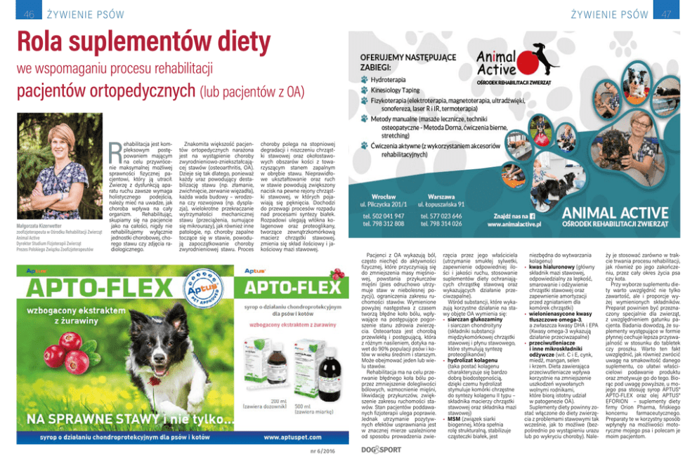 46 Ż Y WIENIE PSÓW Ż Y WIENIE PSÓW 47 Rola suplementów diety we wspomaganiu procesu rehabilitacji pacjentów ortopedycznych (lub pacjentów z OA) R Małgorzata Kizerwetter zoofizjoterapeuta w Ośrodku Rehabilitacji Zwierząt Animal Active Dyrektor Studium Fizjoterapii Zwierząt Prezes Polskiego Związku Zoofizjoterapeutów ehabilitacja jest kompleksowym postępowaniem mającym na celu przywrócenie maksymalnej możliwej sprawności fizycznej pacjentowi, który ją utracił. Zwierzę z dysfunkcją aparatu ruchu zawsze wymaga holistycznego podejścia, należy mieć na uwadze, jak choroba wpływa na cały organizm. Rehabilitując, skupiamy się na pacjencie jako na całości, nigdy nie rehabilitujemy wyłącznie jednostki chorobowej, chorego stawu czy zdjęcia radiologicznego. Znakomita większość pacjentów ortopedycznych narażona jest na wystąpienie choroby zwyrodnieniowo-zniekształcającej stawów (osteoarthritis, OA). Dzieje się tak dlatego, ponieważ każdy uraz powodujący destabilizację stawu (np. złamanie, zwichnięcie, zerwanie więzadła), każda wada budowy – wrodzona czy rozwojowa (np. dysplazja), wielokrotne przekraczanie wytrzymałości mechanicznej stawu (przeciążenia, sumujące się mikrourazy), jak również inne patologie, np. choroby zapalne toczące się w stawie, powodują zapoczątkowanie choroby zwyrodnieniowej stawu. Proces choroby polega na stopniowej degradacji i niszczeniu chrząstki stawowej oraz okołostawowych obszarów kości z towarzyszącym stanem zapalnym w obrębie stawu. Nieprawidłowe ukształtowanie oraz ruch w stawie powodują zwiększony nacisk na pewne rejony chrząstki stawowej, w których pojawiają się pęknięcia. Dochodzi do przewagi procesów rozpadu nad procesami syntezy białek. Rozpadowi ulegają włókna kolagenowe oraz proteoglikany, tworzące zewnątrzkomórkową macierz chrząstki stawowej, zmienia się skład ilościowy i jakościowy mazi stawowej. nr 6/2016 Pacjenci z OA wykazują ból, często niechęć do aktywności fizycznej, które przyczyniają się do zmniejszenia masy mięśniowej, powstania przykurczów mięśni (pies odruchowo utrzymuje staw w niebolesnej pozycji), ograniczenia zakresu ruchomości stawów. Wymienione powyżej następstwa z czasem tworzą błędne koło bólu, wpływające na postępujące pogorszenie stanu zdrowia zwierzęcia. Osteoartoza jest chorobą przewlekłą i postępującą, która z różnym nasileniem, dotyka nawet do 90% populacji psów i kotów w wieku średnim i starszym. Może obejmować jeden lub wielu stawów. Rehabilitacja ma na celu przerwanie błędnego koła bólu poprzez zmniejszenie dolegliwości bólowych, wzmocnienie mięśni, likwidację przykurczów, zwiększenie zakresu ruchomości stawów. Stan pacjentów poddawanych fizjoterapii ulega poprawie. Jednak utrzymanie pozytywnych efektów usprawniania jest w znacznej mierze uzależnione od sposobu prowadzenia zwie- DOG SPORT rzęcia przez jego właściciela (utrzymanie smukłej sylwetki, zapewnienie odpowiedniej ilości i jakości ruchu, stosowanie suplementów diety ochraniających chrząstkę stawową oraz wykazujących działanie przeciwzapalne). Wśród substancji, które wykazują korzystne działanie na stawy objęte OA wymienia się: • siarczan glukozaminy i siarczan chondroityny (składniki substancji międzykomórkowej chrząstki stawowej i płynu stawowego, które stymulują syntezę proteoglikanów) • hydrolizat kolagenu (taka postać kolagenu charakteryzuje się bardzo dobrą biodostępnością, dzięki czemu hydrolizat stymuluje komórki chrzęstne do syntezy kolagenu II typu – składnika macierzy chrząstki stawowej oraz składnika mazi stawowej) • MSM (związek siarki biogennej, która spełnia rolę strukturalną, stabilizuje cząsteczki białek, jest niezbędna do wytwarzania kolagenu) • kwas hialuronowy (główny składnik mazi stawowej, odpowiedzialny za lepkość, smarowanie i odżywienie chrząstki stawowej oraz zapewnienie amortyzacji przed zgniataniem dla komórek chrząstki) • wielonienasycone kwasy tłuszczowe omega-3, a zwłaszcza kwasy DHA i EPA (Kwasy omega-3 wykazują działanie przeciwzapalne) • przeciwutleniacze i inne mikroskładniki odżywcze (wit. C i E, cynk, miedź, mangan, selen i krzem. Dieta zawierająca przeciwutleniacze wpływa korzystnie na zmniejszenie uszkodzeń wywołanych wolnymi rodnikami, które biorą istotny udział w patogenezie OA). Suplementy diety powinny zostać włączone do diety zwierzęcia z problemami stawowymi tak wcześnie, jak to możliwe (bezpośrednio po wystąpieniu urazu lub po wykryciu choroby). Nale- ży je stosować zarówno w trakcie trwania procesu rehabilitacji, jak również po jego zakończeniu, przez cały okres życia psa czy kota. Przy wyborze suplementu diety warto uwzględnić nie tylko zawartość, ale i proporcje wyżej wymienionych składników. Preparat powinien być przeznaczony specjalnie dla zwierząt, z uwzględnieniem gatunku pacjenta. Badania dowodzą, że suplementy występujące w formie płynnej cechuje lepsza przyswajalność w stosunku do tabletek czy proszku. Warto ten fakt uwzględnić, jak również zwrócić uwagę na smakowitość danego suplementu, co ułatwi właścicielowi podawanie produktu oraz zmotywuje go do tego. Biorąc pod uwagę powyższe, u mojego psa stosuję syrop APTUS® APTO-FLEX oraz olej APTUS® EFORION – suplementy diety firmy Orion Pharma, fińskiego koncernu farmaceutycznego. Preparaty te w korzystny sposób wpłynęły na możliwości motoryczne mojego psa i polecam je moim pacjentom.