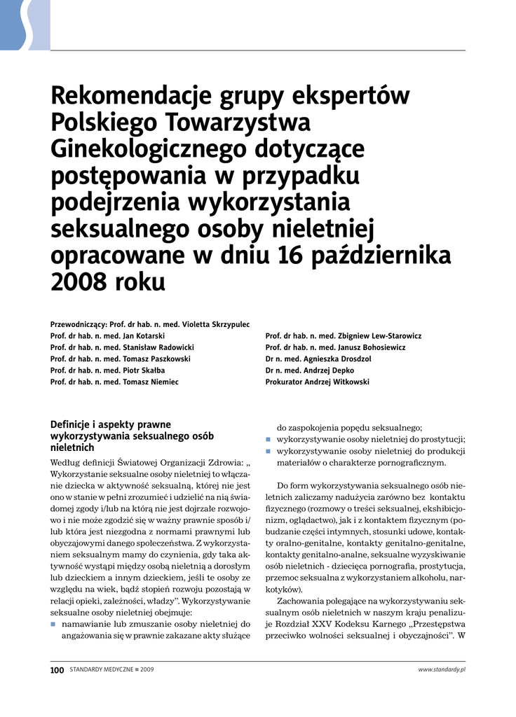 Rekomendacje grupy ekspertów Polskiego Towarzystwa Ginekologicznego dotyczące postępowania w przypadku podejrzenia wykorzystania seksualnego osoby nieletniej opracowane w dniu 16 października 2008 roku rzewodniczący: Prof. dr hab. n. med. Violetta Skrzypulec P Prof. dr hab. n. med. Jan Kotarski Prof. dr hab. n. med. Stanisław Radowicki Prof. dr hab. n. med. Tomasz Paszkowski Prof. dr hab. n. med. Piotr Skałba Prof. dr hab. n. med. Tomasz Niemiec Definicje i aspekty prawne wykorzystywania seksualnego osób nieletnich Według definicji Światowej Organizacji Zdrowia: „ Wykorzystanie seksualne osoby nieletniej to włączanie dziecka w aktywność seksualną, której nie jest ono w stanie w pełni zrozumieć i udzielić na nią świadomej zgody i/lub na którą nie jest dojrzałe rozwojowo i nie może zgodzić się w ważny prawnie sposób i/ lub która jest niezgodna z normami prawnymi lub obyczajowymi danego społeczeństwa. Z wykorzystaniem seksualnym mamy do czynienia, gdy taka aktywność wystąpi między osobą nieletnią a dorosłym lub dzieckiem a innym dzieckiem, jeśli te osoby ze względu na wiek, bądź stopień rozwoju pozostają w relacji opieki, zależności, władzy”. Wykorzystywanie seksualne osoby nieletniej obejmuje: nn namawianie lub zmuszanie osoby nieletniej do angażowania się w prawnie zakazane akty służące 100 standardy medyczne n 2009 rof. dr hab. n. med. Zbigniew Lew-Starowicz P Prof. dr hab. n. med. Janusz Bohosiewicz Dr n. med. Agnieszka Drosdzol Dr n. med. Andrzej Depko Prokurator Andrzej Witkowski do zaspokojenia popędu seksualnego; nn wykorzystywanie osoby nieletniej do prostytucji; nn wykorzystywanie osoby nieletniej do produkcji materiałów o charakterze pornograficznym. Do form wykorzystywania seksualnego osób nieletnich zaliczamy nadużycia zarówno bez kontaktu fizycznego (rozmowy o treści seksualnej, ekshibicjonizm, oglądactwo), jak i z kontaktem fizycznym (pobudzanie części intymnych, stosunki udowe, kontakty oralno-genitalne, kontakty genitalno-genitalne, kontakty genitalno-analne, seksualne wyzyskiwanie osób nieletnich - dziecięca pornografia, prostytucja, przemoc seksualna z wykorzystaniem alkoholu, narkotyków). Zachowania polegające na wykorzystywaniu seksualnym osób nieletnich w naszym kraju penalizuje Rozdział XXV Kodeksu Karnego „Przestępstwa przeciwko wolności seksualnej i obyczajności”. W www.standardy.pl szczególności zachowań wobec osób nieletnich dotyczą następujące przepisy Kodeksu Karnego: nn Art. 199 kk „§ 1. Kto, przez nadużycie stosunku zależności lub wykorzystanie krytycznego położenia, doprowadza inną osobę do obcowania płciowego lub do poddania się innej czynności seksualnej albo do wykonania takiej czynności, podlega karze pozbawienia wolności do lat 3. § 2. Jeżeli czyn określony w § 1 został popełniony na szkodę małoletniego, sprawca podlega karze pozbawienia wolności od 3 miesięcy do lat 5. § 3. Karze określonej w § 2 podlega, kto doprowadza małoletniego do obcowania płciowego lub poddania się innej czynności seksualnej albo do wykonania takiej czynności, nadużywając zaufania lub udzielając mu korzyści majątkowej lub osobistej, albo jej obietnicy”; nn Art. 200 kk: „§ 1. Kto obcuje płciowo z małoletnim poniżej lat 15 lub dopuszcza się wobec takiej osoby innej czynności seksualnej lub doprowadza ją do poddania się takim czynnościom albo do ich wykonania, podlega karze pozbawienia wolności od lat 2 do 12. § 2. Tej samej karze podlega, kto w celu zaspokojenia seksualnego prezentuje małoletniemu poniżej lat 15 wykonanie czynności seksualnej”; nn Art. 201 kk: „Kto dopuszcza się obcowania płciowego w stosunku do wstępnego, zstępnego, przysposobionego, przysposabiającego, brata lub siostry, podlega karze pozbawienia wolności od 3 miesięcy do lat 5”; nn Art. 202 kk: „§ 1. Kto publicznie prezentuje treści pornograficzne w taki sposób, że może to narzucić ich odbiór osobie, która tego sobie nie życzy, podlega grzywnie, karze ograniczenia wolności albo pozbawienia wolności do roku. § 2. Kto małoletniemu poniżej lat 15 prezentuje treści pornograficzne lub udostępnia mu przedmioty mające taki charakter albo rozpowszechnia treści pornograficzne w sposób umożliwiający takiemu małoletniemu zapoznanie się z nimi, podlega grzywnie, karze ograniczenia wolności albo pozbawienia wolności do lat 2. § 3. Kto w celu rozpowszechniania produkuje, utrwala lub sprowadza, przechowuje lub posiada albo rozpowszechnia lub publicznie prezentuje treści pornograficzne z udziałem małoletniego albo treści pornograficzne związane z prezentowaniem przemocy lub posługiwaniem się zwie- www.standardy.pl rzęciem, podlega karze pozbawienia wolności od 6 miesięcy do lat 8. § 4. Kto utrwala treści pornograficzne z udziałem małoletniego poniżej lat 15, podlega karze pozbawienia wolności od roku do lat 10. § 4a. Kto sprowadza, przechowuje lub posiada treści pornograficzne z udziałem małoletniego poniżej lat 15, podlega karze pozbawienia wolności od 3 miesięcy do lat 5”; nn Art. 204 kk: „§ 1. Kto, w celu osiągnięcia korzyści majątkowej, nakłania inną osobę do uprawiania prostytucji lub jej to ułatwia, podlega karze pozbawienia wolności do lat 3. § 3. Jeżeli osoba określona w § 1 lub 2 jest małoletnim, sprawca podlega karze pozbawienia wolności od roku do lat 10”; Obowiązki związane z ujawnieniem przestępstwa, czy też podejrzeniem popełnienia takiego czynu reguluje art. 304 Kodeksu Postępowania Karnego, tak w stosunku do instytucji, jak i osób fizycznych: nn Art. 304 kpk: „§ 1. Każdy dowiedziawszy się o popełnieniu przestępstwa ściganego z urzędu ma społeczny obowiązek zawiadomić o tym prokuratora lub Policję. § 2. Instytucje państwowe i samorządowe, które w związku ze swą działalnością dowiedziały się o popełnieniu przestępstwa ściganego z urzędu, są obowiązane n