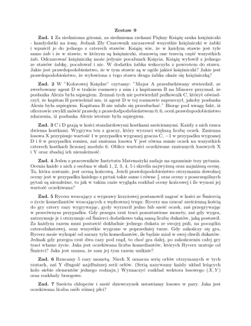 Zestaw 9 Zad. 1 Za siedmioma górami, za siedmioma rzekami Piękny Książę szuka księżniczki - kandydatki na żonę. Jednak Zły Czarownik zaczarował wszystkie księżniczki w żabki i wpuścił je do jednego z czterech stawów. Książę wie, że w każdym stawie jest tyle samo żab i że w stawie, w którym są księżniczki, stanowią one trzecią część wszystkich żab. Odczarować księżniczkę może jedynie pocałunek Księcia. Książę wyłowił z jednego ze stawów żabkę, pocałował i nic. W dodatku żabka wskoczyła z powrotem do stawu. Jakie jest prawdopodobieństwo, że w tym stawie są w ogóle jakieś księżniczki? Jakie jest prawdopodobieństwo, że wyłowiona z tego stawu druga żabka okaże się księżniczką? Zad. 2 W ”Kolorowej Księdze” czytamy: ”Major A przesłuchiwany stwierdził, ze zwerbowany agent D w trakcie rozmowy z nim i z kapitanem B na Minorce przyznał, że posłanka Alexis była szpiegiem. Zeznań tych nie potwierdził pułkownik C, któryt oświadczył, że kapitan B powiedział mu, iż agent D w tej rozmowie zaprzeczył, jakoby posłanka Alexis była szpiegiem. Kapitana B nie udało się przesłuchać.” Biorąc pod uwagę fakt, iż oficerowie zwykli mówić prawdę z prawdodpodobieństwem 0, 6, oceń prawdopodobieństwo zdarzenia, iż posłanka Alexis istotnie była szpiegiem. Zad. 3 C i D grają w kości standardowymi kostkami sześciennymi. Każdy z nich rzuca dwiema kostkami. Wygrywa ten z graczy, który wyrzuci większą liczbę oczek. Zmienna losowa X przypisuje wartość 1 w przypadku wygranej gracza C, −1 w przypadku wygranej D i 0 w przypadku remisu, zaś zmienna losowa Y jest równa sumie oczek na wszystkich czterech kostkach liczonej modulo 6. Oblicz wartości oczekiwane zmiennych losowych X i Y oraz zbadaj ich niezależność. Zad. 4 Jeden z pracowników Instytutu Matematyki zadaje na egzaminie trzy pytania. Ocenia każde z nich z osobna w skali 1, 2, 3, 4, 5 i skreśla najwyższą oraz najniższą ocenę. Ta, która zostanie, jest oceną końcową. Jeżeli prawdopodobieństwo otrzymania dowolnej oceny jest w przypadku każdego z pytań takie same i równe 15 oraz oceny z poszczególnych pytań są niezależne, to jak w takim razie wygląda rozkład oceny końcowej i ile wynosi jej wartość oczekiwana? Zad. 5 Rycerz wracający z wyprawy krzyżowej postanowił zagrać w kości ze Śmiercią o życie komediantów wracających z wędrownej trupy. Rycerz ma rzucać sześcienną kością do gry cztery razy wygrywając, gydy wyrzucił jedno lub sześć oczek, zaś przegrywając w przeciwnym przypadku. Gdy przegra rzut traci pozostawione monety, zaś gdy wygra, zatrzymuje je i otrzymuje od Śmierci dodatkowo taką samą liczbę dukatów, jaką postawił. Za każdym razem musi postawić dokładnie jednego dukata ze swojej puli, na początku czterodukatowej, oraz wszystkie wygrane w poprzedniej turze. Gdy zakończy się gra, Rycerz może wykupić od zarazy tylu komediantów, ile będzie miał w owej chwili dukatów. Jednak gdy przegra rzut dwa razy pod rząd, to choć gra dalej, po zakończeniu całej gry traci własne życie. Jaka jest oczekiwana liczba komediantów, których Rycerz uratuje od Śmierci? Jaka jest szansa, że sam jej tym razem uniknie? Zad. 6 Rzucamy 5 razy monetą. Niech X oznacza serię orłów otrzymanych w tych rzutach, zaś Y długość najdłuższej serii orłów. (Serią nazywamy każdy układ leżących koło siebie elementów jednego rodzaju.) Wyznaczyć rozkład wektora losowego (X, Y ) oraz rozkłady brzegowe. Zad. 7 Sześciu chłopców i sześć dziewczynek ustawiamy losowo w pary. Jaka jest oczekiwana liczba osób różnej płci? Zad. 8 Kacper i Melchior grają w następującą grę: losują z odcinka [0, 1] liczby zgodnie z rozkładem jednostajnym - Kacper dwie niezaleznie od siebie, zaś Melchior jedną, również niezależnie od liczb, które wylosował Kacper. Następnie Kacper mnoży dwie swoje liczby przez siebie, zaś Melchior podnosi swoją do kwadratu, a później obaj podają uzyskane wyniki/ Zwycięża ten, kto poda większą liczbę. Który z nich ma większe szanse na wygraną? Zad. 9 W urnie znajduje się 5 kul białych i 3 kule czarne. Losujemy kolejno po dwie kule bez zwracania. Ile wynosi oczekiwany numer losowania, w którym po raz pierwszy wylosujemy dwie kule różnego koloru? Jakie jest prawdopodobieństwo, że numer ten równa się 3, jeżeli obie kule wylosowane za drugim razem były białe? Zad. 10 W urnie jest 7 kul niebieskich i 3 białe. Losujemy z urny bez zwaracania tak długo, aż pozostaną w niej kule jednego koloru. Jaka jest oczekiwana liczba kul, które pozostaną w urnie? Zad. 11 Pewien człowiek ma dwa pudełka zapałek, w lewej i prawej kieszeni po jednym. W każdym z nich są cztery zapałki. Wyciągając zapałki na chybił-trafił z jednej lub drugiej kieszeni, stwierdza w pewnym momencie, że pudełko, do którego sięgnął, jest puste. Niech zmienna losowa ξ oznacza liczbę zapałek w drugim pudełku. Znajdź Eξ. Zad. 12 Na stole stoja dwie urny. W pierwszej z nich znajdują się dwie kule: biała i czerwona. Druga urna jest pusta. Rzucamy symetryczną monetą - gdy wypadnie orzeł, przenosimy z urny do urny kulę białą, gdy reszka, to przenosimy czerwoną. Doświadczenie kontynuujemy, dopóki obie kule nie znajdą się w tej samej urnie. a) Pokaż, że z prawdopodobieństwem 1 doświadczenie zakończy się w skończonym czasie. b) Znajdź oczekiwaną długość trwania doświadczenia (mierzoną liczba rzutów monetą). Zad. 13 Studenci zdają egzamin z rachunku prawdopodobieństwa w dwóch salach dużej i małej. Egzamin trwa trzy godziny. Przy egzaminie obecne są dwie asystentki Abacka i Babacka. Co kwadrans jedna z nich przechodzi z sali, w której się znajduje do drugiej sali (prawdopodobieństwo, że tą osobą będzie Abacka lub Babacka jest takie samo dla każdej z nich i wynosi 12 ). Po dwóch godzinach zjawia się na egzaminie wykładowca C