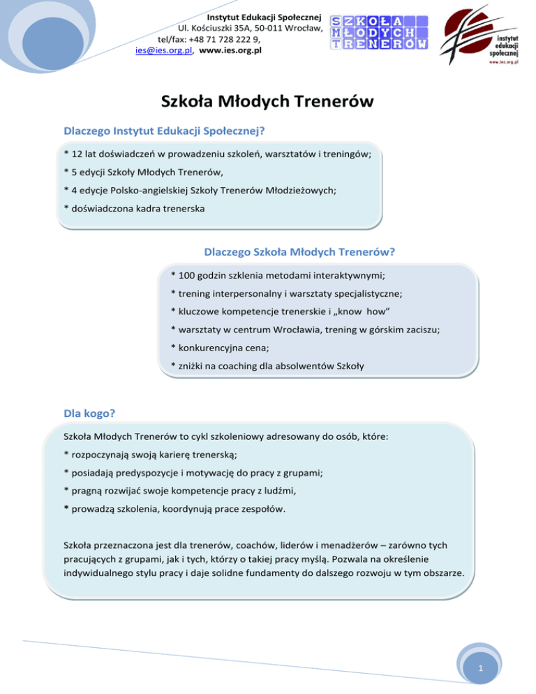 Instytut Edukacji Społecznej Ul. Kościuszki 35A, 50-011 Wrocław, tel/fax: +48 71 728 222 9, [email protected], www.ies.org.pl Szkoła Młodych Trenerów Dlaczego Instytut Edukacji Społecznej? * 12 lat doświadczeń w prowadzeniu szkoleń, warsztatów i treningów; * 5 edycji Szkoły Młodych Trenerów, * 4 edycje Polsko-angielskiej Szkoły Trenerów Młodzieżowych; * doświadczona kadra trenerska Dlaczego Szkoła Młodych Trenerów? * 100 godzin szklenia metodami interaktywnymi; * trening interpersonalny i warsztaty specjalistyczne; * kluczowe kompetencje trenerskie i „know how” * warsztaty w centrum Wrocławia, trening w górskim zaciszu; * konkurencyjna cena; * zniżki na coaching dla absolwentów Szkoły Dla kogo? Szkoła Młodych Trenerów to cykl szkoleniowy adresowany do osób, które: * rozpoczynają swoją karierę trenerską; * posiadają predyspozycje i motywację do pracy z grupami; * pragną rozwijać swoje kompetencje pracy z ludźmi, * prowadzą szkolenia, koordynują prace zespołów. Szkoła przeznaczona jest dla trenerów, coachów, liderów i menadżerów – zarówno tych pracujących z grupami, jak i tych, którzy o takiej pracy myślą. Pozwala na określenie indywidualnego stylu pracy i daje solidne fundamenty do dalszego rozwoju w tym obszarze. 1 Instytut Edukacji Społecznej Ul. Kościuszki 35A, 50-011 Wrocław, tel/fax: +48 71 728 222 9, [email protected], www.ies.org.pl Program Szkoła Młodych Trenerów Instytutu Edukacji Społecznej obejmuje 100 godzin szkoleniowych, na które składają się: wyjazdowy trening interpersonalny (40 godzin) oraz trzy warsztaty stacjonarne (60 godzin). Lp. Zajęcia Liczba godzin 40 1. Trening interpersonalny (śr-nd) 2. Warsztat 1 (sb-nd) 20 3. Warsztat 2 (sb-nd) 20 4. Warsztat 3 (sb-nd) 20 Zakres Trening interpersonalny poświęcony jest rozwojowi osobistemu i społecznemu poprzez doświadczenie. Wymaga od uczestników zaangażowania i aktywności, a ma na celu rozwój kompetencji społecznych i osobistych, a także zwiększenie samoświadomości zachowań, uczuć, motywów i postaw, nauczenie się wyrażania myśli i emocji, większe rozumienie zachowań własnych i innych ludzi, zwiększenie kompetencji w zakresie radzenia sobie z konfliktem. Uczestnicy doświadczą w trakcie niego procesu grupowego oraz będę mieli możliwość zaobserwowania relacji pomiędzy sobą, a procesami społecznymi zachodzącymi w grupie. Efektem treningu jest też wysokie poczucie bezpieczeństwa i zaufania w grupie oraz większa przestrzeń do dalszej współpracy i uczenia się razem. Proces grupowy: lepsze rozumienie procesów zachodzących w grupach, Kontrakt jako narzędzie pracy z grupą, metody wprowadzania i pracy z kontraktem grupowym, Podstawy coachingu – budowanie kontaktu Zmiana: teoria i warunki zmiany, rozumienie i wspieranie procesu zmiany, Uczenie się: cykl uczenia się przez doświadczanie, narzędzia wspierające proces uczenia się, Projektowanie szkolenia: diagnoza i definiowanie celów szkolenia, przegląd metod i technik, ewaluacja szkolenia Opór, kryzys i trudne sytuacje: diagnoza i reagowanie Superwizja i osobisty styl pracy: rozwiązywanie indywidualnych, bieżących problemów w pracy z grupami, zwiększenie świadomości swoich mocnych i słabych stron Jeśli chcesz wziąć udział tylko w treningu interpersonalnym, zapraszamy do skorzystania z oferty „trening interpersonalny” dostępnej na www.ies.org.pl Warsztaty będą realizowane w oparciu o najnowsze metody pracy grupowej: ćwiczenia, gry, symulacje, ustawienia systemowe, drama, psychodrama, analizy przypadków, mini-wykład, praca w grupach, dyskusja. Tak by maksymalnie zapewnić uczestnikom możliwość rozwijania umiejętności w procesie doświadczania. 2 Instytut Edukacji Społecznej Ul. Kościuszki 35A, 50-011 Wrocław, tel/fax: +48 71 728 222 9, [email protected], www.ies.org.pl Miejsce Warsztaty: Instytut Edukacji Społecznej ul. Kościuszki 35BE, 50-011 Wrocław Trening interpersonalny: Kotlina Kłodzka Termin Dokładne terminy zajęć będą ustalane z uczestnikami po skompletowaniu grupy. Koszt Koszt udziału w Szkole Młodych Trenerów wynosi 2500zł Dodatkowo uczestnicy pokrywają koszt zakwaterowania i wyżywienia podczas treningu interpersonalnego: 350 zł Rekrutacja Aby zgłosić udział w Szkole Młodych Trenerów należy wypełnić formularz zgłoszeniowy dostępny na stronie ww.ies.org.pl. Kandydatów zapraszamy na rozmowy rekrutacyjne, które odbywać będą się we Wrocławiu. Certyfikat uczestnicy, po zakończeniu Szkoły, otrzymają certyfikat ukończenia Szkoły Młodych Trenerów Instytutu Edukacji Społecznej określający liczbę godzin szkoleniowych oraz tematykę zajęć; uczestnictwo w Szkole obejmującej 100 godzin szkoleniowych, prowadzonych metodami aktywnymi, upoważnia do uczestniczenia w kolejnych kursach i szkołach; uczestnictwo w Szkole daje narzędzia do samodzielnego prowadzenia warsztatów oraz podjęcia własnej praktyki trenerskiej; po zakończeniu Szkoły istnieje także możliwość podjęcia współpracy trenerskiej z Instytutem. 3 Instytut Edukacji Społecznej Ul. Kościuszki 35A, 50-011 Wrocław, tel/fax: +48 71 728 222 9, [email protected], www.ies.org.pl Szkoła Młodych Trenerów ma charakter autorski. Trenerami Szkoły są: Paweł Dębek, coach, trener, doradca. Od 12 lat specjalizuje się w treningu kompetencji interpersonalnych. Przeprowadził ponad 5000 godzin szkoleń. Jest autorem programów z zakresu przywództwa i treningu trenerów. Prowadzi coaching indywidualny. Studiował psychologię i socjologię, szkolił się w zakresie treningu grupowego, psychoterapii i socjoterapii. Kinga Ekert, trener i animator. Andragog, absolwentka Studium Socjoterapii oraz szkoleń z zakresu umiejętności społecznych i pracy z grupą. Posiada doświadczenie w zakresie prowadzenia szkoleń, warsztatów i treningów z obszaru umiejętności społecznych, komunikacji i pracy w zespole. Zapraszamy również do
