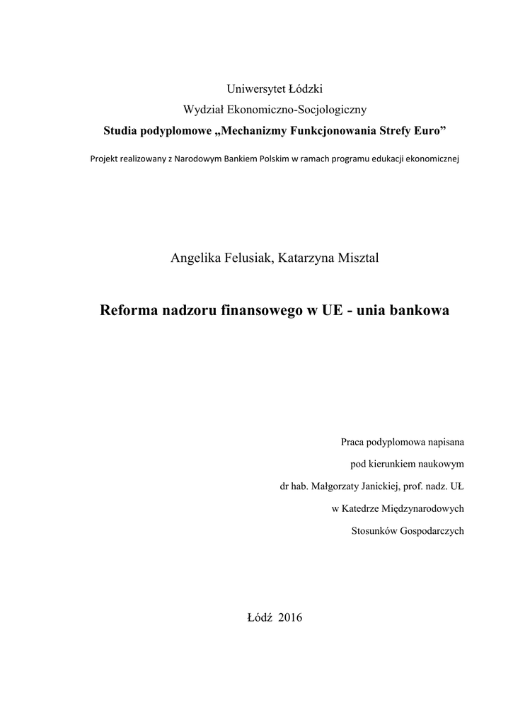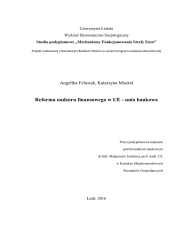 Uniwersytet Łódzki Wydział Ekonomiczno-Socjologiczny Studia podyplomowe „Mechanizmy Funkcjonowania Strefy Euro” Projekt realizowany z Narodowym Bankiem Polskim w ramach programu edukacji ekonomicznej Angelika Felusiak, Katarzyna Misztal Reforma nadzoru finansowego w UE - unia bankowa Praca podyplomowa napisana pod kierunkiem naukowym dr hab. Małgorzaty Janickiej, prof. nadz. UŁ w Katedrze Międzynarodowych Stosunków Gospodarczych Łódź 2016 Spis treści Wstęp…………………………………………………………………………………... 3 Rozdział 1 Sektor bankowy i nadzór finansowy w Europie ……………………… 4 1.1 Sektor bankowy Unii Europejskiej……………………………………………...… 4 1.2 Kryzys bankowy ………………………………………………………………… 6 1.3 Reformy nadzoru finansowego w Europie………………………………..…….… 9 Rozdział 2 Unia bankowa ………………………………………………………..… 13 2.1 Geneza powstania oraz cele powstania unii bankowej…………………….......… 13 2.2 Trzy filary unii bankowej…………………………………………………….….. 14 Rozdział 3 Perspektywa przyjęcia unii bankowej przez kraje spoza strefy euro na przykładzie Polski………………………………………………………………..… 20 Zakończenie ………………………………………………………………………... 25 Bibliografia ………………………………………………………………..…..……. 26 Spis tabel ………………………………………………………………….………… 29 2 Wstęp Unia bankowa to projekt, który ma zapewnić bezpieczeństwo i stabilność sektora finansowego strefy euro. Organy europejskie widzą w niej także sposób na zapobieganie kryzysom. Utrzymanie stabilnego rynku finansowego w strefie euro ma znaczenie również dla krajów spoza strefy. Sytuacja w państwach strefy pośrednio na nie wpływa. Celem pracy jest analiza kosztów i korzyści jakie niesie ze sobą przystąpienie do unii bankowej krajów, które nie należą do strefy euro. Praca składa się z trzech rozdziałów. W rozdziale pierwszym znajduje się krótka charakterystyka sektora bankowego Unii Europejskiej oraz przyczyny kryzysu w sektorze bankowym w latach 2008-2011. Mowa także o działaniach, jakie zostały podjęte w celu zmniejszenia lub całkowitego usunięcia jego skutków. Rozdział drugi został poświęcony genezie powstania unii bankowej. Zostały opisane w nim trzy filary, na których opiera się unia bankowa oraz jej struktura. Rozdział drugi zawiera również informacje o celach utworzenia unii bankowej. Rozdział trzeci w całości skupia się na szansach i zagrożeniach przystąpienia do unii bankowej krajów spoza strefy euro, ze szczególnym uwzględnieniem Polski. Przedstawia korzyści, jakie te państwa mogą osiągnąć. Zostały w nim zawarte również rozważania na temat skutków negatywnych wynikających z odmówienia bliskiej współpracy i przystąpienia do unii bankowej. 3 1. Sektor bankowy i nadzór finansowy w Europie 1.1 Sektor bankowy Unii Europejskiej Europejski Bank Centralny (EBC), banki centralne państw członkowskich strefy euro oraz banki centralne państw członkowskich Unii Europejskiej, które nie należą do strefy euro tworzą Europejski System Banków Centralnych (ESBC). EBC pełni funkcję odpowiadającą funkcji banków centralnych poszczególnych państw, tzn. przede wszystkim prowadzi politykę pieniężną w strefie euro. W skład Europejskiego Systemu Banków Centralnych wchodzą: 1. Eurosystem, który składa się z Europejskiego Banku Centralnego oraz banków centralnych państw, które przyjęły walutę euro. Do tych krajów należą: Austria, Belgia, Finlandia, Francja, Niemcy, Grecja, Irlandia, Włochy, Luksemburg, Holandia, Portugalia, Hiszpania, Słowenia, Malta, Cypr, Słowacja, Estonia, Łotwa i Litwa, 2. narodowe banki centralne państw członkowskich Unii Europejskiej, które nie przyjęły waluty euro (Dania, Szwecja, Wielka Brytania, Polska, Czechy, Węgry, Bułgaria, Rumunia i Chorwacja). W zakresie polityki pieniężnej postępują one zgodnie z ustawami krajowymi i mogą w ramach ESBC prowadzić własną politykę pieniężną. Organami decyzyjnymi Europejskiego Systemu Banków Centralnych są organy decyzyjne Europejskiego Banku Centralnego, do których należą Rada Prezesów i Rada Ogólna.1 Do głównych zadań EBC należy osiągniecie i utrzymanie stabilności cenowej na rynku, zdefiniowanie i prowadzenie polityki monetarnej w strefie euro, prowadzenie polityki emisyjnej euro oraz operacji wymiany walut, zarządzanie rezerwami pieniężnymi państw członkowski Unii Europejskiej, opracowanie sprawnego systemu płatniczego, organizacja i funkcjonowanie odpowiedniego systemu rozliczeń, a także gromadzenie informacji statystycznych w ramach analizy i oceny działania całego sektora finansowego.2 1 https://pl.wikipedia.org/wiki/Europejski_System_Bank%C3%B3w_Centralnych, dostęp 28.04.2016 Sokołowska E., Struktura organizacyjna i zadania Europejskiego Systemu Banków Centralnych, http://coin.wne.uw.edu.pl/finanse/Artykuly/Ewa_Sokolowska_Struktura_grganizacyjna_i_zadania_Europejsk ie.html 2 4 Za priorytetowe zasady działania Europejskiego Systemu Banków Centralnych uważa się: niezależność, przejrzystość, przewidywalność i odpowiedzialność. Niezależność od władz politycznych pozwala na utrzymanie stabilności cen, zaś zasada przejrzystości oznacza przekazywanie rynkom i opinii publicznej informacji o działaniach podejmowanych przez ESBC. Ważne, aby informacje te przekazane były w sposób jasny, zrozumiały oraz w odpowiednim czasie. Tak udostępnione informacje na temat podejmowanych działań pozwalają na przewidywalność działań EBC i dostosowanie się rynku do jego reakcji na bo