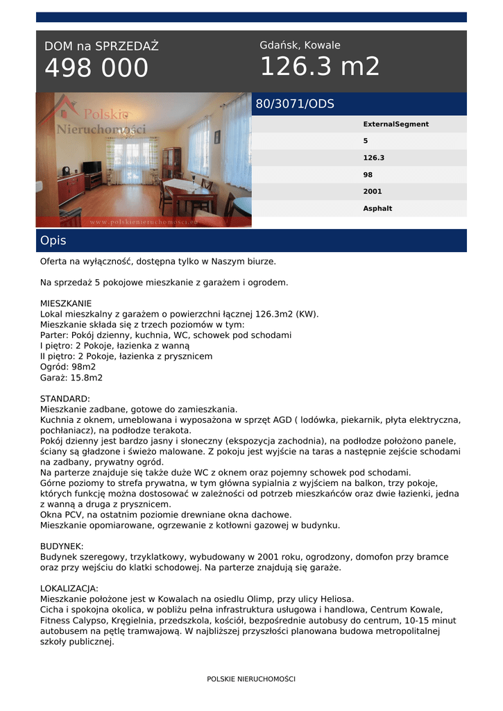DOM na SPRZEDAŻ 498 000 Gdańsk, Kowale 126.3 m2 80/3071/ODS ExternalSegment 5 126.3 98 2001 Asphalt Opis Oferta na wyłączność, dostępna tylko w Naszym biurze. Na sprzedaż 5 pokojowe mieszkanie z garażem i ogrodem. MIESZKANIE Lokal mieszkalny z garażem o powierzchni łącznej 126.3m2 (KW). Mieszkanie składa się z trzech poziomów w tym: Parter: Pokój dzienny, kuchnia, WC, schowek pod schodami I piętro: 2 Pokoje, łazienka z wanną II piętro: 2 Pokoje, łazienka z prysznicem Ogród: 98m2 Garaż: 15.8m2 STANDARD: Mieszkanie zadbane, gotowe do zamieszkania. Kuchnia z oknem, umeblowana i wyposażona w sprzęt AGD ( lodówka, piekarnik, płyta elektryczna, pochłaniacz), na podłodze terakota. Pokój dzienny jest bardzo jasny i słoneczny (ekspozycja zachodnia), na podłodze położono panele, ściany są gładzone i świeżo malowane. Z pokoju jest wyjście na taras a następnie zejście schodami na zadbany, prywatny ogród. Na parterze znajduje się także duże WC z oknem oraz pojemny schowek pod schodami. Górne poziomy to strefa prywatna, w tym główna sypialnia z wyjściem na balkon, trzy pokoje, których funkcję można dostosować w zależności od potrzeb mieszkańców oraz dwie łazienki, jedna z wanną a druga z prysznicem. Okna PCV, na ostatnim poziomie drewniane okna dachowe. Mieszkanie opomiarowane, ogrzewanie z kotłowni gazowej w budynku. BUDYNEK: Budynek szeregowy, trzyklatkowy, wybudowany w 2001 roku, ogrodzony, domofon przy bramce oraz przy wejściu do klatki schodowej. Na parterze znajdują się garaże. LOKALIZACJA: Mieszkanie położone jest w Kowalach na osiedlu Olimp, przy ulicy Heliosa. Cicha i spokojna okolica, w pobliżu pełna infrastruktura usługowa i handlowa, Centrum Kowale, Fitness Calypso, Kręgielnia, przedszkola, kościół, bezpośrednie autobusy do centrum, 10-15 minut autobusem na pętlę tramwajową. W najbliższej przyszłości planowana budowa metropolitalnej szkoły publicznej. POLSKIE NIERUCHOMOŚCI Zapraszam na prezentację. * Przedstawione informacje zostały opracowane na podstawie danych uzyskanych od Zamawiającego, mają jedynie charakter informacyjny i mogą ulec zmianie. * Niniejsza oferta nie stanowi oferty w rozumieniu Kodeksu Cywilnego. * Pozostałe oferty dostępne na stronie internetowej www.polskienieruchomosci.eu i www.polnie.pl * Wszystkie transakcje przeprowadzane przy udziale naszego biura nadzorowane są przez licencjonowanego pośrednika. Zamieszczone zdjęcia są Naszą własnością. Publikowanie, kopiowanie, przetwarzanie oraz wykorzystanie niniejszych zdjęć bez wiedzy i zgody autora jest zabronione. Marta Wierucka tel. 530 064 100 email: [email protected] POLSKIE NIERUCHOMOŚCI Powered by TCPDF (www.tcpdf.org)
