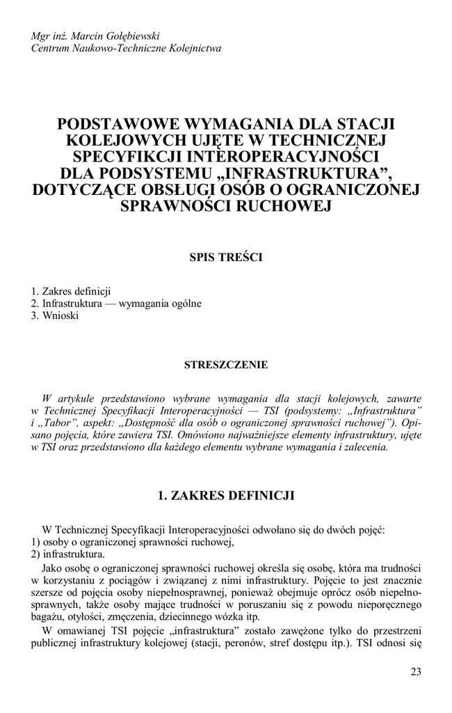 Mgr inż. Marcin Gołębiewski Centrum Naukowo-Techniczne Kolejnictwa PODSTAWOWE WYMAGANIA DLA STACJI KOLEJOWYCH UJĘTE W TECHNICZNEJ SPECYFIKCJI INTEROPERACYJNOŚCI DLA PODSYSTEMU „INFRASTRUKTURA”, DOTYCZĄCE OBSŁUGI OSÓB O OGRANICZONEJ SPRAWNOŚCI RUCHOWEJ SPIS TREŚCI 1. Zakres definicji 2. Infrastruktura — wymagania ogólne 3. Wnioski STRESZCZENIE W artykule przedstawiono wybrane wymagania dla stacji kolejowych, zawarte w Technicznej Specyfikacji Interoperacyjności — TSI (podsystemy: „Infrastruktura” i „Tabor”, aspekt: „Dostępność dla osób o ograniczonej sprawności ruchowej”). Opisano pojęcia, które zawiera TSI. Omówiono najważniejsze elementy infrastruktury, ujęte w TSI oraz przedstawiono dla każdego elementu wybrane wymagania i zalecenia. 1. ZAKRES DEFINICJI W Technicznej Specyfikacji Interoperacyjności odwołano się do dwóch pojęć: 1) osoby o ograniczonej sprawności ruchowej, 2) infrastruktura. Jako osobę o ograniczonej sprawności ruchowej określa się osobę, która ma trudności w korzystaniu z pociągów i związanej z nimi infrastruktury. Pojęcie to jest znacznie szersze od pojęcia osoby niepełnosprawnej, ponieważ obejmuje oprócz osób niepełnosprawnych, także osoby mające trudności w poruszaniu się z powodu nieporęcznego bagażu, otyłości, zmęczenia, dziecinnego wózka itp. W omawianej TSI pojęcie „infrastruktura” zostało zawężone tylko do przestrzeni publicznej infrastruktury kolejowej (stacji, peronów, stref dostępu itp.). TSI odnosi się 23 bezpośrednio do przestrzeni publicznej stacji oraz stref ich dostępu i dotyczy kolei konwencjonalnej i kolei dużych prędkości. 2. INFRASTRUKTURA — WYMAGANIA OGÓLNE W specyfikacji TSI jako elementy podsystemu „Infrastruktura”, związane z dostępnością dla osób o ograniczonej sprawności ruchowej, są wymienione: — parkingi dla osób o ograniczonej sprawności ruchowej, — drzwi oraz wejścia jednopoziomowe, — trasy dla pasażerów, główne ciągi piesze, — posadzki, — informacje dotykowe, — ścieżki kierunkowe, — przeszklone drzwi oraz oznaczenia ścienne, — toalety, — meble, — kasy lub automaty biletowe/okienka informacyjne, — urządzenia do kontroli biletów, — oświetlenie, — informacje wizualne — drogowskazy, piktogramy, informacja dynamiczna, — informacje mówione, — wyjścia ewakuacyjne, alarmy, — geometria kładek dla pieszych i przejść podziemnych, — schody, — poręcze, — podjazdy, schody ruchome, windy, chodniki ruchome, — wysokości peronów i odległości peron—oś toru, — szerokości peronów i krawędzie peronów, — zakończenia peronów, — urządzenia wspomagające wsiadanie, — jednopoziomowe przejścia przez tory. Dla wszystkich wymienionych elementów w specyfikacji TSI przedstawiono warunki i wymagania, które powinny być spełnione. Należy w tym miejscu zaznaczyć, że specyfikacja nie narzuca konkretnych rozwiązań technicznych ani też nie zamyka możliwości przyjęcia rozwiązań nowatorskich. W jednym z kolejnych rozdziałów TSI jest opisany sposób postępowania w przypadku takich właśnie rozwiązań. 2.1. Parkingi dla osób o ograniczonej sprawności ruchowej W TSI napisano, że miejsca parkingowe dla osób o ograniczonej sprawności ruchowej powinny być, w miarę możliwości, usytuowane jak najbliżej wejść dostępnych dla tych osób. Korzystać z takich miejsc mogą osoby uprawnione do korzystania z miejsc parkingowych dla osób niepełnosprawnych. Pozostałe wymagania (liczba miejsc, wymiary, lokalizacja, oznaczenia itp.) nie dotyczą kolei i dlatego są regulowane za pomocą przepisów europejskich lub krajowych. 24 2.2. Trasa wolna od przeszkód Trasa wolna od przeszkód, według specyfikacji TSI, jest to ciąg komunikacyjny, po którym swobodnie mogą się przemieszczać pasażerowie, w tym osoby należące do grupy osób o ograniczonej sprawności ruchowej. Według specyfikacji należy zapewnić co najmniej jedną trasę wolną od przeszkód, która powinna łączyć występujące na danej stacji punkty i usługi: — punkty zatrzymania innych środków transportu na terenie stacji (postój taksówek, metro, tramwaj itp.), — parkingi, — wejścia i wyjścia dostępne dla osób o ograniczonej sprawności ruchowej, — punkty informacyjne, — inne systemy informacyjne, — kasy i automaty biletowe, — obsługa klienta, — poczekalnie, — przechowalnie bagażu, — toalety, — perony. Wymaga się, aby trasy wolne od przeszkód, kładki dla pieszych, przejścia podziemne oraz schody miały szerokość minimum 1600 mm i wysokość minimum 2300 mm. Należy tutaj podkreślić, że najmniejsza szerokość nie uwzględnia szerokości dodatkowej, która powinna zapewniać sprawny przepływ pasażerów oraz że te wymagania nie dotyczą schodów, chodników ruchomych i wind. Materiał, z którego jest wykonana posadzka tras wolnych powinien mieć właściwości przeciwodblaskowe, a długość trasy powinna być możliwie najmniejsza. Dla stacji, które obsługują mniej niż 1000 pasażerów dziennie (pasażerowie wysiadający i wsiadający) przewidziano możliwość zrezygnowania z instalowania wind lub podjazdów, o ile na linii w promieniu 50 km znajduje się inna stacja z trasą wolną od przeszkód, wyposażona w te urządzenia. Oznakowanie trasy wolnej od przeszkód powinno być zgodne z zapisami dotyczącymi informacji wizualnej. Dla osób z upośledzeniem wzroku przewidziano możliwość informowania o trasie minimum w jeden z trzech następujących sposobów: 1) zastosowanie na całej długości trasy ścieżek dotykowych; 2) zastosowanie mówiących znaków; 3) umieszczenie informacji na tylnej części poręczy pismem wypukłym lub alfabetem Braille`a. Ponadto przewidziano umieszczenie informacji dotykowych na tylnej ścianie poręczy lub samej ścianie na wysokości pomiędzy 850 a 1000 mm, pod warunkiem że na całej trasie wolnej od przeszkód są um