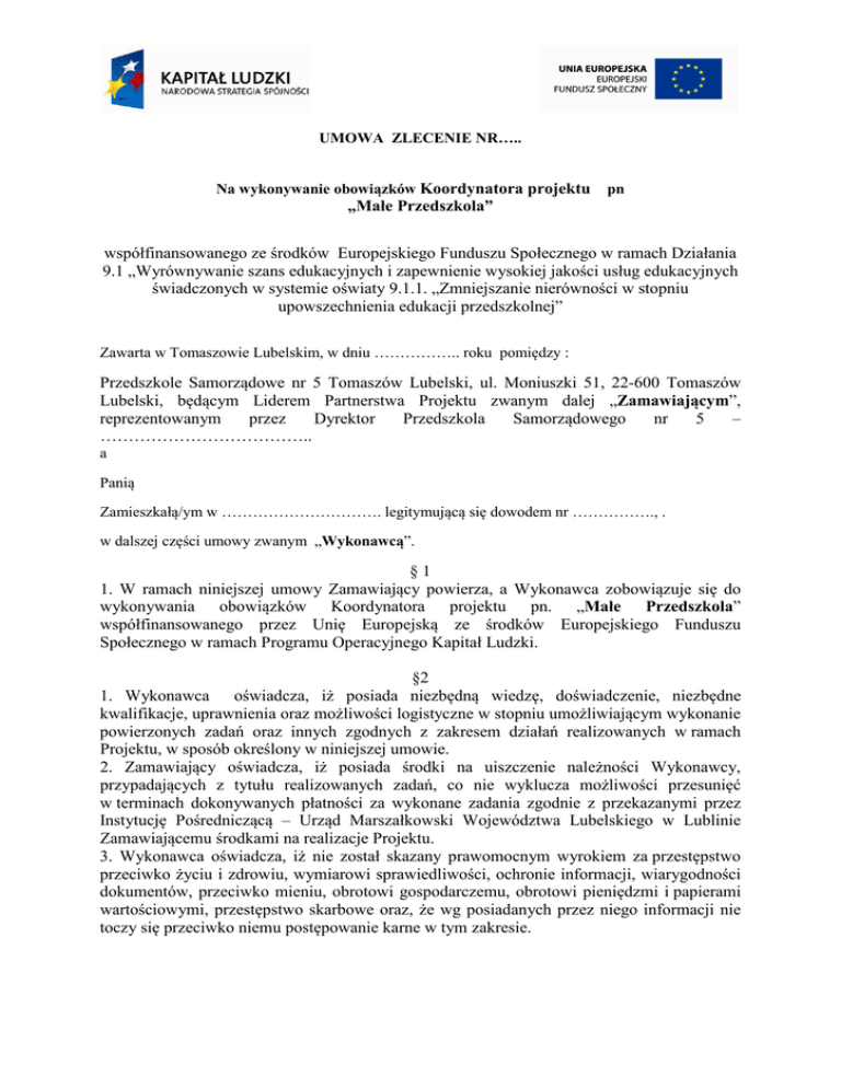 UMOWA ZLECENIE NR….. Na wykonywanie obowiązków Koordynatora projektu pn „Małe Przedszkola” współfinansowanego ze środków Europejskiego Funduszu Społecznego w ramach Działania 9.1 „Wyrównywanie szans edukacyjnych i zapewnienie wysokiej jakości usług edukacyjnych świadczonych w systemie oświaty 9.1.1. „Zmniejszanie nierówności w stopniu upowszechnienia edukacji przedszkolnej” Zawarta w Tomaszowie Lubelskim, w dniu …………….. roku pomiędzy : Przedszkole Samorządowe nr 5 Tomaszów Lubelski, ul. Moniuszki 51, 22-600 Tomaszów Lubelski, będącym Liderem Partnerstwa Projektu zwanym dalej „Zamawiającym”, reprezentowanym przez Dyrektor Przedszkola Samorządowego nr 5 – ……………………………….. a Panią Zamieszkałą/ym w …………………………. legitymującą się dowodem nr ……………., . w dalszej części umowy zwanym „Wykonawcą”. §1 1. W ramach niniejszej umowy Zamawiający powierza, a Wykonawca zobowiązuje się do wykonywania obowiązków Koordynatora projektu pn. „Małe Przedszkola” współfinansowanego przez Unię Europejską ze środków Europejskiego Funduszu Społecznego w ramach Programu Operacyjnego Kapitał Ludzki. §2 1. Wykonawca oświadcza, iż posiada niezbędną wiedzę, doświadczenie, niezbędne kwalifikacje, uprawnienia oraz możliwości logistyczne w stopniu umożliwiającym wykonanie powierzonych zadań oraz innych zgodnych z zakresem działań realizowanych w ramach Projektu, w sposób określony w niniejszej umowie. 2. Zamawiający oświadcza, iż posiada środki na uiszczenie należności Wykonawcy, przypadających z tytułu realizowanych zadań, co nie wyklucza możliwości przesunięć w terminach dokonywanych płatności za wykonane zadania zgodnie z przekazanymi przez Instytucję Pośredniczącą – Urząd Marszałkowski Województwa Lubelskiego w Lublinie Zamawiającemu środkami na realizacje Projektu. 3. Wykonawca oświadcza, iż nie został skazany prawomocnym wyrokiem za przestępstwo przeciwko życiu i zdrowiu, wymiarowi sprawiedliwości, ochronie informacji, wiarygodności dokumentów, przeciwko mieniu, obrotowi gospodarczemu, obrotowi pieniędzmi i papierami wartościowymi, przestępstwo skarbowe oraz, że wg posiadanych przez niego informacji nie toczy się przeciwko niemu postępowanie karne w tym zakresie. Przedmiot umowy i zasady jego wykonywania §3 1. Zadanie będzie realizowane w okresie od dnia podpisania umowy do dnia 30-06-2013 r. 2.W ramach umowy Wykonawca zobowiązuje się wykonać następujące zadania: • Zapoznanie się i przestrzeganie umowy zawartej z IP a Zamawiającym. • Realizacja zadań zgodnie z harmonogramem realizacji załączonym do wniosku. • Koordynator odpowiedzialny jest za prawidłową realizację zadań ujętych w projekcie, wydatkowanie środków zgodnie z budżetem projektu, prawidłowe i terminowe sporządzanie wniosków o płatność do IP stosowanie aktualnie obowiązującą treść wytycznych w zakresie kwalifikowania wydatków w ramach PO KL zamieszczone na stronie Internetowej IP (www.efs.lubelskie.pl). • Prowadzenie współpracy z IP oraz reprezentowanie Zamawiającego w sprawach projektu przed IP • Współpraca z Partnerami projektu. • Zabezpieczenie przed rozpoczęciem realizacji projektu przetwarzania danych osobowych zbiór danych , o których mowa w art.. 36-39 ustawy z dnia 29 sierpnia 1997r. o ochronie danych osobowych oraz w rozporządzeniu Ministra Spraw Wewnętrznych i Administracji z dnia 29 kwietnia 2004r. w sprawie dokumentacji przetwarzania danych osobowych oraz warunków technicznych i organizacji , jakim powinny odpowiadać urządzenia i systemy informatyczne służące do przetwarzania danych osobowych (Dz.U. Nr 100,poz. 1024) • Wszelkie zmiany merytoryczne i finansowe w realizacji zadań projektu powinny być uzgadniane z Instytucją Pośredniczącą . • Udostępnianie w czasie kontroli dokumentacji projektowej IP oraz Komitetowi Sterującemu. W zakresie obowiązków związanych z realizacją Projektu Wykonawca podlega Komitetowi Monitorującemu projektu. 3. Wykonawca odpowiada za prawidłowe wykonanie powierzonych zadań przed Zamawiającym. 4. Wykonawca jest zobowiązany do każdorazowego, wcześniejszego i pisemnego zgłaszania swojej nieobecności Zamawiającemu. §4 1. Zamawiający zobowiązuje się do udostępnienia pomieszczenia, sprzętu biurowego i materiałów niezbędnych Wykonawcy do wykonania przedmiotu umowy. 2. Zamawiający zobowiązuje się do upoważnienia Wykonawcy do administrowania bazą danych osobowych uczestników projektu. 3. Zamawiający zobowiązuje się do terminowej wypłaty wynagrodzenia określonego w § 6, ust.1 i jego składników, z zastrzeżeniem § 2, ust.2. §5 1. Umowę zawarto na czas określony od dnia podpisania do 30.06.2013 r. 2. Wykonawca wykonuje powierzone mu zadania w siedzibie Biura Projektu ……………… lub innych miejscach wyznaczonych przez Zamawiającego. 3. W przypadku przerwania realizacji Projektu z jakichkolwiek przyczyn umowa niniejsza wygasa automatycznie z końcem miesiąca kalendarzowego, w którym nastąpi przerwanie realizacji Projektu. Wynagrodzenie, warunki płatności §6 1. Za czynności określone w § 3 ust. 2 ustala się wynagrodzenie dla Koordynatora projektu w wysokości ………… zł miesięcznie (słownie złotych: ………………………). Wynagrodzenie obejmuje obowiązkowe składki z tytułu ubezpieczeń społecznych leżące po stronie Wykonawcy jak i Zamawiającego oraz zaliczkę podatku dochodowego. 2. Wynagrodzenie Koordynatora projektu jest w całości finansowane w ramach projektu ze środków Europejskiego Funduszu Społecznego oraz budżetu państwa w ramach Programu Operacyjnego Kapitał Ludzki 2007 – 2013. §7 1. Wykonawca zobowiązany jest do przekazania Zamawiającemu informacji niezbędnej do prawidłowego wyliczenia kwoty podatku dochodowego i składek z tytułu obowiązkowych ubezpieczeń społecznych 