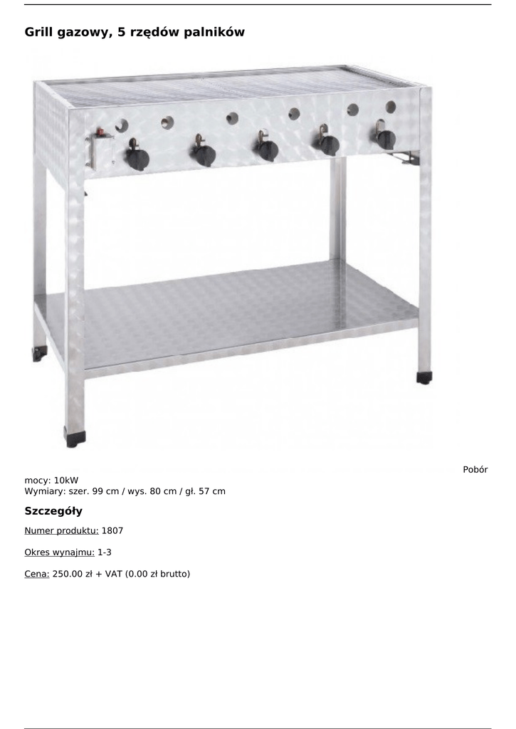 Grill gazowy, 5 rzędów palników Pobór mocy: 10kW Wymiary: szer. 99 cm / wys. 80 cm / gł. 57 cm Szczegóły Numer produktu: 1807 Okres wynajmu: 1-3 Cena: 250.00 zł + VAT (0.00 zł brutto) Powered by TCPDF (www.tcpdf.org)