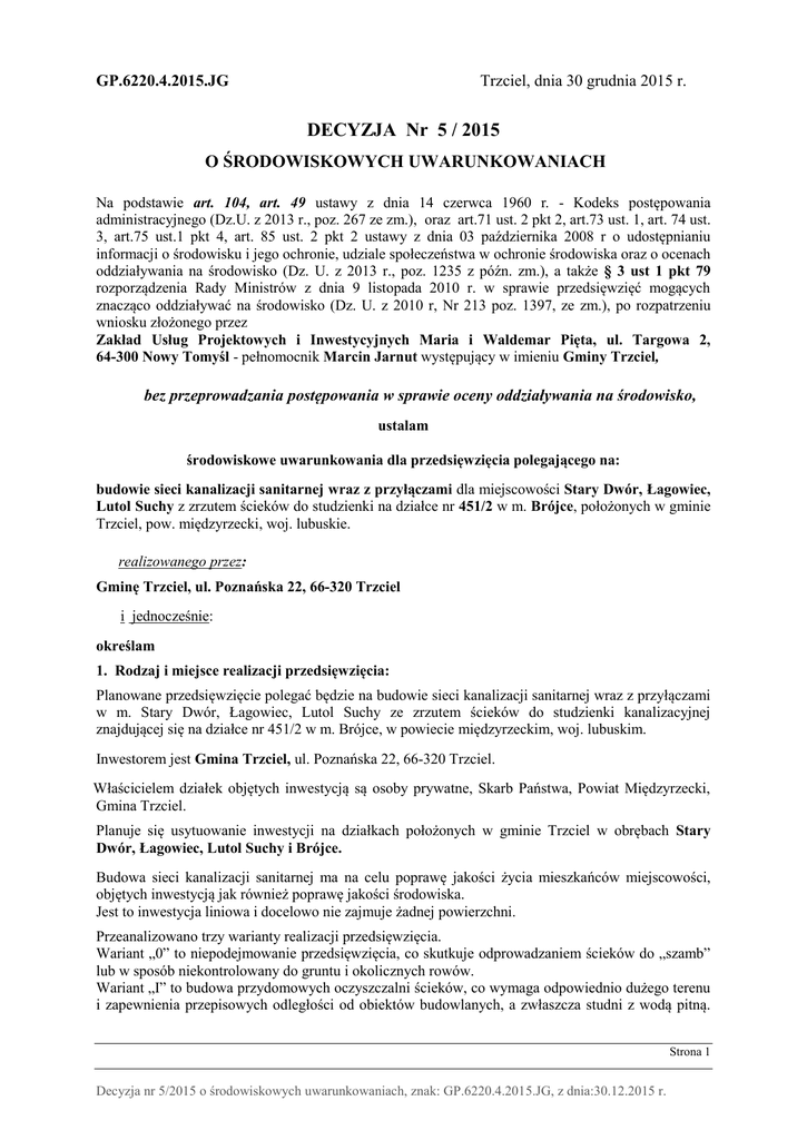 GP.6220.4.2015.JG Trzciel, dnia 30 grudnia 2015 r. DECYZJA Nr 5 / 2015 O ŚRODOWISKOWYCH UWARUNKOWANIACH Na podstawie art. 104, art. 49 ustawy z dnia 14 czerwca 1960 r. - Kodeks postępowania administracyjnego (Dz.U. z 2013 r., poz. 267 ze zm.), oraz art.71 ust. 2 pkt 2, art.73 ust. 1, art. 74 ust. 3, art.75 ust.1 pkt 4, art. 85 ust. 2 pkt 2 ustawy z dnia 03 października 2008 r o udostępnianiu informacji o środowisku i jego ochronie, udziale społeczeństwa w ochronie środowiska oraz o ocenach oddziaływania na środowisko (Dz. U. z 2013 r., poz. 1235 z późn. zm.), a także § 3 ust 1 pkt 79 rozporządzenia Rady Ministrów z dnia 9 listopada 2010 r. w sprawie przedsięwzięć mogących znacząco oddziaływać na środowisko (Dz. U. z 2010 r, Nr 213 poz. 1397, ze zm.), po rozpatrzeniu wniosku złożonego przez Zakład Usług Projektowych i Inwestycyjnych Maria i Waldemar Pięta, ul. Targowa 2, 64-300 Nowy Tomyśl - pełnomocnik Marcin Jarnut występujący w imieniu Gminy Trzciel, bez przeprowadzania postępowania w sprawie oceny oddziaływania na środowisko, ustalam środowiskowe uwarunkowania dla przedsięwzięcia polegającego na: budowie sieci kanalizacji sanitarnej wraz z przyłączami dla miejscowości Stary Dwór, Łagowiec, Lutol Suchy z zrzutem ścieków do studzienki na działce nr 451/2 w m. Brójce, położonych w gminie Trzciel, pow. międzyrzecki, woj. lubuskie. realizowanego przez: Gminę Trzciel, ul. Poznańska 22, 66-320 Trzciel i jednocześnie: określam 1. Rodzaj i miejsce realizacji przedsięwzięcia: Planowane przedsięwzięcie polegać będzie na budowie sieci kanalizacji sanitarnej wraz z przyłączami w m. Stary Dwór, Łagowiec, Lutol Suchy ze zrzutem ścieków do studzienki kanalizacyjnej znajdującej się na działce nr 451/2 w m. Brójce, w powiecie międzyrzeckim, woj. lubuskim. Inwestorem jest Gmina Trzciel, ul. Poznańska 22, 66-320 Trzciel. Właścicielem działek objętych inwestycją są osoby prywatne, Skarb Państwa, Powiat Międzyrzecki, Gmina Trzciel. Planuje się usytuowanie inwestycji na działkach położonych w gminie Trzciel w obrębach Stary Dwór, Łagowiec, Lutol Suchy i Brójce. Budowa sieci kanalizacji sanitarnej ma na celu poprawę jakości życia mieszkańców miejscowości, objętych inwestycją jak również poprawę jakości środowiska. Jest to inwestycja liniowa i docelowo nie zajmuje żadnej powierzchni. Przeanalizowano trzy warianty realizacji przedsięwzięcia. Wariant „0” to niepodejmowanie przedsięwzięcia, co skutkuje odprowadzaniem ścieków do „szamb” lub w sposób niekontrolowany do gruntu i okolicznych rowów. Wariant „I” to budowa przydomowych oczyszczalni ścieków, co wymaga odpowiednio dużego terenu i zapewnienia przepisowych odległości od obiektów budowlanych, a zwłaszcza studni z wodą pitną. Strona 1 Decyzja nr 5/2015 o środowiskowych uwarunkowaniach, znak: GP.6220.4.2015.JG, z dnia:30.12.2015 r. Przydomowe oczyszczalnie ścieków sprawdzają się tam, gdzie istnieje zabudowa rozproszona, a budowa systemu zbiorczego nie jest możliwa. Do realizacji wskazano wariant II – budowa grawitacyjno-tłocznej kanalizacji sanitarnej, ścieki z przedmiotowej kanalizacji będą odprowadzane do oczyszczalni ścieków w Świebodzinie. Wariant ten uznano za najkorzystniejszy z uwagi na warunki ekonomiczne i ekologiczne, do budowy rurociągu przyjęto powszechnie stosowane materiały PVC, PE przyjazne środowisku – nieulegające korozji, odporne na uszkodzenia termiczne i mechaniczne - brak samoistnego przedostawania się ścieków do gleby i wód podziemnych. Zastosowane zostaną rury o średnicach Ø 110, 160 i 200 mm. Na załamaniach trasy sieci oraz na włączeniach przyłączy zaplanowano studnie rewizyjne, które nie ograniczają aktualnego zagospodarowania terenu. Budowa sieci kanalizacyjnej odbędzie się głównie w drogach powiatowych, gminnych, oraz na terenach rolnych i prywatnych działkach budowlanych. Podłączenie budynków do sieci odbywać się będzie we własnym zakresie i własnym staraniem osób prywatnych. Na sieci kanalizacyjnej planowana jest jedna pompownia ścieków. Wokół tłoczni ścieków zostanie wydzielony i ogrodzony teren o pow. ok. 25 m2. Całkowita długość poszczególnych sieci wyniesie: *- kanalizacja grawitacyjna PVC– ok. 11000 m *- kanalizacja ciśnieniowa PE – ok. 2000 m *- budowa jednej tłoczni ścieków typu „suchego” Stan istniejący: Teren pod planowaną inwestycję znajduje się na obszarze oznaczonym w studium uwarunkowań i kierunków zagospodarowania przestrzennego Gminy Trzciel jako tereny zainwestowania o przewadze funkcji mieszkaniowej zabudowa nierozproszona, oraz jako użytki rolne. Inwestycja nie spowoduje zmiany pokrycia terenu szatą roślinną, nie będzie prowadzona wycinka drzew. Zasięg oddziaływania inwestycji zamknie się w granicach dziełek objętych inwestycją i nie będzie oddziaływał niekorzystnie na działki sąsiednie. Teren po realizacji inwestycji zostanie przywrócony do stanu pierwotnego, przedsięwzięcie nie spowoduje zmiany sposobu zagospodarowania terenu poza miejscem lokalizacji przepompowni ścieków. Ilości odprowadzanych substancji do środowiska: rodzaje i przewidywane ilości wprowadzanych do środowiska substancji lub energii przy zastosowaniu rozwiązań chroniących środowisko: *- emisja do powietrza – minimalna emisja do atmosfery w postaci bioareozoli i odorów zagwarantowana zostanie przez zastosowanie kolektorów z tworzyw sztucznych szczelnie połączonych na całym odcinku, zastosowane zostaną studnie rewizyjne jako przelotowe, a nie osadnikowe co wyeliminuje zaleganie ścieków eliminując uwalnianie się aerozoli do powietrza atmosferycznego, zastosowanie szczelnych tłoczni ścieków umieszczonych dodatkowo w studni betonowej spowoduje minimalizację emisji zanieczyszczeń, w fazie budowy sieci kanalizacyjnej wystąpi emisja zanieczyszczeń powietrza w postaci spalin i pyłów wynikająca 