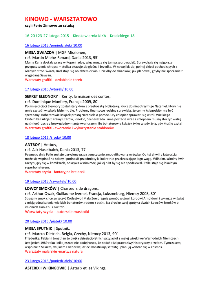 KINOWO - WARSZTATOWO czyli Ferie Zimowe ze sztuką 16-20 i 23-27 lutego 2015 | Kinokawiarnia KIKA | Krasickiego 18 16 lutego 2015 /poniedziałek/ 10:00 MISJA GWIAZDA | MGP Missionen, reż. Martin Miehe-Renard, Dania 2013, 95’ Mama Karla dostała pracę w Kopenhadze, więc muszą się tam przeprowadzić. Sprawdzają się najgorsze przypuszczenia chłopca – stolica okazuje się głośna i brzydka. W nowej klasie, pełnej dzieci pochodzących z różnych stron świata, Karl staje się obiektem drwin. Uciekłby do dziadków, jak planował, gdyby nie spotkanie z wygadaną Sawsan. Warsztaty graffiti - ozdabianie toreb 17 lutego 2015 /wtorek/ 10:00 SEKRET ELEONORY | Kerity, la maison des contes, reż. Dominique Monfery, Francja 2009, 80’ Po śmierci cioci Eleonory został stary dom z przebogatą biblioteką. Klucz do niej otrzymuje Nataniel, który nie umie czytać i w szkole idzie mu źle. Problemy finansowe rodziny sprawiają, że cenny księgozbiór ma być sprzedany. Bohaterowie książek proszą Nataniela o pomoc. Czy chłopiec sprawdzi się w roli Wielkiego Czytelnika? Alicja z Krainy Czarów, Pinokio, Szeherezada i inne postacie wraz z chłopcem muszą stoczyć walkę na śmierć i życie z bezwzględnym antykwariuszem. Bo bohaterowie książek tylko wtedy żyją, gdy ktoś je czyta! Warsztaty graffiti - tworzenie i wykorzystanie szablonów 18 lutego 2015 /środa/ 10:00 ANTBOY | Antboy, reż. Ask Haselbalch, Dania 2013, 77’ Pewnego dnia Pelle zostaje ugryziony przez genetycznie zmodyfikowaną mrówkę. Od tej chwili z łatwością może się wspinać na ściany i podnosić przedmioty kilkukrotnie przekraczające jego wagę. Wilhelm, szkolny świr zaczytujący się w komiksach, odkrywa w nim moc, jakiej nikt by się nie spodziewał. Pelle staje się lokalnym superbohaterem. Warsztaty szycia - fantazyjne breloczki 19 lutego 2015 /czwartek/ 10:00 ŁOWCY SMOKÓW | Chasseurs de dragons, reż. Arthur Qwak, Guillaume Ivernel, Francja, Luksmeburg, Niemcy 2008, 80’ Straszny smok chce zniszczyć Królestwo! Mała Zoe pragnie pomóc wujowi Lordowi Arnoldowi i wyrusza w świat z misją odnalezienia wielkich bohaterów, rodem z baśni. Na drodze swej spotyka dwóch Łowców Smoków o imionach Lian-Chu i Gwizdo… Warsztaty szycia - autorskie maskotki 20 lutego 2015 /piątek/ 10:00 MISJA SPUTNIK | Sputnik, reż. Marcus Dietrich, Belgia, Czechy, Niemcy 2013, 90’ Friederike, Fabian i Jonathan to trójka dziesięcioletnich przyjaciół z małej wioski we Wschodnich Niemczech. Jest jesień 1989 roku i nikt jeszcze nie podejrzewa, że nadchodzi prawdziwy historyczny przełom. Tymczasem, wspólnie z Mikiem, wujkiem Friederike, dzieci konstruują satelitę i planują wybrać się w kosmos. Warsztaty malarskie -martwa natura 23 lutego 2015 /poniedziałek/ 10:00 ASTERIX I WIKINGOWIE | Asterix et les Vikings, reż. Stefan Fjeldmark, Dania, Francja 2006, 78’ Grupa nieustraszonych Wikingów udaje się na podbój wioski Galów. W tym samym czasie Asterix z Obelixem, w pocie czoła kształtują charakter Trendixa, syna wodza Galów. Stoją przed nie lada zadaniem: jak z maminsynka zrobić prawdziwego mężczyznę? Warsztaty fotograficzne - portrety 24 lutego 2015 /wtorek/ 10:00 GDZIE JEST MIKOŁAJ | Midden in De Winternacht, reż. Lourens Blok, Holandia 2013, 81’ Wyobraźcie sobie gigantycznego łosia, który spada z nieba i zostawiając potężną dziurę w dachu, ląduje prosto w waszym garażu. Zwierzak nie tylko doskonale opanował umiejętność latania, ale też... mówienia! Wygląda na to, że Pan Łoś odbywał właśnie kurs podniebnego prawa jazdy ze Świętym Mikołajem. Niestety sanie, do których był zaprzęgnięty, wymknęły im się spod kontroli... Max cieszy się z wizyty niezapowiedzianego gościa, mimo że przestał wierzyć w istnienie Świętego Mikołaja już dobrych parę lat temu. Ale kiedy rodzice się rozwodzą, nowy przyjaciel jest zawsze mile widziany. W Panu Łosiu bohater znajduje powiernika tajemnic, kumpla, z którym może oglądać filmy, kompana w starciu z rozbójnikami z sąsiedztwa, a także - co najważniejsze - kogoś, kto rozumie, co znaczy tęsknić za ojcem. Warsztaty fotograficzne - sesja zdjęciowa 25 lutego 2015 /środa/ 10:00 KRÓLOWA ŚNIEGU | Snezhnaya koroleva, reż. Vladlen Barbe, Maksim Sveshnikov, Rosja 2012, 80’ Królowa Śniegu, planująca zamrożenie serc wszystkich ludzi na świecie, porywa Kaia, syna słynnego mistrza wyrobów ze szkła. Siostra chłopca, Gerda, rusza mu na pomoc. Warsztaty plastyczne - decoupage 26 lutego 2015 / czwartek/ 10:00 SIOSTRY WAMPIRKI |Die Vampirschwestern, reż. Wolfgang Groos, Niemcy 2012, 97’ Pewnego pięknego letniego dnia do domu na spokojnych przedmieściach Bindburga wprowadzają się nowi sąsiedzi - państwo Tepes z 12-letnimi bliźniaczkami: Silvanią i Dakarią. Matka wygląda całkiem normalnie, ale pozostała trójka jest blada i dziwacznie ubrana. Tepesowie od razu wzbudzają podejrzenia mieszkającego obok Dirka von Kombasta. Nie bez powodu - wkrótce okazuje się, że ojciec i dziewczynki to wampiry - i tylko matka, Elvira, jest człowiekiem. Przez dwanaście lat cała rodzina mieszkała w Transylwanii, ale teraz, za namową matki, postanowiła osiedlić się w Niemczech… Warsztaty plastyczne - papier mache 27 lutego 2015 / piątek/ 10:00 PINOKIO | Pinocchio, reż. Enzo D'Alo, Włochy/Belgia/Francja/Luksemburg 2012, 75' Ubogi stolarz Dżeppetto czuje się samotny i tęskni za towarzystwem. Pewnego dnia, znajduje niezwykły kawałek drewna i postanawia wyrzeźbić drewnianą lalkę. Kiedy lalka jest gotowa, Dżeppetto nadaje mu imię: Pinokio. I wtedy, jak za dotknięciem czarodziejskiej różdżki, kukiełka ożywa. Warsztaty malarskie - portret Karnet tygodniowy (5 zajęć): 100 zł Karnet 2 dniowy ( 2 zajęcia): 50 zł Pojedyncze zajęcia: 30zł Czas trwania: 10:00- 14:00 w cenie biletu i karnetu zajęcia plastyczne , pokaz filmowy i poczęstunek. Zajęcia prowadzi: Joanna Basicz - studentk