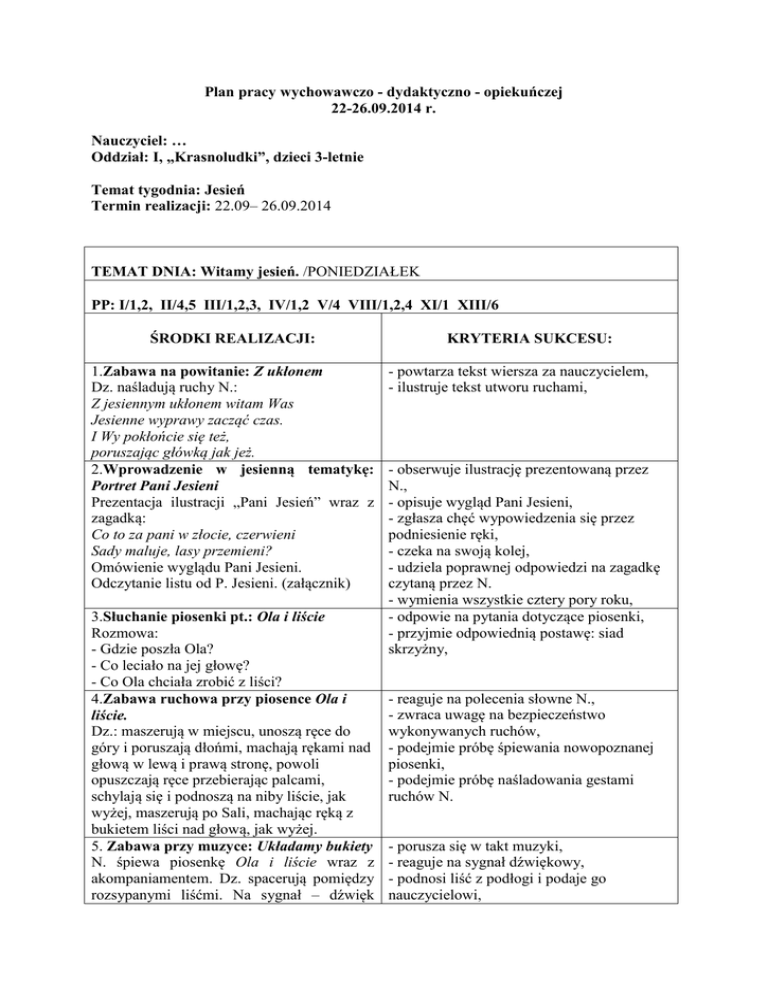 Plan pracy wychowawczo - dydaktyczno - opiekuńczej 22-26.09.2014 r. Nauczyciel: … Oddział: I, „Krasnoludki”, dzieci 3-letnie Temat tygodnia: Jesień Termin realizacji: 22.09– 26.09.2014 TEMAT DNIA: Witamy jesień. /PONIEDZIAŁEK PP: I/1,2, II/4,5 III/1,2,3, IV/1,2 V/4 VIII/1,2,4 XI/1 XIII/6 ŚRODKI REALIZACJI: 1.Zabawa na powitanie: Z ukłonem Dz. naśladują ruchy N.: Z jesiennym ukłonem witam Was Jesienne wyprawy zacząć czas. I Wy pokłońcie się też, poruszając główką jak jeż. 2.Wprowadzenie w jesienną tematykę: Portret Pani Jesieni Prezentacja ilustracji „Pani Jesień” wraz z zagadką: Co to za pani w złocie, czerwieni Sady maluje, lasy przemieni? Omówienie wyglądu Pani Jesieni. Odczytanie listu od P. Jesieni. (załącznik) 3.Słuchanie piosenki pt.: Ola i liście Rozmowa: - Gdzie poszła Ola? - Co leciało na jej głowę? - Co Ola chciała zrobić z liści? 4.Zabawa ruchowa przy piosence Ola i liście. Dz.: maszerują w miejscu, unoszą ręce do góry i poruszają dłońmi, machają rękami nad głową w lewą i prawą stronę, powoli opuszczają ręce przebierając palcami, schylają się i podnoszą na niby liście, jak wyżej, maszerują po Sali, machając ręką z bukietem liści nad głową, jak wyżej. 5. Zabawa przy muzyce: Układamy bukiety N. śpiewa piosenkę Ola i liście wraz z akompaniamentem. Dz. spacerują pomiędzy rozsypanymi liśćmi. Na sygnał – dźwięk KRYTERIA SUKCESU: - powtarza tekst wiersza za nauczycielem, - ilustruje tekst utworu ruchami, - obserwuje ilustrację prezentowaną przez N., - opisuje wygląd Pani Jesieni, - zgłasza chęć wypowiedzenia się przez podniesienie ręki, - czeka na swoją kolej, - udziela poprawnej odpowiedzi na zagadkę czytaną przez N. - wymienia wszystkie cztery pory roku, - odpowie na pytania dotyczące piosenki, - przyjmie odpowiednią postawę: siad skrzyżny, - reaguje na polecenia słowne N., - zwraca uwagę na bezpieczeństwo wykonywanych ruchów, - podejmie próbę śpiewania nowopoznanej piosenki, - podejmie próbę naśladowania gestami ruchów N. - porusza się w takt muzyki, - reaguje na sygnał dźwiękowy, - podnosi liść z podłogi i podaje go nauczycielowi, tamburyna, zatrzymują się i podnoszą z podłogi liść obok którego stoją i podają go N. który z pomocą dzieci wkłada duże liście do dużego wazonu, a małe do małego. 6. Zabawa matematyczna: Rytmiczny szal Pani Jesieni. Dzieci układają z zebranych w poprzedniej zabawie liści szal Pani jesieni zgodnie z zasadą: gdy N. klaśnie: dz, które ma duży liść przykleja go na pasku na podłodze, gdy N. tupnie, dz. które ma mały liść przykleja go zaraz obok dużego. Zabawa trwa do momentu, aż wszystkie dzieci ułożą trzymane w rękach liście. 7.Jesienne obrazy – spacer z obserwacją jesiennej pogody, dzielenie się spostrzeżeniami. Poszukiwanie jesiennych darów do kącika przyrody znajdującego się w sali. - pomaga przyporządkować liść do właściwego wazonu stosując zasadę: „mały do małego, duży do dużego”, - cierpliwie czeka na swoją kolej, - prawidłowo reaguje na sygnał, - rozróżnia liść według kryterium: „mały – duży”, - układa liść stosując się do podanego wzoru, - podejmuje próbę samodzielnego ubrania się i rozbierania podczas wyjścia, - opisuje pogodę oraz zjawiska atmosferyczne, - zbiera jesienne dary, nazywając je, - dekoruje kącik przyrody z pomocą N., - spaceruje zachowując przyjęte zasady (trzyma węża, nie oddala się od grupy), TEMAT DNIA: Święto Przedszkolaka. /WTOREK PP: I/ 1,2,3 II/4 III/3,4 V/4 VI/1 VII/1,2 VIII/1,2 IX/1 ŚRODKI REALIZACJI: KRYTERIA SUKCESU: 1. Krótka rozmowa kierowana nt Dnia Przedszkolaka. - udziela odpowiedzi na pytania: Kto to jest Przedszkolak? Jakie obchodzimy dziś Święto w Naszym Przedszkolu? - przestrzega zasad panujących w grupie, 2.Wspólne obchody Dnia Przedszkolaka w sali gimnastycznej. - stoi wraz z grupą i N. podczas uroczystości, - nie oddala się od grupy, - recytuje rymowankę o swojej grupie – Krasnoludki, - śpiewa piosenkę o swojej grupie, - bierze udział w zabawach integracyjnych wraz z dziećmi z pozostałych grup, - przestrzega zasad bezpieczeństwa poznanych na przestrzeni wcześniejszych tygodni, 3.Spacer osiedlowymi alejkami - bierze udział w przejściu alejkami osiedla, - śpiewa poznany hymn Dnia Przedszkolaka, - niesie transparent swojej grupy przestrzegając zasad bezpieczeństwa, - niesie balonik przestrzegając zasad bezpieczeństwa, 4.Zabawa tropiąca w ogrodzie 5.Powrót do Przedszkola - znajduje literki ukryte w grodzie przedszkolnym, - tworzy hasło – nazwę swojej grupy, - podejmuje próbę współdziałania w grupie, - z pomocą N. układa napis, - ponownie odśpiewuje hymn Dnia Przedszkolaka - ustawia się w parze z kolegą trzymając grupowego węża, - reaguje na polecania słowne N., - spaceruje przestrzegając zasad bezpieczeństwa, - podejmuje próbę samodzielnego rozebrania się, - odkłada swoje buty i kurteczkę na miejsce zgodnie ze swoim znaczkiem, TEMAT DNIA: Kolory Jesieni/ ŚRODA PP: I/ 1,3 II/4 III/1,3 V/4 VIII/2 IX/2 XI/1 XIV/5 ŚRODKI REALIZACJI: 1. Zabawa badawcza: Oglądanie naturalnych okazów liści. Dz. oglądają w kąciku przyrody naturalne okazy liści, wypowiadają się na temat ich wielkości, koloru i kształtu. N. zwraca uwagę na poprawność wypowiedzi dzieci. 2. Taniec jesiennych liści – taniec przy muzyce z wykorzystaniem chusty animacyjnej (Klanza) 3. Słuchanie wiersza M. Golc pt.: Namaluję jesień, ilustrowanego sylwetami. Wymienianie przez dz. nazw kolorów, o których jest mowa w wierszu oraz wskazywanie pasujących do nich jesiennych okazów – z wykorzystaniem białych sylwet: jabłka, kasztana, liścia. 4. Zagadki: Jesienne skarby. Dz. otrzymują kartoniki z wybranymi KRYTERIA SUKCESU: - opisuje wygląd liści ze szczególnym zwróceniem uwagi na ich kolor, kształt i wielkość, - nie przepycha się, - czeka na swoją kolej. -