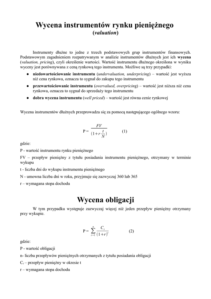 Wycena instrumentów rynku pieniężnego Wycena obligacji