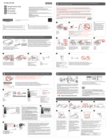 PL CS HU SK 2 Rozpocznij tutaj Začínáme Itt kezdje Prvé kroky Maschinenlärminformations-Verordnung 3. GPSGV: Der höchste Schalldruckpegel beträgt 70 dB(A) oder weniger gemäss EN ISO 7779. Das Gerät ist nicht für die Benutzung im unmittelbaren Gesichtsfeld am Bildschirmarbeitsplatz vorgesehen. Um störende Reflexionen am Bildschirmarbeitsplatz zu vermeiden, darf dieses Produkt nicht im unmittelbaren Gesichtsfeld platziert werden. EEE Yönetmeliğine Uygundur. Обладнання відповідає вимогам Технічного регламенту обмеження використання деяких небезпечних речовин в електричному та електронному обладнанні. Информация об изготовителе Seiko Epson Corporation (Япония) Юридический адрес: 4-1, Ниси-Синздюку, 2-Чоме, Синздюку-ку, Токио, Япония Срок службы: 3 года Instalacja pojemników z tuszem / Instalace inkoustových kazet / A tintapatronok behelyezése / Vloženie atramentových kaziet Q Podczas początkowej konfiguracji należy używać pojemników z tuszem dostarczonych z drukarką. Niniejszych pojemników nie wolno zostawiać do późniejszego użytku. Tusz z pierwszych pojemników zostanie częściowo wykorzystany do napełnienia głowicy drukującej drukarki. Takie pojemniki mogą umożliwić wydrukowanie mniejszej liczby stron niż kolejne pojemniki. Pro první instalaci použijte inkoustové kazety dodané s touto tiskárnou. Tyto kazety nelze uchovávat pro pozdější použití. Výchozí inkoustové kazety se částečně spotřebují k doplnění inkoustu do tiskové hlavy. S těmito kazetami vytisknete pravděpodobně méně stránek, než s dalšími inkoustovými kazetami. A kezdeti beállítás során mindenképpen a nyomtatóhoz mellékelt tintapatronokat használja. Ezeket a patronokat nem szabad eltenni későbbi felhasználás céljából. A kezdeti tintapatronok részben a nyomtatófej feltöltésére lesznek elhasználva. Ezek a patronok a későbbiekben behelyezett patronokhoz képest kevesebb lap nyomtatására lehetnek képesek. Pri prvom nastavení použite v tlačiarni atramentové kazety, ktoré s ňou boli dodané. Tieto kazety nemožno odložiť a použiť neskôr. Časť atramentu z atramentových kaziet na prvé nastavenie sa použije na naplnenie tlačovej hlavy. Pomocou týchto kaziet môžete vytlačiť v porovnaní s nasledujúcimi atramentovými kazetami menej strán. © 2012 Seiko Epson Corporation. All rights reserved. Printed in XXXXXX A� ! c Przestroga; należy stosować się do przestróg, aby uniknąć uszkodzeń ciała. Upozornění; je nutno pečlivě dodržovat, aby nedošlo ke zranění. Figyelmeztetés: a testi sérülések elkerülése érdekében gondosan be kell tartani. Upozornenie: musíte úplne dodržovať, aby ste predišli telesným zraneniam. Ważne; należy przestrzegać zaleceń, aby uniknąć uszkodzeń sprzętu. Důležité; je nutno respektovat, aby nedošlo k poškození zařízení. Fontos: a készülék megrongálódásának elkerülése érdekében kell betartani. Dôležité: musíte dodržovať, aby ste predišli poškodeniu zariadenia. B� Uważaj, aby nie złamać zaczepów z boku pojemnika z tuszem. Buďte opatrní, abyste nezlomili háčky na straně inkoustové kazety. Figyeljen arra, nehogy letörje a tintapatron oldalán a kampókat. Dbajte na to, aby ste nezlomili postranné háčiky atramentovej kazety. Otwórz. Otevřete. Nyissa fel. Otvorte. 1 Rozpakowywanie i włączanie urządzenia / Vybalení a zapnutí / Kicsomagolás és bekapcsolás / Vybalenie a zapnutie Opakowanie, w którym znajduje się pojemnik z tuszem, można otworzyć dopiero przed umieszczeniem go w drukarce. Pojemnik z tuszem jest zapakowany próżniowo dla zapewnienia jego niezawodności. Obal inkoustové kazety neotvírejte, dokud nebudete připraveni ji nainstalovat do tiskárny. Pro zajištění spolehlivosti je kazeta vakuově balená. A tintapatron csomagolását csak a nyomtatóba való behelyezésekor nyissa fel. A patron vákuum-csomagolású, megbízhatóságának megőrzése érdekében. Neotvárajte balenie atramentovej kazety, kým nie ste pripravení vložiť ju do tlačiarne. Kazeta je vákuovo balená, aby sa zachovala jej spoľahlivosť. Zawartość może się różnić w zależności od kraju. Obsah balení se může lišit podle oblasti. Az országtól függően a csomag tartalma eltérő lehet. Obsah sa môže líšiť podľa lokality. A� B� Usuń wszystkie materiały ochronne. Odstraňte veškerý ochranný materiál. Távolítson el minden védőanyagot. Odstráňte všetky ochranné materiály. 3 Podłącz drukarkę do gniazda sieciowego. Připojte do zásuvky. Csatlakoztassa a tápkábelt. Pripojte a zapojte do zástrčky. C� Włącz. Zapněte. Kapcsolja be a készüléket. Zapnite. Podłączanie do komputera / Připojování k počítači / Csatlakozás a számítógéphez / Pripojenie k počítaču c Potrząsnąć wyłącznie kasetą z CZARNYM tuszem. Nie potrząsać kasetami z innymi kolorami. Protřepte pouze ČERNOU novou kazetu. Ostatní barevné kazety neprotřepávejte. Csak a FEKETE színű új patronokat rázza fel. A többi színes tintapatront ne rázza fel. Zatraste len novú ČIERNU kazetu. Netraste ostatné farebné kazety. C� D� Zdejmij tylko żółtą taśmę. Odstraňte pouze žlutou pásku. Csak a sárga szalagot távolítsa el. Odstráňte len žltú pásku. F� Dociśnij, aż się zatrzaśnie. Zatlačte dokud nezaklapne. Nyomja le kattanásig. Zatlačte, kým nezacvakne. Zamknij. Zavřete. Zárja be. Zatvorte. G� Naciśnij przycisk. Ładowanie tuszu zostało rozpoczęte. Stiskněte. Bude zahájeno doplňování inkoustu. Nyomja meg. A tinta töltése elkezdődik. Stlačte. Spustí sa dopĺňanie atramentu. % Zainstaluj pojemniki z tuszem. Nainstalujte inkoustov