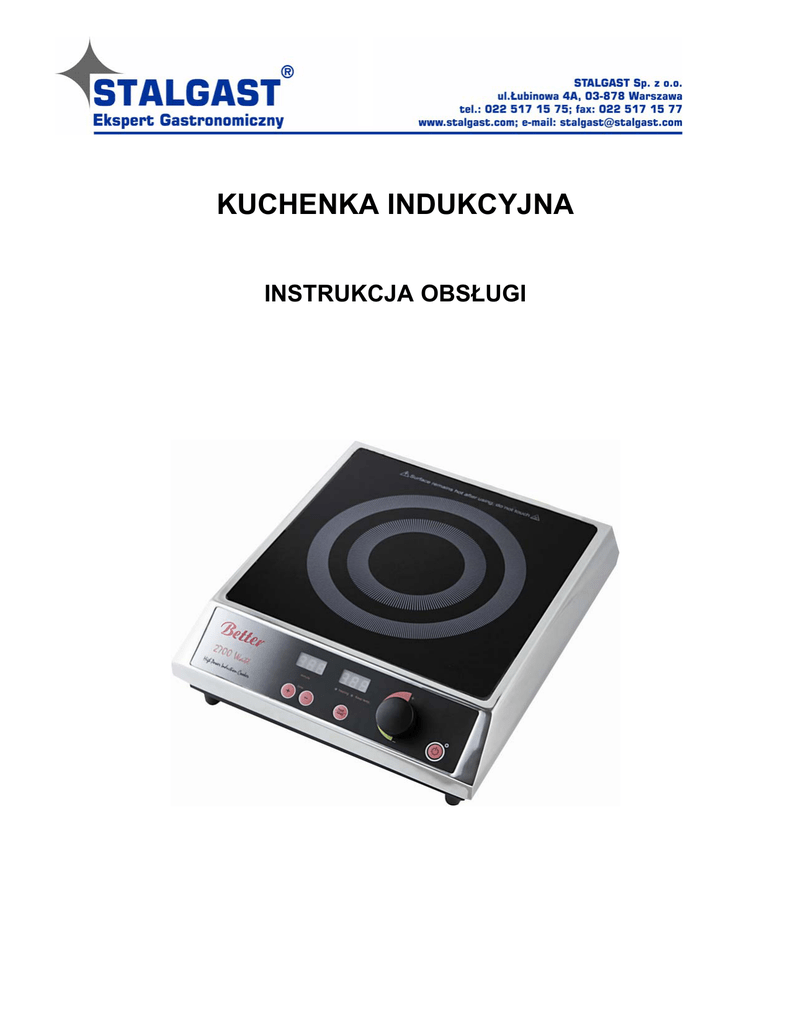 KUCHENKA INDUKCYJNA INSTRUKCJA OBSŁUGI Informacje ogólne Uwaga! Przed pierwszym użyciem urządzenia należy przeczytać instrukcję obsługi. 1. 2. 3. 4. 5. 6. 7. 8. 9. 10. 11. 12. 13. 14. 15. 16. 17. 18. W celu uniknięcia porażenia prądem elektrycznym, podczas podłączania urządzenia do sieci elektrycznej ręce użytkownika powinny być suche. Nie podłączać urządzenia do źródła prądu gdzie podłączone są inne urządzenia. Urządzenie należy podłączyć do osobnego źródła prądu. Nie używać urządzenia, jeżeli przewód elektryczny, wtyczka lub gniazdo elektryczne jest uszkodzone. Wszelkie naprawy urządzania należy przeprowadzać w autoryzowanym serwisie. Nie używać urządzenia w wilgotnym miejscu lub w pobliżu źródła ognia. Nie używać urządzenia w miejscu łatwo dostępnym dla dzieci. Urządzenia należy umieścić na stabilnym miejscu, zapobiegającym przewróceniu się kuchenki. Nie przesuwać urządzenie podczas pracy. W celu zapobiegnięcia przypalenia się nie podgrzewać pustych garnków, patelni, itp. Nie umieszczać metalowych narzędzi (noże, łyżki, widelce, itp.) na płycie grzejnej urządzenia. Nie ustawiać kuchenki w bezpośrednim kontakcie z innymi urządzeniami, przedmiotami. Nie umieszczać urządzenia na dywanie, obrusie lub innych materiałach nie odpornych na wysoką temperaturę. Nie umieszczać papieru lub folii pomiędzy naczyniem a płytą grzejną. Jeżeli płyta grzejna zostanie uszkodzona należy natychmiast wyłączyć urządzenie i skontaktować się z autoryzowanym serwisem. Nie blokować otworów wentylacyjnych urządzenia. Nie dotykać płyty grzejnej urządzenia bezpośrednio po zakończeniu pracy. Płyta urządzenia będzie gorąca! Nie umieszczać urządzenia w sąsiedztwie telewizora, radia, kart kredytowych, kaset magnetofonowych. Fale magnetyczne wytwarzane przez kuchenkę indukcyjną mogą mieć negatywny wpływ na wymienione przedmioty. W przypadku uszkodzenia kabla zasilającego należy skontaktować się z autoryzowanym serwisem. 19. Symbol oznacza powierzchnie osiągające wysoką temperaturę podczas pracy urządzenia. Instrukcja obsługi 1. Umieścić odpowiednie naczynie na płycie grzejnej kuchenki indukcyjnej. Podłączyć urządzenie do sieci elektrycznej. Kontrolka informująca, że urządzenie jest w stanie gotowości zapali się. 2. Po wciśnięciu przycisku kontrolka podgrzewania zapali się. Urządzenie rozpocznie podgrzewanie płyty grzejnej. Domyślnie regulacja mocy ustawiona jest na 6. Przy pomocy pokrętła regulacji moc urządzenia można ustawić w zakresie 1 – 15. Po wciśnięciu przycisku „Heat/Keep” kontrolka „Keep temp.” zapali się. Urządzenie przejdzie w stan podtrzymywania ustawionej temperatury. Domyślnie temperatura ustawiona jest na 220°C. Przy pomocy pokrętła regulacji temperaturę można ustawić w zakresie od 60°C do 220°C. Przy pomocy przycisków „+” oraz „-” ustawić czas w zakresie od 0 do 120 minut. 3. 4. podczas pracy urządzenia spowoduje natychmiastowe przerwanie pracy 5. Wciśnięcie przycisku kuchenki indukcyjnej. 6. Po wciśnięciu przycisku urządzenie automatycznie wyłączy zasilanie, jeżeli w ciągu 2 godzin nie będzie przeprowadzona żadna czynność. 2 Naczynia Następujące naczynia mogą być używane na kuchence indukcyjnej: 1. naczynia wykonane ze: • stali • żeliwa • emaliowanego żelaza • stali nierdzewnej Naczynia powinny posiadać płaskie dno o wymiarach od 12 do 26 cm. Następujące naczynia nie mogą być używane na kuchence indukcyjnej: 1. naczynia wykonane z: • żaroodpornego szkła • miedzi • aluminium 2. naczynia ceramiczne 3. naczynia o zaokrąglonym dnie 4. naczynia o wymiarach dna mniejszych niż 12 cm. Czyszczenie urządzenia 1. 2. 3. 4. 5. Odłączyć zasilanie elektryczne i poczekać do ostygnięcia płyty grzejnej. Urządzenie należy czyścić po każdorazowym użyciu. Nie używać benzyny, rozpuszczalnika, produktów zawierających środki ścierne do czyszczenia kuchenki indukcyjnej. Urządzenie można czyścić za pomocą płynu do mycia naczyń oraz wilgotnej szmatki. W celu usunięcia kurzu i zanieczyszczeń z otworów wentylacyjnych można użyć odkurzacza lub sprężonego powietrza. Nie zanurzać urządzenia w wodzie! Dane techniczne Model: Moc: Napięcie: Zakres temperatur: BT-270A 800 W – 2700 W ~ 230 V/ 50 Hz 60°C – 220°C 3 Deklaracja zgodności wg ISO/Guide 22 PN EN 45014:200 Nr 036/2005 Dostawca : STALGAST Sp. z o.o. Adres: ul. Łubinowa 4a 03-878 Warszawa Wyrób: Kuchnia indukcyjna Typ: U36239001 Opisany powyżej produkt zgodny jest z : 1. 2. 3. 4. 5. 6. Dyrektywa Rady 73/25/CEE z 1973 r. Wraz ze zmianami w dyrektywie Rady 93/68/CEE z 1993 r. o harmonizacji praw państw członkowskich dotyczących sprzętu elektrycznego przeznaczonego do stosowania w określonych granicach napięcia (dyrektywa niskiego napięcia). Dyrektywa Rady EWG 89/336/EEC z 1989 r. wraz ze zmianami zawartymi w Dyrektywie Rady 91/263/EEC z 1991 r. Dyrektywie Rady 92/31/EEC z 1992 r. Dyrektywie Rady 93/68/CEE z 1993 r. o zbliżeniu praw państw członkowskich dotyczących kompatybilności elektromagnetycznej. Norma PN EN 55014-1:2001 „Kompatybilność Elektromagnetyczna (EMC). Wymagania dotyczące przyrządów powszechnego użytku, narzędzi elektrycznych i podobnych urządzeń. Emisja zaburzeń elektromagnetycznych. Norma Wyrobów.” Norma PN EN 55014-2:1999 „Kompatybilność Elektromagnetyczna (EMC). Wymagania dotyczące przyrządów powszechnego użytku, narzędzi elektrycznych i podobnych urządzeń. Odporność na zaburzenia elektromagnetyczne. Norma grupy wyrobów”. Norma PN EN 61000-3-2:1997+A1:1999+A2:1999+A12:1999 „Kompatybilność Elektromagnetyczna (EMC). Dopuszczalne poziomy. Dopuszczalne poziomy emisji harmonicznych prądów (fazowy prąd zasilający odbiornik lub = 16A)”. Norma PN EN 61000-3-3:1997 „Kompatybilność Elektromagnetyczna (EMC). Dopuszczalne poziomy. Ograniczenia waha