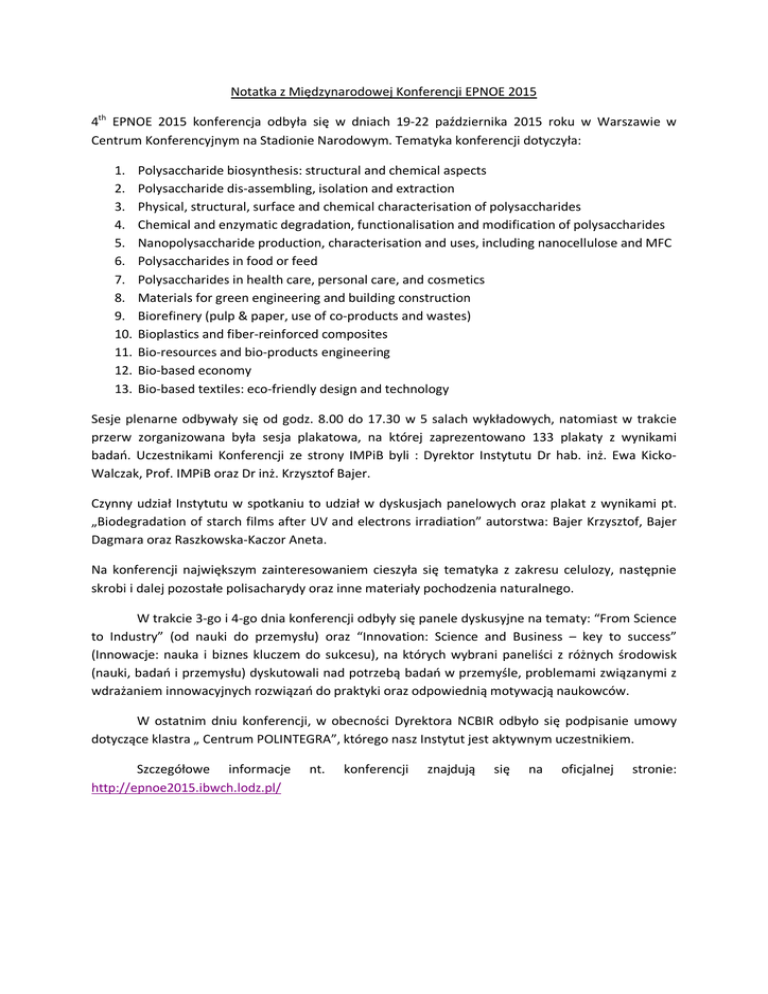 Notatka z Międzynarodowej Konferencji EPNOE 2015 4th EPNOE 2015 konferencja odbyła się w dniach 19-22 października 2015 roku w Warszawie w Centrum Konferencyjnym na Stadionie Narodowym. Tematyka konferencji dotyczyła: 1. 2. 3. 4. 5. 6. 7. 8. 9. 10. 11. 12. 13. Polysaccharide biosynthesis: structural and chemical aspects Polysaccharide dis-assembling, isolation and extraction Physical, structural, surface and chemical characterisation of polysaccharides Chemical and enzymatic degradation, functionalisation and modification of polysaccharides Nanopolysaccharide production, characterisation and uses, including nanocellulose and MFC Polysaccharides in food or feed Polysaccharides in health care, personal care, and cosmetics Materials for green engineering and building construction Biorefinery (pulp & paper, use of co-products and wastes) Bioplastics and fiber-reinforced composites Bio-resources and bio-products engineering Bio-based economy Bio-based textiles: eco-friendly design and technology Sesje plenarne odbywały się od godz. 8.00 do 17.30 w 5 salach wykładowych, natomiast w trakcie przerw zorganizowana była sesja plakatowa, na której zaprezentowano 133 plakaty z wynikami badań. Uczestnikami Konferencji ze strony IMPiB byli : Dyrektor Instytutu Dr hab. inż. Ewa KickoWalczak, Prof. IMPiB oraz Dr inż. Krzysztof Bajer. Czynny udział Instytutu w spotkaniu to udział w dyskusjach panelowych oraz plakat z wynikami pt. „Biodegradation of starch films after UV and electrons irradiation” autorstwa: Bajer Krzysztof, Bajer Dagmara oraz Raszkowska-Kaczor Aneta. Na konferencji największym zainteresowaniem cieszyła się tematyka z zakresu celulozy, następnie skrobi i dalej pozostałe polisacharydy oraz inne materiały pochodzenia naturalnego. W trakcie 3-go i 4-go dnia konferencji odbyły się panele dyskusyjne na tematy: “From Science to Industry” (od nauki do przemysłu) oraz “Innovation: Science and Business – key to success” (Innowacje: nauka i biznes kluczem do sukcesu), na których wybrani paneliści z różnych środowisk (nauki, badań i przemysłu) dyskutowali nad potrzebą badań w przemyśle, problemami związanymi z wdrażaniem innowacyjnych rozwiązań do praktyki oraz odpowiednią motywacją naukowców. W ostatnim dniu konferencji, w obecności Dyrektora NCBIR odbyło się podpisanie umowy dotyczące klastra „ Centrum POLINTEGRA”, którego nasz Instytut jest aktywnym uczestnikiem. Szczegółowe informacje http://epnoe2015.ibwch.lodz.pl/ nt. konferencji znajdują się na oficjalnej stronie: