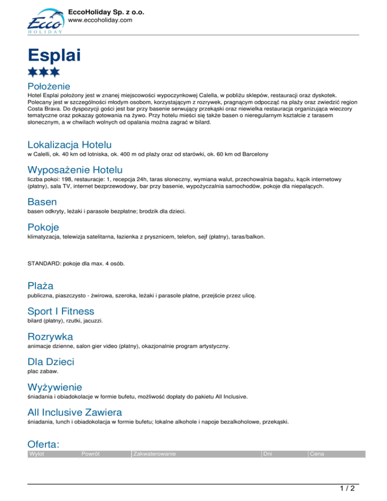 Hotel Esplai położony jest w znanej miejscowości wypoczynkowej Calella, w pobliżu sklepów, restauracji oraz dyskotek.
