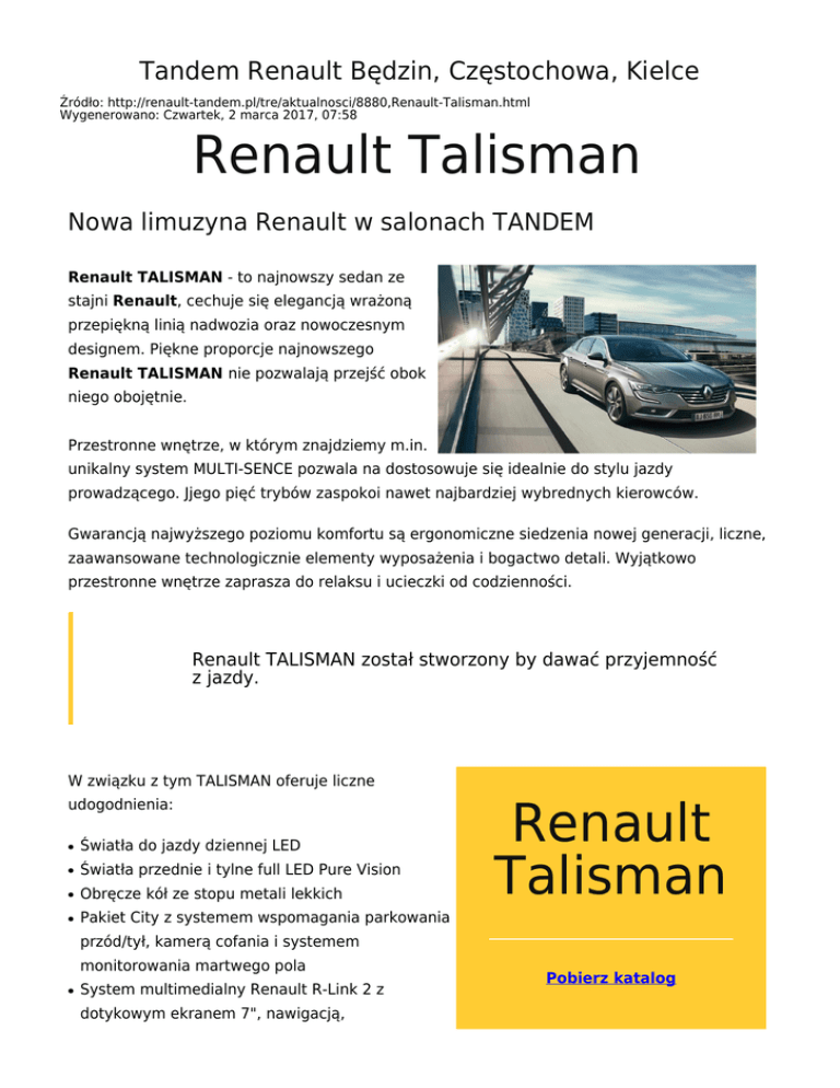Tandem Renault Będzin, Częstochowa, Kielce Źródło: http://renault-tandem.pl/tre/aktualnosci/8880,Renault-Talisman.html Wygenerowano: Czwartek, 2 marca 2017, 07:58 Renault Talisman Nowa limuzyna Renault w salonach TANDEM Renault TALISMAN - to najnowszy sedan ze stajni Renault, cechuje się elegancją wrażoną przepiękną linią nadwozia oraz nowoczesnym designem. Piękne proporcje najnowszego Renault TALISMAN nie pozwalają przejść obok niego obojętnie. Przestronne wnętrze, w którym znajdziemy m.in. unikalny system MULTI-SENCE pozwala na dostosowuje się idealnie do stylu jazdy prowadzącego. Jjego pięć trybów zaspokoi nawet najbardziej wybrednych kierowców. Gwarancją najwyższego poziomu komfortu są ergonomiczne siedzenia nowej generacji, liczne, zaawansowane technologicznie elementy wyposażenia i bogactwo detali. Wyjątkowo przestronne wnętrze zaprasza do relaksu i ucieczki od codzienności. Renault TALISMAN został stworzony by dawać przyjemność z jazdy. W związku z tym TALISMAN oferuje liczne udogodnienia: ● Światła do jazdy dziennej LED ● Światła przednie i tylne full LED Pure Vision ● Obręcze kół ze stopu metali lekkich ● Pakiet City z systemem wspomagania parkowania Renault Talisman przód/tył, kamerą cofania i systemem monitorowania martwego pola ● System multimedialny Renault R-Link 2 z dotykowym ekranem 7", nawigacją, Pobierz katalog nagłośnieniem 3D by Arkamys, złączem USB i jack oraz dostępem do usług on-line ● Automatyczna klimatyzacja dwustrefowa ● Czujnik światła i deszczu ● Światła przeciwmgłowe ● Karta Renault Hands Free ● 6 poduszek powietrznych ● System dynamicznej kontroli toru jazdy ESP ● System wspomagania ruszania pod górę ● System kontroli ciśnienia w oponach ● Regulator - ogranicznik prędkości ● Automatyczny hamulec postojowy, elektromechaniczny ● Szyby przednie i tylne regulowane elektrycznie, włącznik impulsowy po stronie kierowcy i pasażera z przodu ● Lusterka boczne regulowane i składane elektrycznie ● Fotele przednie z regulacją wysokości i części lędźwiowej, fotel kierowcy z funkcją masażu w części lędźwiowej ● Tylna kanapa składana w układzie 1/3-2/3, z otworem do przewożenia nart ● Skórzana kierownica z regulacją wysokości i głębokość