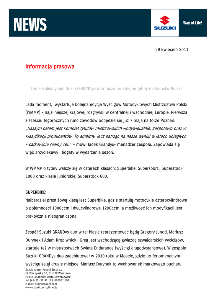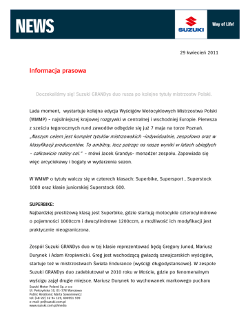 29 kwiecień 2011 Informacja prasowa Doczekaliśmy się! Suzuki GRANDys duo rusza po kolejne tytuły mistrzostw Polski. Lada moment, wystartuje kolejna edycja Wyścigów Motocyklowych Mistrzostwa Polski (WMMP) - najsilniejszej krajowej rozgrywki w centralnej i wschodniej Europie. Pierwsza z sześciu tegorocznych rund zawodów odbędzie się już 7 maja na torze Poznań. „Naszym celem jest komplet tytułów mistrzowskich –indywidualnie, zespołowo oraz w klasyfikacji producentów. To ambitny, lecz patrząc na nasze wyniki w latach ubiegłych - całkowicie realny cel.” - mówi Jacek Grandys- menadżer zespołu. Zapowiada się więc arcyciekawy i bogaty w wydarzenia sezon. W WMMP o tytuły walczy się w czterech klasach: Superbike, Supersport , Superstock 1000 oraz klasie juniorskiej Superstock 600. SUPERBIKE: Najbardziej prestiżową klasą jest Superbike, gdzie startują motocykle czterocylindrowe o pojemności 1000ccm i dwucylindrowe 1200ccm, a możliwość ich modyfikacji jest praktycznie nieograniczona. Zespół Suzuki GRANDys duo w tej klasie reprezentować będą Gregory Junod, Mariusz Durynek i Adam Kropiwnicki. Greg jest wschodzącą gwiazdą szwajcarskich wyścigów, startuje też w mistrzostwach Świata Endurance (wyścigi długodystansowe). W zespole Suzuki GRANDys duo zadebiutował w 2010 roku w Moście, gdzie po fenomenalnym wyścigu zajął drugie miejsce. Mariusz Durynek to wychowanek markowego pucharu Suzuki Motor Poland Sp. z o.o Ul. Połczyńska 10, 01-378 Warszawa Public Relations: Marta Sawoniewicz tel: (48-22) 32 94 129, 600951 599 e-mail: [email protected] www.suzuki.com.pl/media Suzuki GSX-R, ma też na koncie sukcesy w Pucharze Polski i teraz pod opieką najlepszego teamu w kraju chce walczyć o najlepsze miejsca w klasyfikacji Superbike. Adam Kropiwnicki to były Mistrz Polski. SUPERSTOCK 1000: Kolejną klasą „litrowych” motocykli jest Superstock 1000, gdzie przeróbki motocykli ograniczone są do minimum. Swoista grupa N. Tu liderem zespołu będzie Andy Meklau, aktualny Mistrz Polski i Austrii. Andy to żywa legenda wyścigów motocyklowych, zdobywca niezliczonych tytułów w Austrii, Niemczech, Polsce oraz Alpe Adria. Ma też na swoim koncie wygrane w mistrzostwach Świata Superbike. Oprócz startów w klasie Superstock 1000 w wybranych rundach wystąpi też w klasie Superbike. Partnerem Austriaka w zespole SGD będzie Sławek Janus, kolejny wychowanek Suzuki GSX-R Cup. SUPERSPORT i SUPERSTOCK 600 W klasie Supersport (motocykle o pojemności 600ccm) o tytuły walczyć będą Daniel Bukowski i Kuba Wróblewski. Jakub, jako junior zdobywać też będzie punkty w Młodzieżowych Mistrzostwach Polski Junior Superstock 600, klasie przeznaczonej dla młodych polskich zawodników na motocyklach o minimalnej ilości przeróbek. Wróblewski jest wicemistrzem tej rywalizacji z sezonu 2010 i teraz na motocyklu Suzuki myśli o tytule. Swój pierwszy sezon na Suzuki zaliczy też faworyt do tytułu w Supersport, Daniel Bukowski. Dotychczas dosiadając motocykla Yamaha musiał zadowalać się, co najwyżej drugimi miejscami. Testowym zawodnikiem Suzuki GRANDys duo, pełniącym też rolę rezerwowego jest Mariusz Grandys, były Mistrz Polski Superbike. Rywalizacja o tytuły mistrzowskie z roku na rok stają się coraz bardziej międzynarodowe. W tym sezonie trzy rundy złożone z dwóch wyścigów: soboty i niedzieli odbędą się w Polsce na torze Poznań. Trzy pozostałe rundy mistrzostw Polski Suzuki Motor Poland Sp. z o.o Ul. Połczyńska 10, 01-378 Warszawa Public Relations: Marta Sawoniewicz tel: (48-22) 32 94 129, 600951 599 e-mail: [email protected] www.suzuki.com.pl/media rozgrywane będą wspólnie z eliminacjami do finału mistrzostw Europy - cyklem Alpe Adria na zagranicznych torach: Brnie, Slovakiaring oraz w Moście. Dzięki temu na starcie staną zawodnicy ze wszystkich krajów Europy centralnej. KALENDARZ WMMP 2011: Runda I Tor Poznań ( Polska) 7 – 8 maja 2011 Runda II Tor Brno ( Czechy) 21-22 maja 2011 Runda III Tor Slovakiaring ( Słowacja) 18-19 czerwca 2011 Runda IV Tor Most ( Czechy) 23-24 lipca 2011 Runda V Tor Poznań ( Polska) 6-7 sierpnia 2011 Runda VI Tor Poznań ( Polska) 3-4 września 2011 W poprzednich sezonach zawodnicy zespołu Suzuki GRANDys duo pokazywali, iż woli walki, ambicji i sportowej pasji im nie brakuje. Na stałe w Polskich zespołach startują doskonali zawodnicy z Austrii, Francji czy Szwajcarii. W jego barwach oprócz Polaków sukcesy odnosili tacy zawodnicy jak Andy Meklau (Austria, Mistrz Polski Superbike 2009, Superstock 1000 2010), Greg Junod (Szwajcaria), Sebastien Le Grelle (Belgia), Kenny Foray (Francja, Mistrz Polski Superstock 600 2009), Gwen Giabbani (Francja, Mistrz Polski Superstock 1000 2009, Wicemistrz Polski Superbike 2010), Marko Jerman (Słowenia, Mistrz Polski Supersport 2010), Guillaume Dietrich (Francja). Wśród mechaników znajdują się też Francuz, Szwajcar, Węgier i Niemiec. Istna wieża Babel, która stanowi doskonały kolektyw. Po zbliżającym się sezonie możemy oczekiwać , iż kolejne wyścigi będą przynosiły jeszcze większe emocje, niż w latach ubiegłych. Od dekady Zespół SGD wygrywa tytuły w klasyfikacji generalnej, a przez ostatnie sezony praktycznie wszystkie trofea w klasyfikacjach indywidualnych . Tegoroczne sportowe zmagania na pewno będą bardzo interesujące. Serdecznie zapraszamy! http://www.suzuki.pl/media/moto Suzuki Motor Poland Sp. z o.o Ul. Połczyńska 10, 01-378 Warszawa Public Relations: Marta Sawoniewicz tel: (48-22) 32 94 129, 600951 599 e-mail: [email protected] www.suzuki.com.pl/media