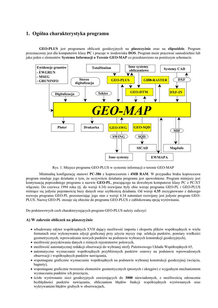 1. Ogólna charakterystyka programu GEO-PLUS jest programem obliczeń geodezyjnych na płaszczyźnie oraz na elipsoidzie. Program przeznaczony jest dla komputerów klasy PC i pracuje w środowisku DOS. Program może pracować samodzielnie lub jako jeden z elementów Systemu Informacji o Terenie GEO-MAP co przedstawiono na poniższym schemacie. Ewidencje gruntów - EWGRUN - MSEG - GRUNINFO Inne systemy obliczeniowe TotalStation Stereo digitalizacja GEO-PLUS DXF GEO-RASTER GEO-DTM Szkice Digitalizacja Systemy CAD DXF-IN GEO-MAP Ploter Drukarka GEO-SWG GEO-SQD SWING SQD MIF SICAD Inne systemy MapInfo EWMAPA Rys. 1. Miejsce programu GEO-PLUS w systemie informacji o terenie GEO-MAP Minimalną konfigurację stanowi PC-386 z koprocesorem i 4MB RAM. W przypadku braku koprocesora program emuluje jego działanie z tym, że oczywiście działania programu jest spowolnione. Program niniejszy jest kontynuacją poprzedniego programu o nazwie GEO-PL, pracującego na dowolnym komputerze klasy PC z PC/XT włącznie. Do czerwca 1994 roku (tj. do wersji 4.34) rozwijane były obie wersje programu GEO-PL i GEO-PLUS różniące się jedynie pojemnością bazy danych oraz szybkością działania. Od wersji 4.35 zrezygnowano z dalszego rozwoju programu GEO-PL pozostawiając jego stan z wersji 4.34 natomiast rozwijany jest jedynie program GEOPLUS. Nazwę GEO-PL stosuje się obecnie do programu GEO-PLUS z zablokowaną opcją wyrównania. Do podstawowych cech charakteryzujących program GEO-PLUS należy zaliczyć: A) W zakresie obliczeń na płaszczyźnie • wbudowany edytor współrzędnych XYH dający możliwość importu i eksportu plików współrzędnych w wielu formatach oraz wykonywania edycji graficznej przy użyciu myszy (np. selekcja punktów, pomiary wielkości geometrycznych, wprowadzanie nowych punktów na podstawie wybranych konstrukcji geodezyjnych), • możliwość pozyskiwania danych z różnych rejestratorów polowych, • możliwość automatycznej redukcji obserwacji do wybranej strefy Państwowego Układu Współrzędnych 65, • automatyczne wyznaczanie współrzędnych przybliżonych punktów osnowy na podstawie wprowadzonych obserwacji i współrzędnych punktów nawiązania, • wspomagane graficznie wyznaczanie współrzędnych na podstawie wybranej konstrukcji geodezyjnej (wcięcia, bagnety), • wspomagane graficznie tworzenie elementów geometrycznych (prostych i okręgów) z wygodnym mechanizmem wyznaczania punktów ich przecięcia, • ścisłe wyrównanie sieci geodezyjnych zawierających do 3000 niewiadomych, z możliwością odrzucenia bezbłędności punktów nawiązania, obliczaniem błędów funkcji współrzędnych wyrównanych oraz wykrywaniem błędów grubych w obserwacjach, 4 Program obliczeń geodezyjnych GEO-PLUS ver. 5.00 • wspomagane graficznie obliczanie współrzędnych szczegółów terenowych z metody domiarów prostokątnych, • wspomagane graficzne obliczanie współrzędnych szczegółów terenowych z pomiarów tachimetrycznych na podstawie danych zapisanych w klasycznym dzienniku pomiarowym lub na różnych rejestratorach polowych. Istnieje możliwość opracowania pomiarów z kodowaniem terenowym oraz tworzenia z pliku tachimetrycznego pomiarów odnoszących się do mierzonych w trakcie pomiaru tachimetrycznego punktów osnowy (jeśli została zastosowana taka technologia pomiaru). Na podstawie wygenerowanego pliku obserwacji mogą automatycznie zostać policzone i wyrównane współrzędne punktów osnowy. • wspomagane graficznie obliczanie elementów tyczenia dla metody biegunowej i domiarów prostokątnych, • wspomagane graficznie tworzenie i obliczanie powierzchni działek oraz wykonywanie ich podziału, • automatyczne generowanie sekcji układu 65 oraz układów lokalnych Warszawa i Poznań, • wyrównywanie powierzchni działek, • transformacja Helmerta bez limitu punktów łącznych, • możliwość przeliczenia współrzędnych na inny układ na podstawie podanych parametrów transformacji, Uwaga !!! Redukcje obserwacji do układu 1965 działają jedynie przy pracy na współrzędnych 7-cyfrowych. W przypadku współrzędnych posiadających mniej niż 7-cyfr, redukcje są pomijane. B) W zakresie obliczeń na elipsoidzie • wbudowany edytor współrzędnych BLH dający możliwość importu i eksportu plików współrzędnych geodezyjnych B L H w wielu formatach oraz wykonywania obliczeń na wybranej lub zdefiniowanej przez użytkownika elipsoidzie • edytor BLH oferuje wybór odwzorowania współrzędnych BL na współrzędne płaskie XY lub zdefiniowanie własnego odwzorowania, odwzorowanie niniejsze wykorzystywane jest do graficznej prezentacji wprowadzonych do edytora punktów (np. selekcja punktów, pomiary) jak również do tworzenia plików XY zawierających przeliczone współrzędne BL na XY, • wspomagana graficznie realizacja podstawowych zadań geodezji wyższej (wprost i odwrotne) oraz innych obliczeń związanych z przenoszeniem współrzędnych na elipsoidzie, Program obliczeń geodezyjnych GEO-PLUS ver. 5.00 5 2. Instalacja programu Dyskietka dystrybucyjna zawiera pliki programu w postaci skompresowanej wraz z programem install.exe, który należy uruchomić w celu zainstalowania programu. Przed uruchomieniem programu instalacyjnego należy posiadany klucz zabezpieczający włożyć do dowolnego portu drukarki. Jeśli tego nie wykonamy wtedy program instalacyjny uprzedza, że dokona instalacji programu w wersji demonstracyjnej. Zalecane jest aby klucz zabezpieczający wkładać przy wyłączonym komputerze. Po uruchomieniu programu instalacyjnego musimy podać nazwy katalogów dla programu oraz dla przykładowych danych. Standardowo proponowane są nazwy katalogów GEO-MAP oraz GEO-DAT. Jeśli podane katalogi nie istnieją to zostaną utworzone przez program instalacyjny. Po podaniu w/w informacji następuje rozpakowanie poszczególnych elementów programu i na koniec zadawane jest pytanie czy utworzyć plik geo-plus.bat